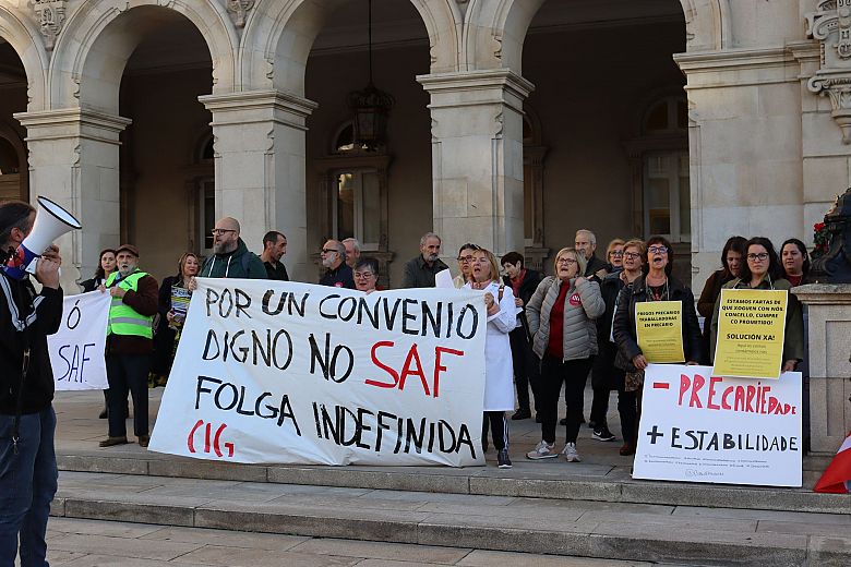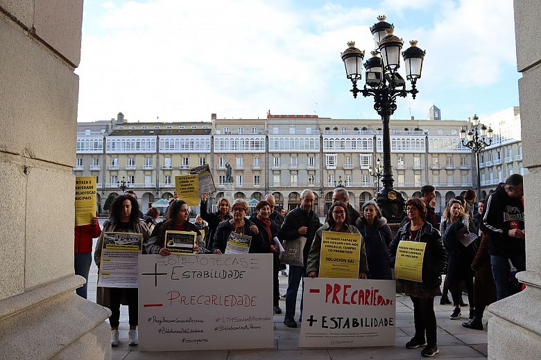 As traballadoras e os traballadores das bibliotecas municipais da Coruña que xestiona LTM Servicios Bibliotecarios volvéronse concentrar este xoves diante do Concello para denunciar os atrasos que mes a mes sofren no cobro das súas nóminas, a incerteza xerada pola baixa dotación dos pregos e a falta de solucións definitivas por parte do Goberno local. Na concentración, o persoal das bibliotecas coincidiu coas traballadoras do SAF, que están en folga indefinida por un convenio digno.