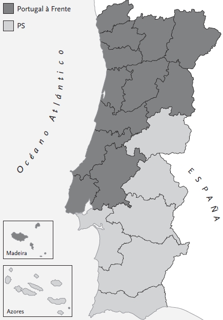 Por outra banda, o sistema de listaxes pechadas para as eleccións parlamentarias deu un tremendo poder ás direccións centralizadas de todos os partidos políticos, bloqueando calquera identificación especial entre os votantes e os candidatos individuais. Os estudos revelan unha conexión bastante tenue entre a clase social e as preferencias de voto; sendo pouco o que distinguía as súas políticas, unha gran parte do electorado podía alternar entre os dous bloques principais dunha elección á seguinte(27). O índice máis claro de apoio foi (e segue sendo) a división entre un norte inclinado á dereita e un sur á esquerda, que se remonta aos anos revolucionarios, se cadra o contraste electoral máis claro en calquera parte de Europa, como revela un mapa da sondaxe máis recente (figura I). Os esvaramentos ocasionais en calquera dirección cara ao PS ou o PSD escureceron ás veces esta polarización rexional, mais en xeral a continuidade é inconfundíbel.