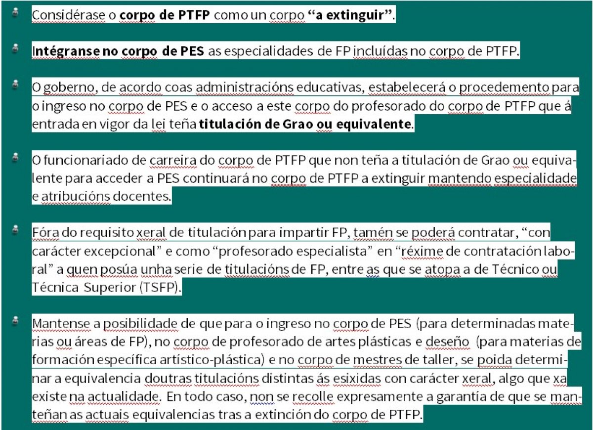 En todo caso, estamos diante dunha vella demanda do PTFP que a CIG-Ensino comparte dentro da defensa que o sindicato fixo historicamente dun CORPO ÚNICO DOCENTE. De feito esta foi unha das propostas que defendemos na negociación da LOMLOE. Con todo, e á vista de como queda a redacción desta integración, hai unha serie de cuestións que como sindicato nos preocupan e alertan e nas que faremos fincapé, tanto no seguimento da fase final de negociación no ámbito do Congreso como no desenvolvemento das normas que regulen o proceso de integración.