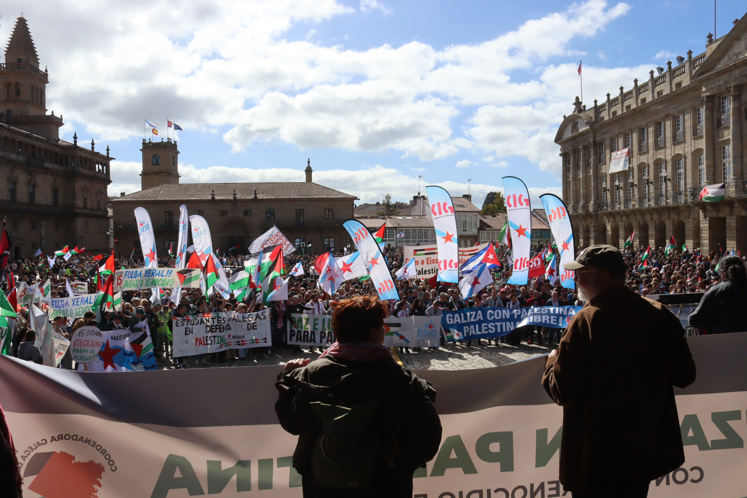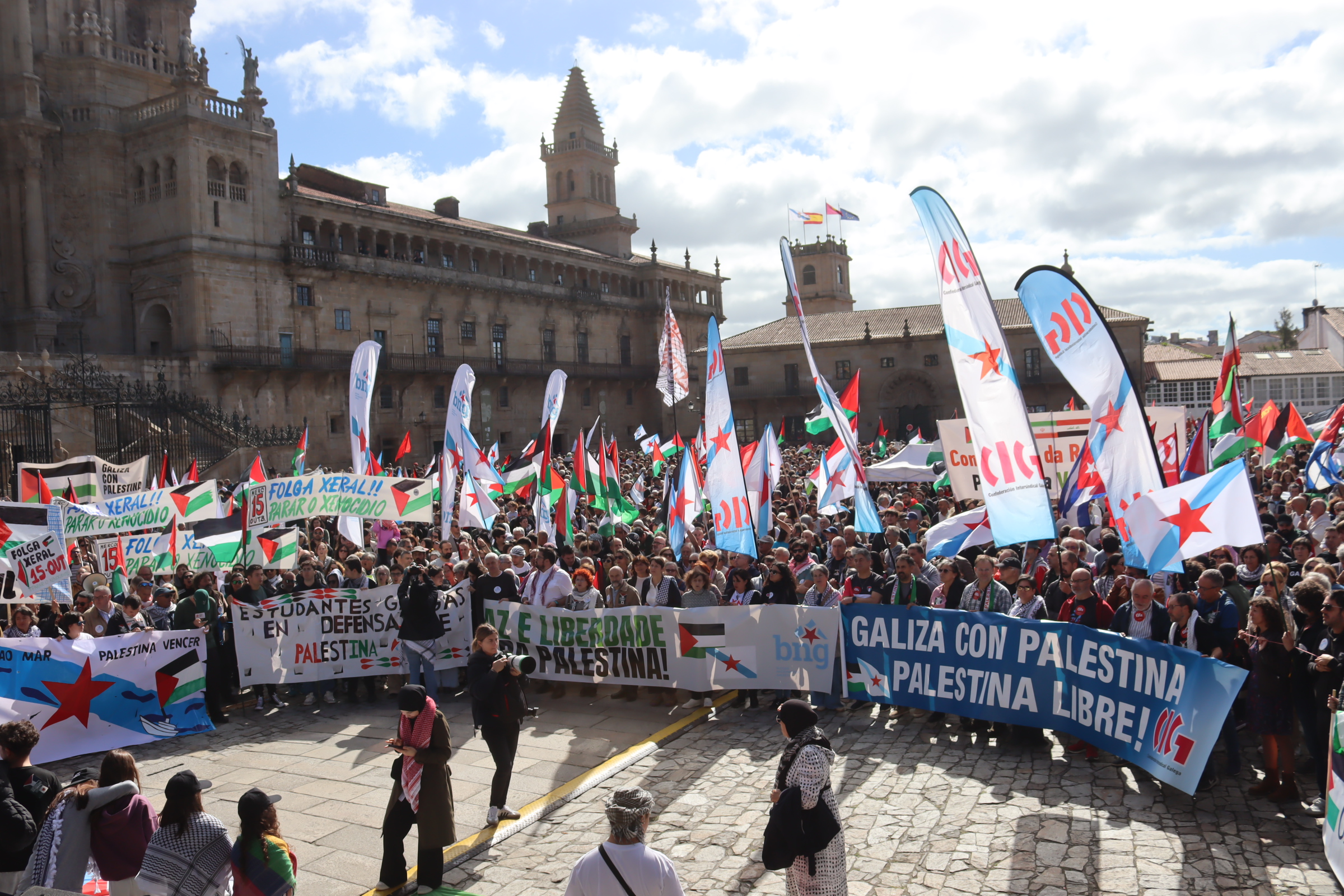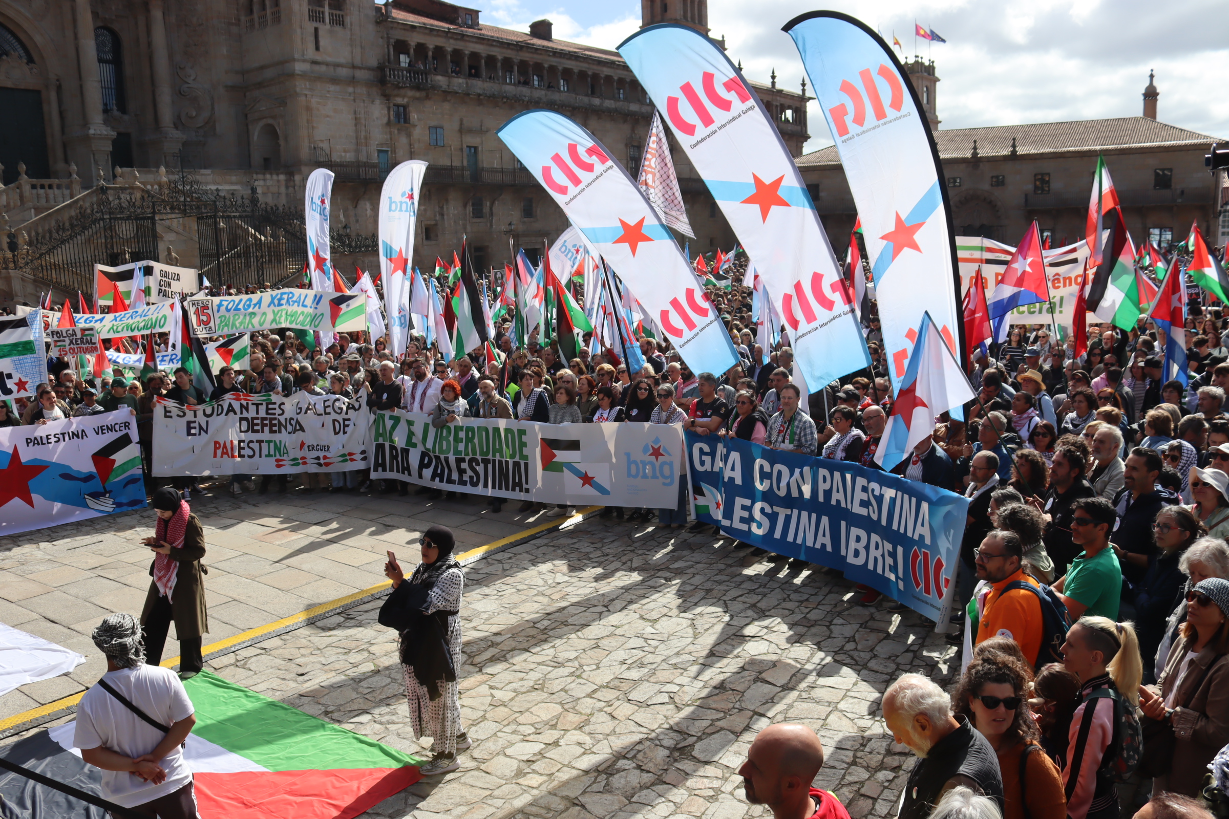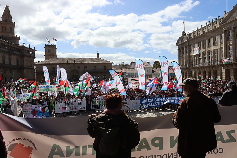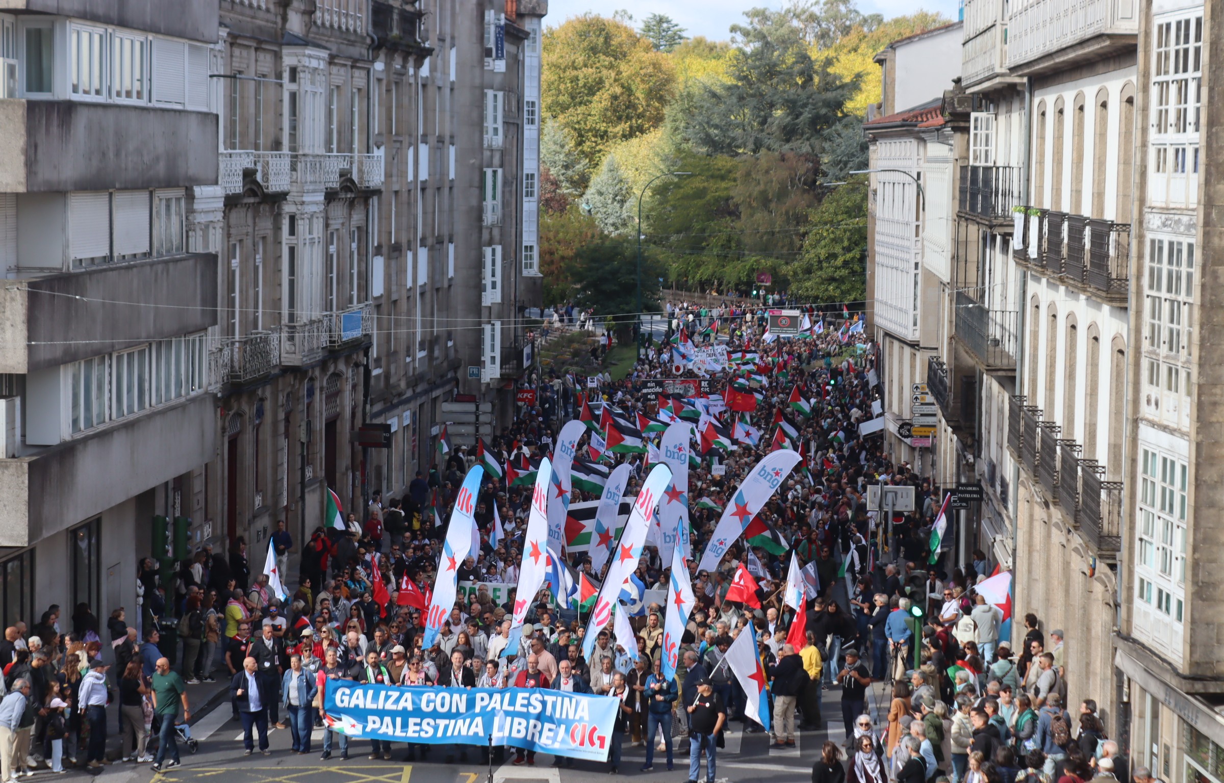 Máis de 80.000 persoas tomaron hoxe as rúas de Santiago de Compostela para rexeitar o xenocidio e a ocupación de Palestina nunha xornada na que o pobo galego protagonizou a manifestación solidaria máis numerosa en apoio da causa palestina da historia do noso país. A manifestación, convocada pola Coordinadora Galega de Solidariedade coa Palestina baixo o lema 'Galiza con Palestina, 2 anos de xenocidio, 77 de ocupación', rematou nunha praza do Obradoiro totalmente ateigada ao berro de “Dende o río até o mar, Palestina vencerá”, “O terrorismo é o sionismo” ou “Netanyahu asasino”.