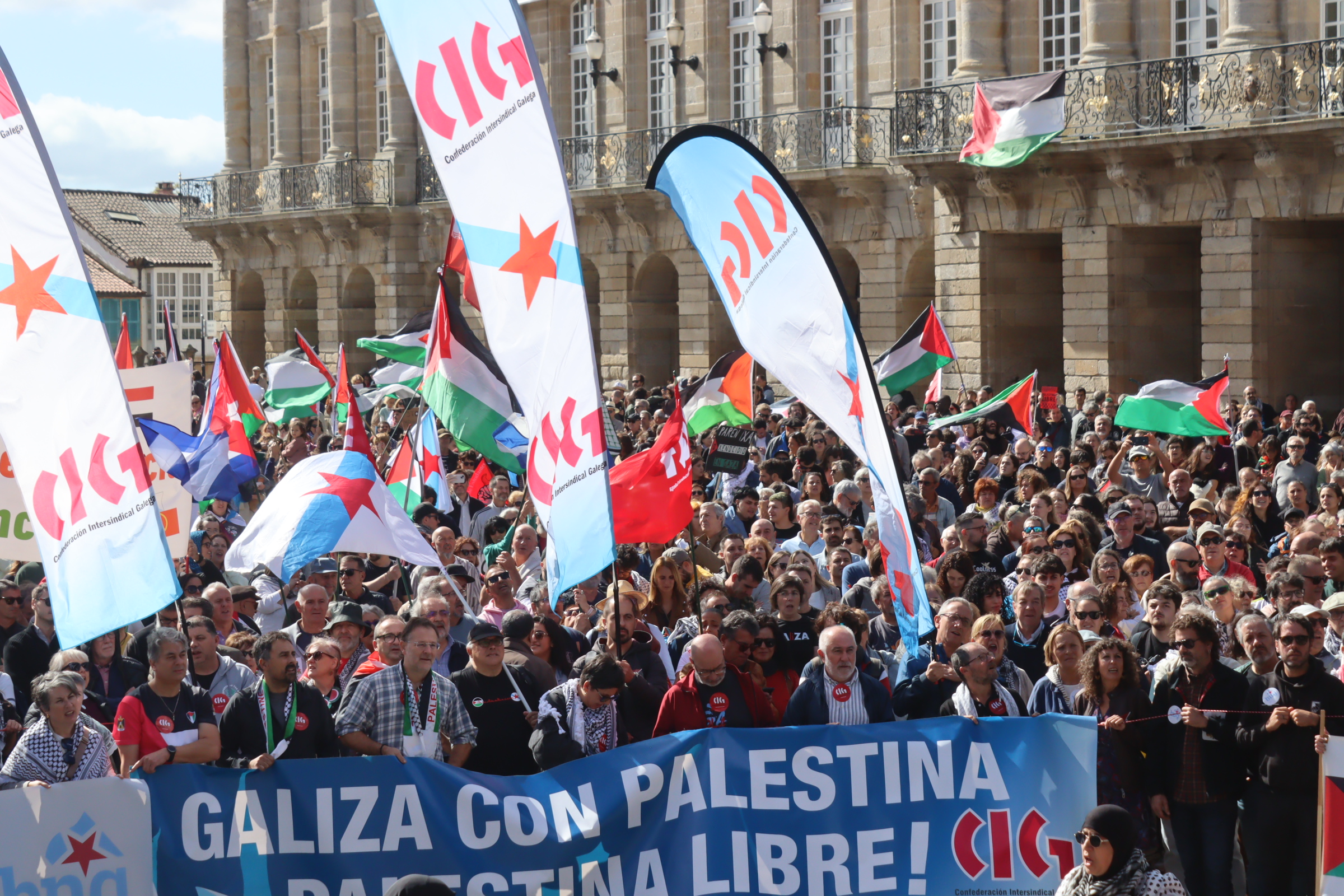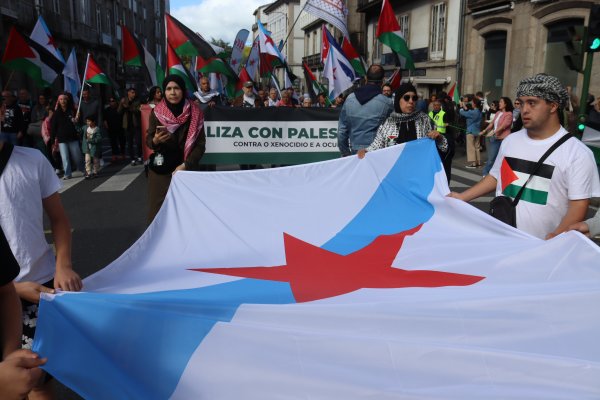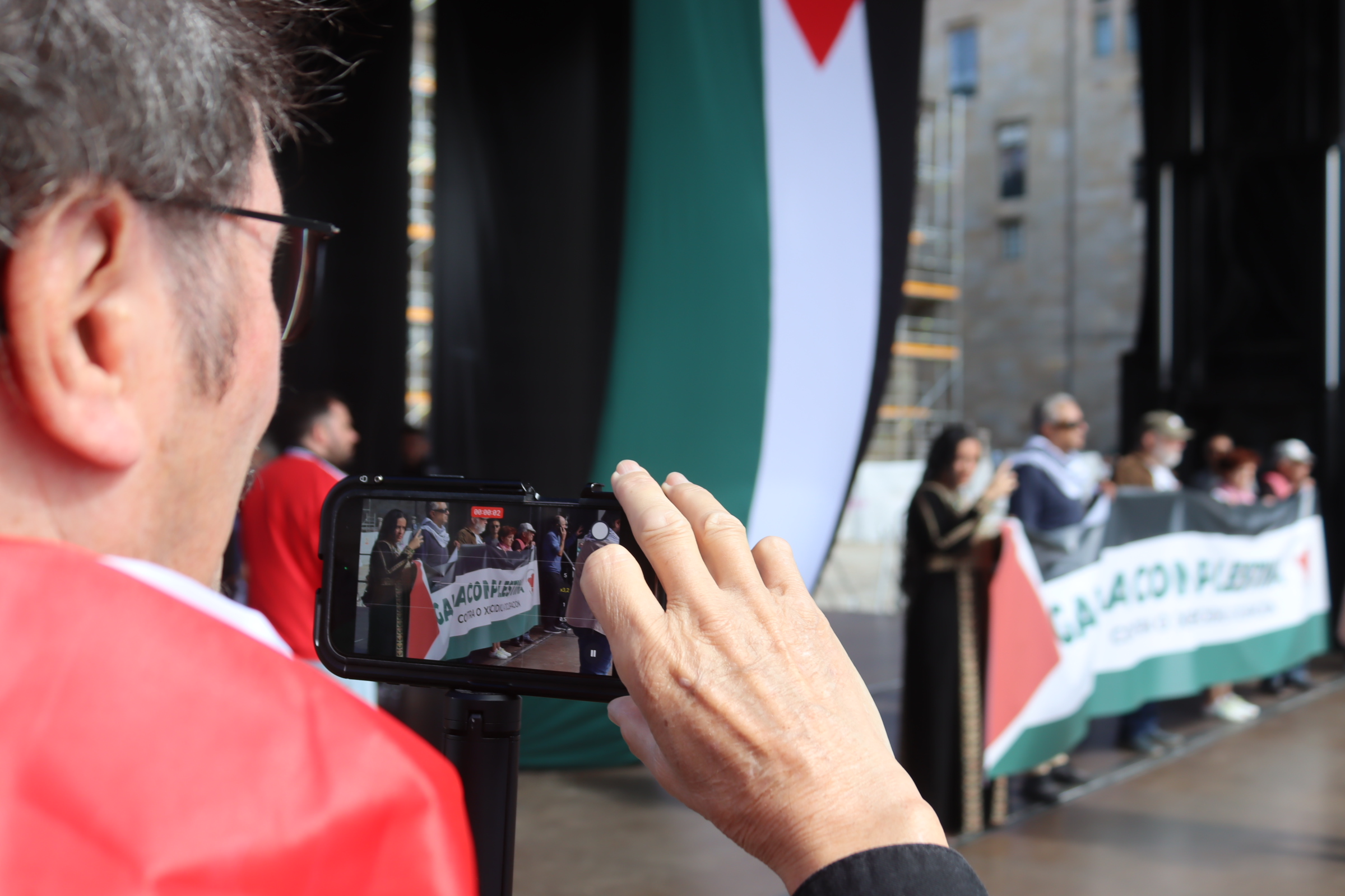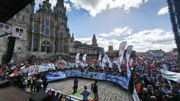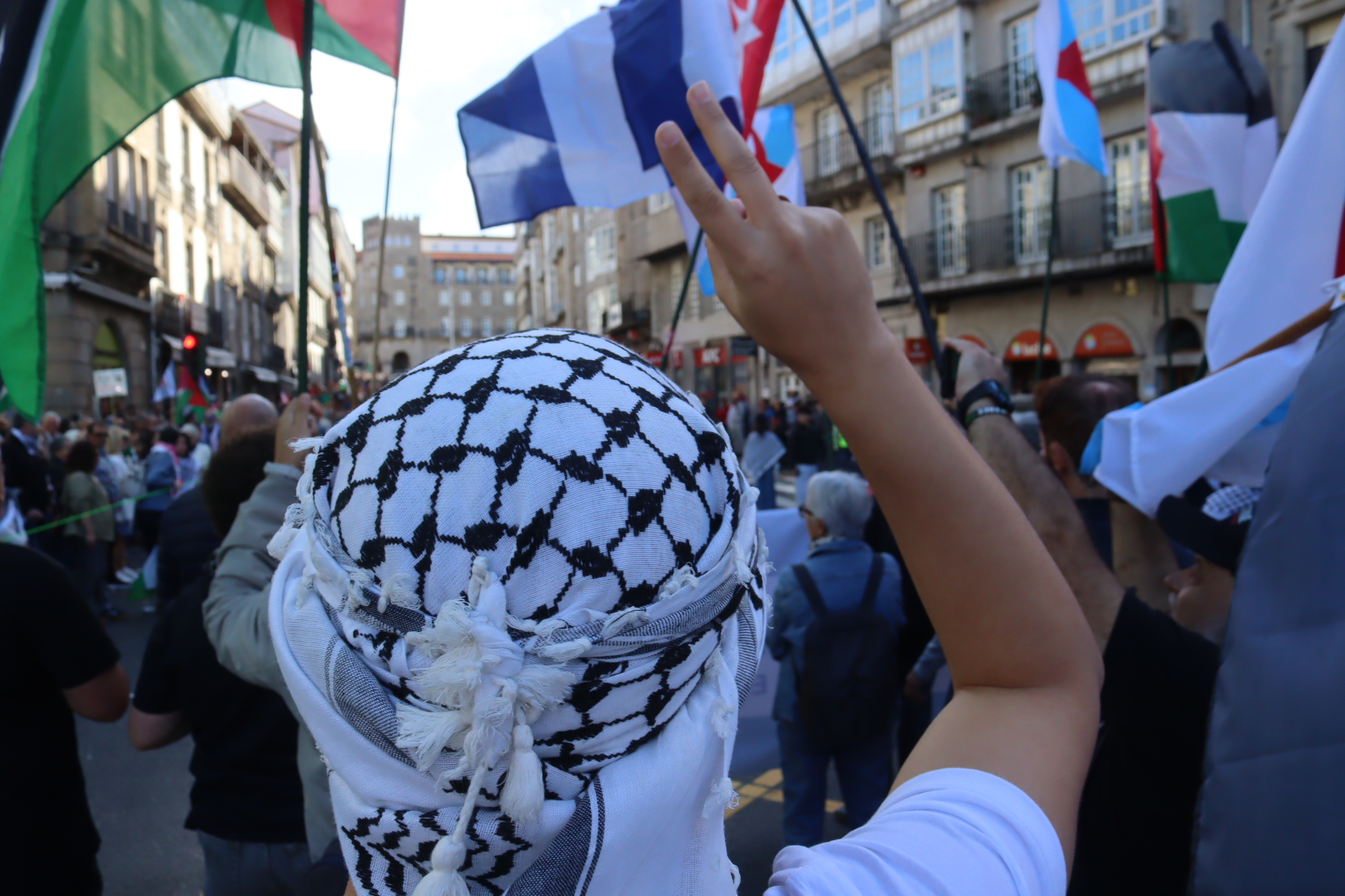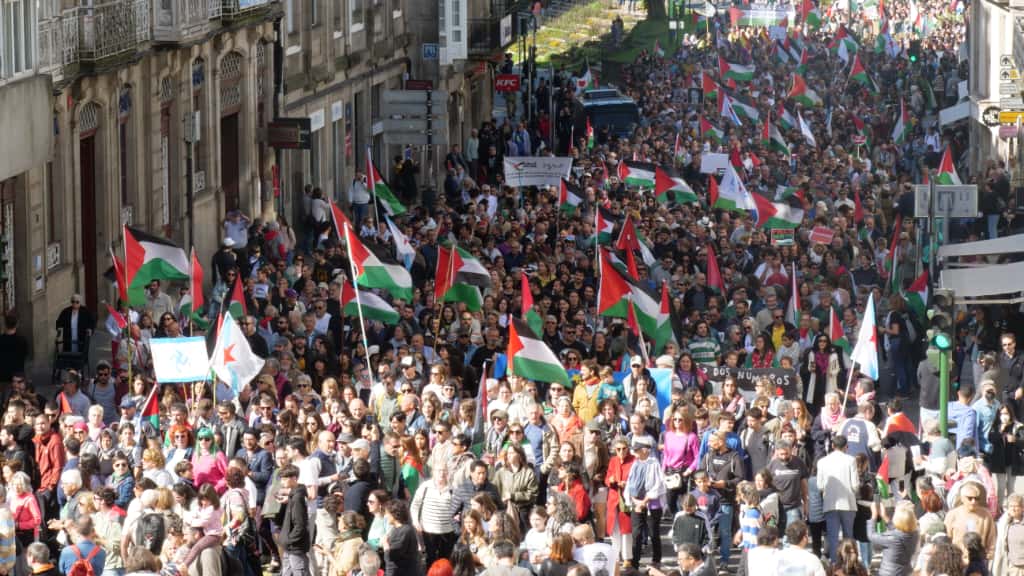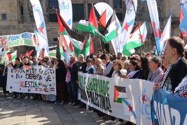Máis de 80.000 persoas tomaron hoxe as rúas de Santiago de Compostela para rexeitar o xenocidio e a ocupación de Palestina nunha xornada na que o pobo galego protagonizou a manifestación solidaria máis numerosa en apoio da causa palestina da historia do noso país. A manifestación, convocada pola Coordinadora Galega de Solidariedade coa Palestina baixo o lema 'Galiza con Palestina, 2 anos de xenocidio, 77 de ocupación', rematou nunha praza do Obradoiro totalmente ateigada ao berro de “Dende o río até o mar, Palestina vencerá”, “O terrorismo é o sionismo” ou “Netanyahu asasino”.