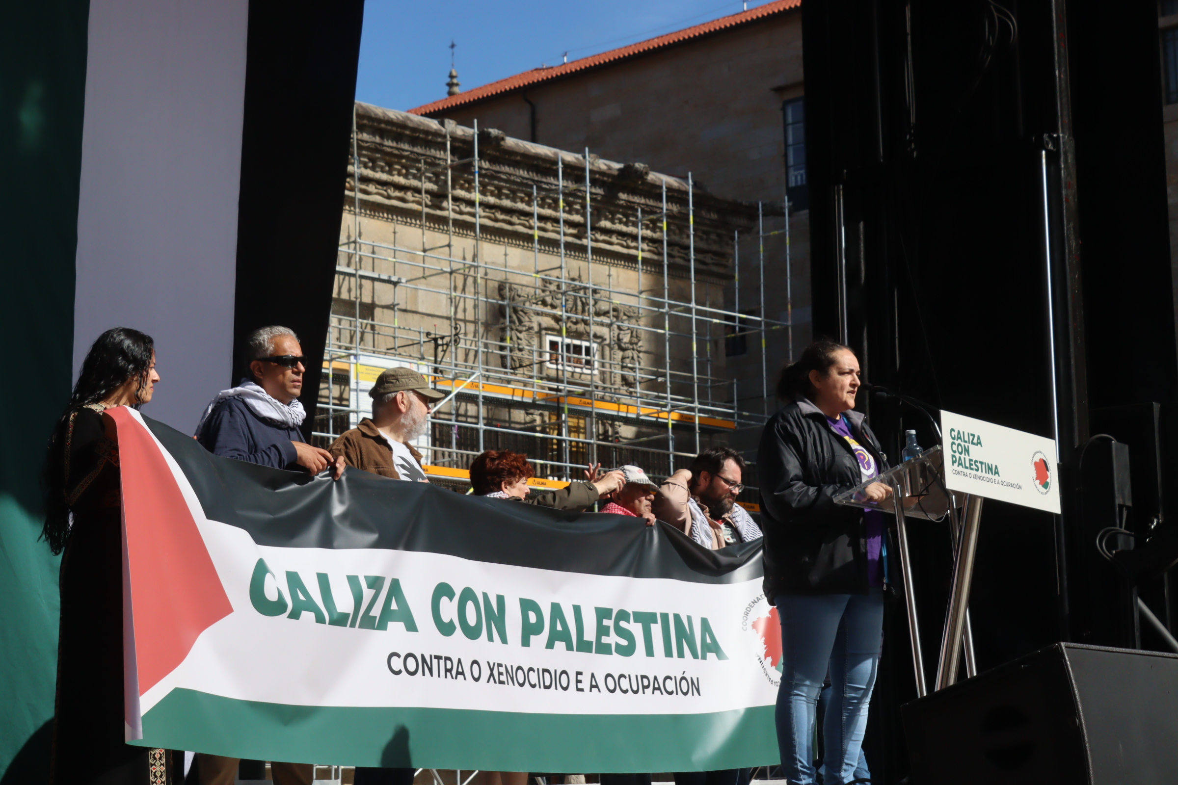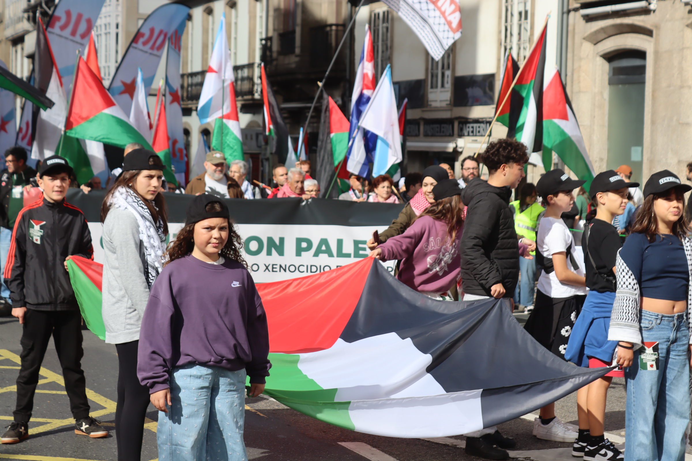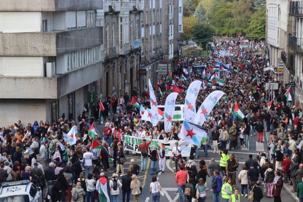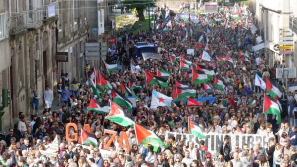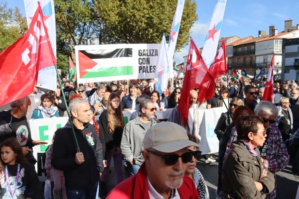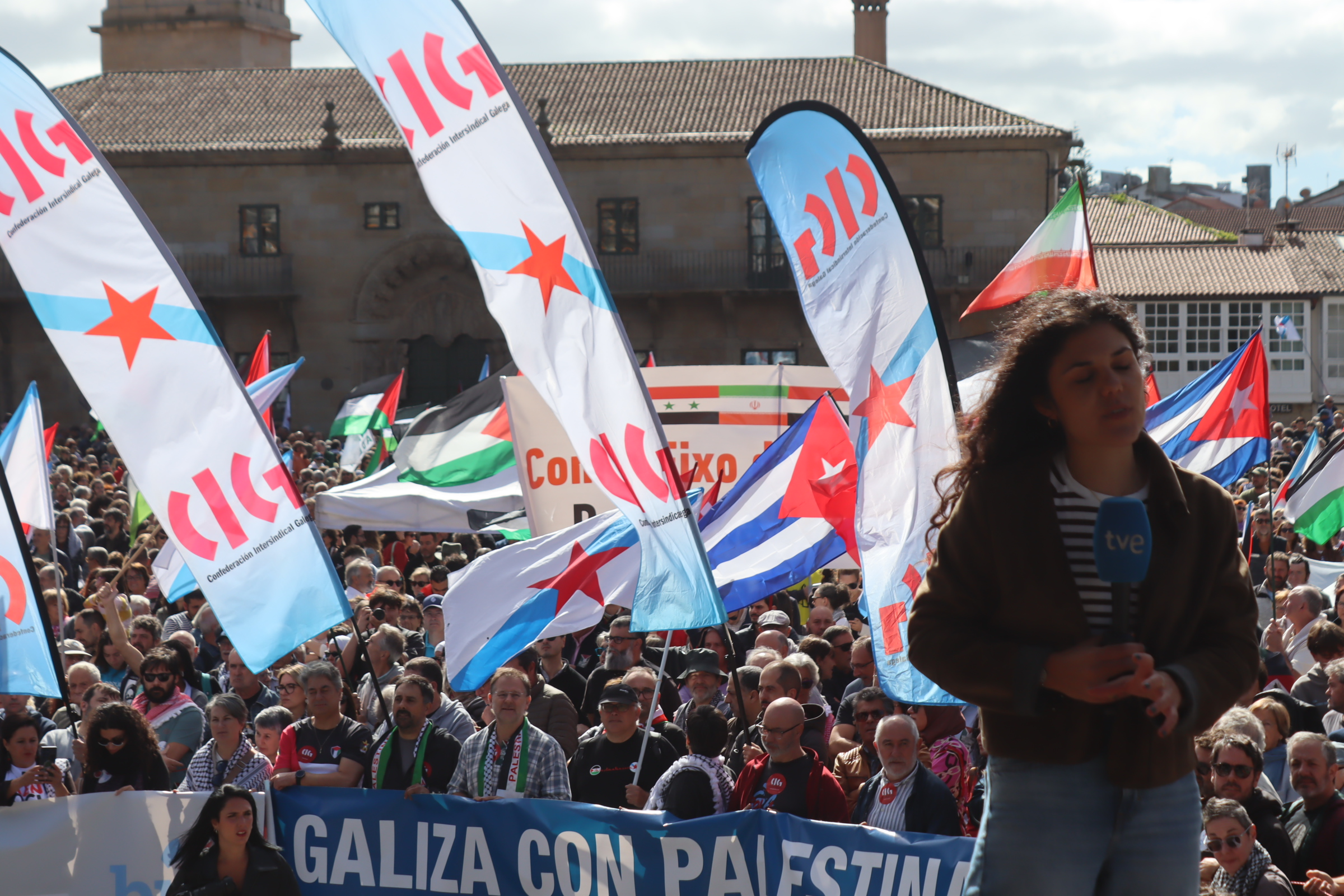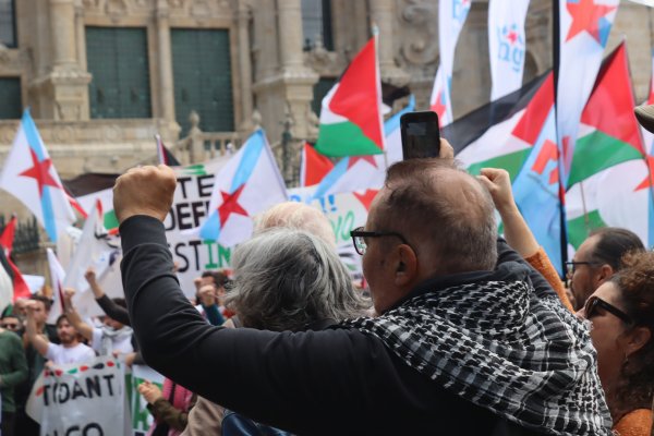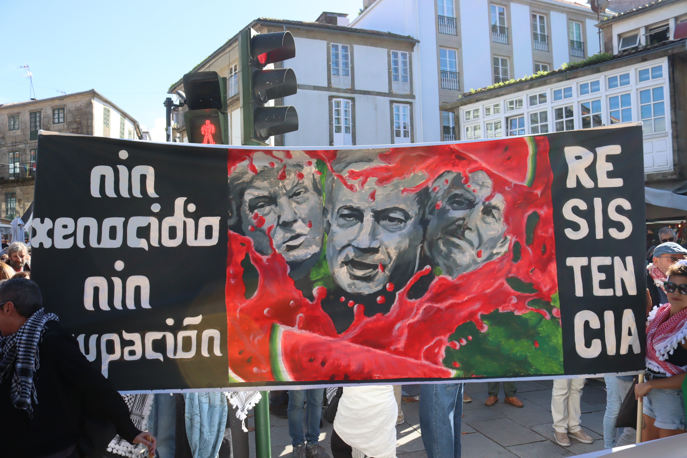 Máis de 80.000 persoas tomaron hoxe as rúas de Santiago de Compostela para rexeitar o xenocidio e a ocupación de Palestina nunha xornada na que o pobo galego protagonizou a manifestación solidaria máis numerosa en apoio da causa palestina da historia do noso país. A manifestación, convocada pola Coordinadora Galega de Solidariedade coa Palestina baixo o lema 'Galiza con Palestina, 2 anos de xenocidio, 77 de ocupación', rematou nunha praza do Obradoiro totalmente ateigada ao berro de “Dende o río até o mar, Palestina vencerá”, “O terrorismo é o sionismo” ou “Netanyahu asasino”.