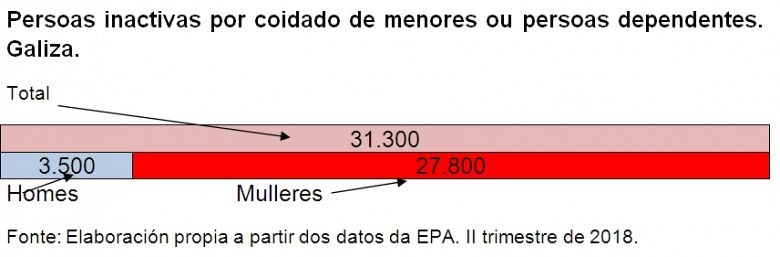 A primeiros de 2018, 31.300 persoas declaran, en Galiza, permanecer inactivas por dedicar a seu tempo ao coidado de menores ou persoas dependentes; delas, o 87% son mulleres.