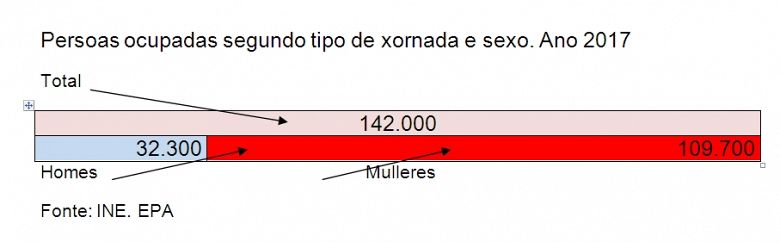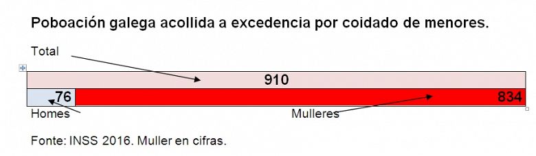 Os datos oficiais así o confirman. De feito son mulleres o 87% das persoas inactivas por coidado de menores ou persoas dependentes en Galiza; o 77% das persoas traballadoras con redución de xornada por coidado de menores de 12 anos; o 91,6% das persoas que se acolleron a unha excedencia por coidado de fillos/as; o 71,2% de quen reduciron ou suprimiron o traballo remunerado por coidado de dependentes; o 56,8% das persoas que utilizaron a flexibilización. Son tamén mulleres o 76,7% das persoas ocupadas a tempo parcial e as que padecen a dupla xornada laboral. De feito, mentres elas dedican 4:38 horas ao día, de media ao traballo dentro do fogar, os homes só dedican 2:21.