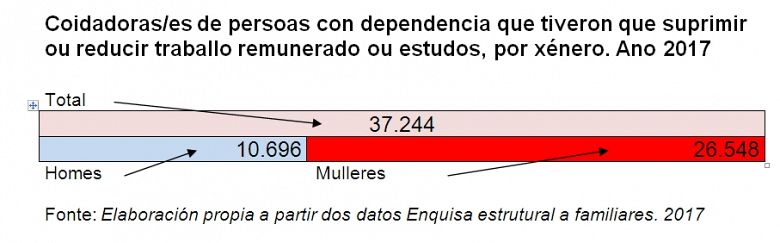 No caso de atención á dependencia, tamén son as mulleres –maioritariamente- as que se sacrifican no eido laboral. No ano 2017, 37.244 persoas traballadoras en Galiza suprimiron ou reduciron traballo remunerado, das cales o 71,2% foron mulleres.