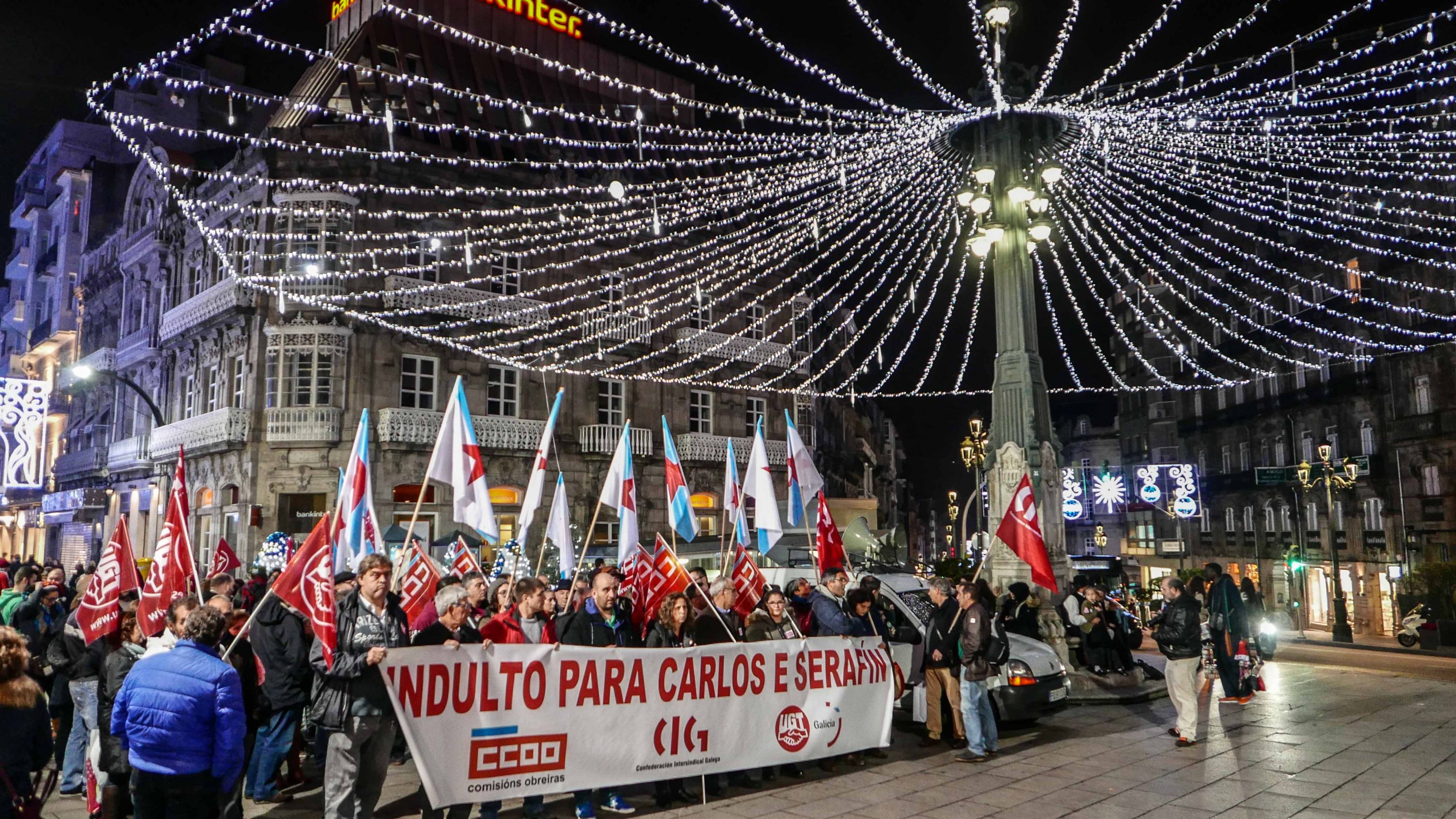 As centrais sindicais CIG, CCOO e UGT desenvolveron este xoves unha nova mobilización para reclamar o indulto a Carlos Rivas e Serafín Rodríguez, os dous traballadores vigueses condenados a tres anos de cadea por participar na folga do transporte de 2008.