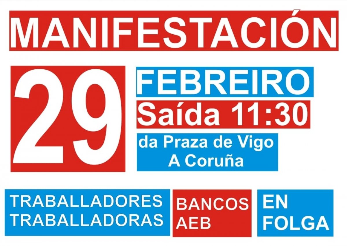 O próximo xoves, 29 de febreiro, as traballadoras e traballadores dos bancos AEB (Santander, BBVA, Sabadell, Bankinter, Deutsche Bank…) están chamados a secundar unha xornada de folga para reivindicar un convenio digno. A folga está convocada polas centrais sindicais CIG, ELA, SEC (BBVA) e Intersindical-CSC e, no caso de Galiza, a mobilización central será na Coruña cunha manifestación que sairá ás 11:30h, da Praza de Vigo.