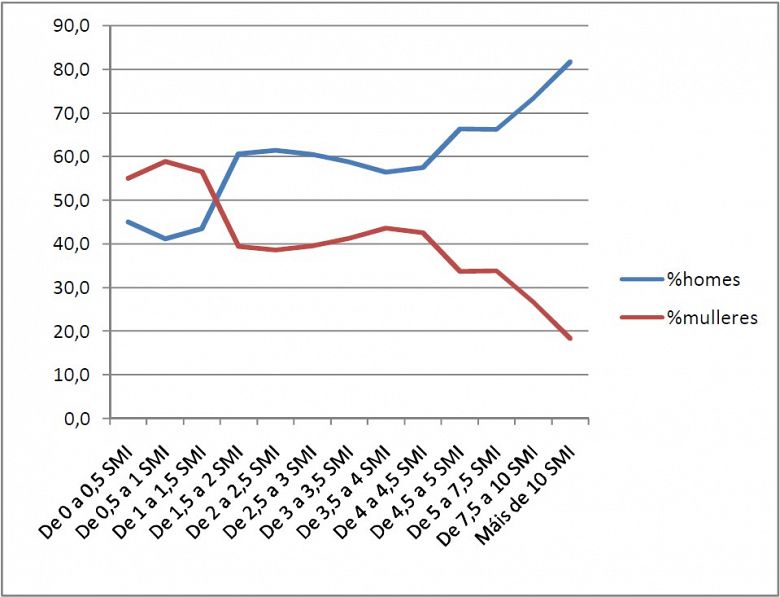 *O gráfico é moi ilustrativo: ata ingresos inferiores a 1,5 veces o SMI, o peso das mulleres é moi superior; de media hai un 15% máis de mulleres que de homes. A partir deste intervalo de ingresos, a porcentaxe de homes supera amplamente a de mulleres (de media 20 puntos), ata xa no tramo superior –máis de 10 veces o SMI-, en que a diferenza é de 60 puntos porcentuais.