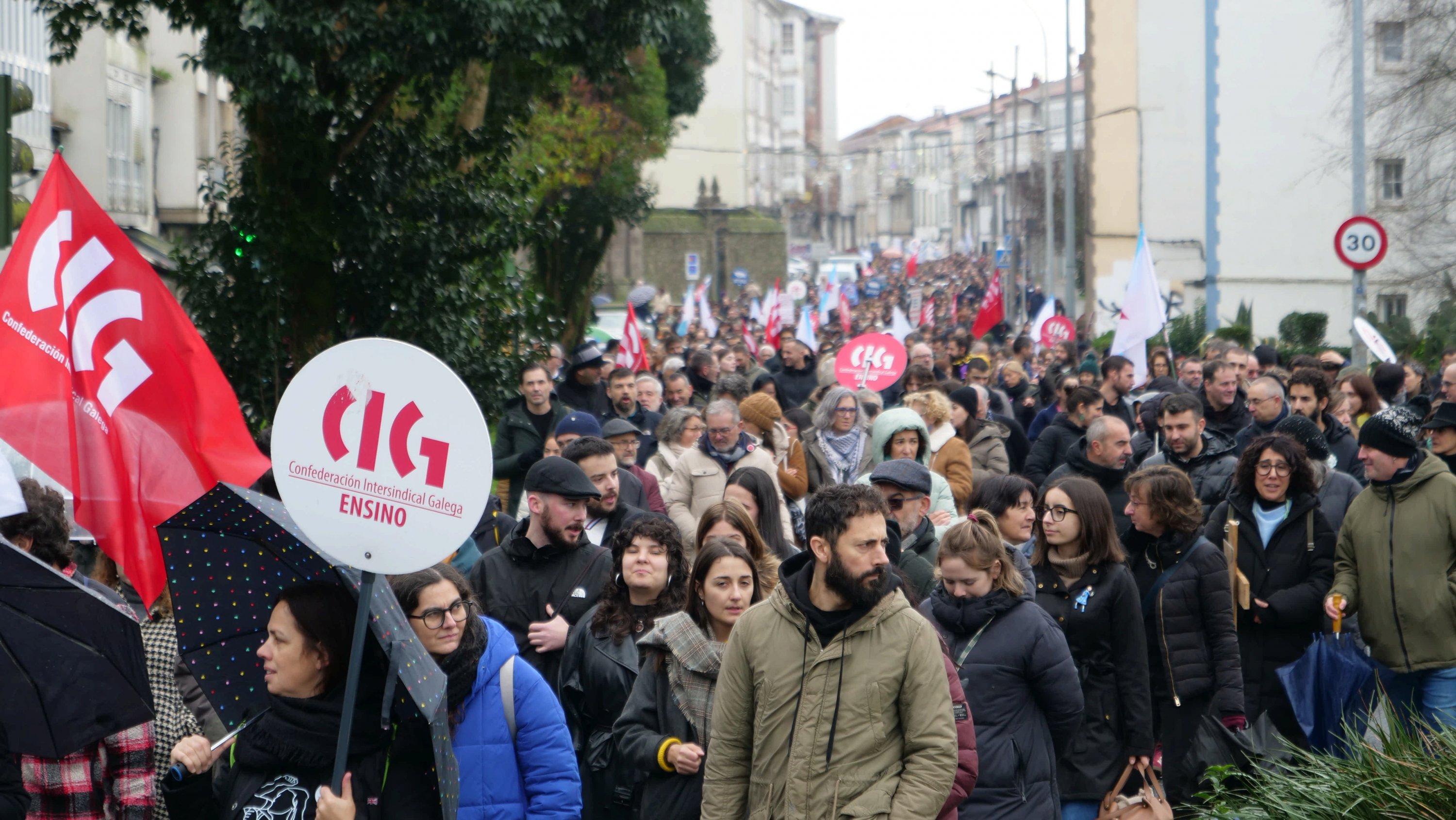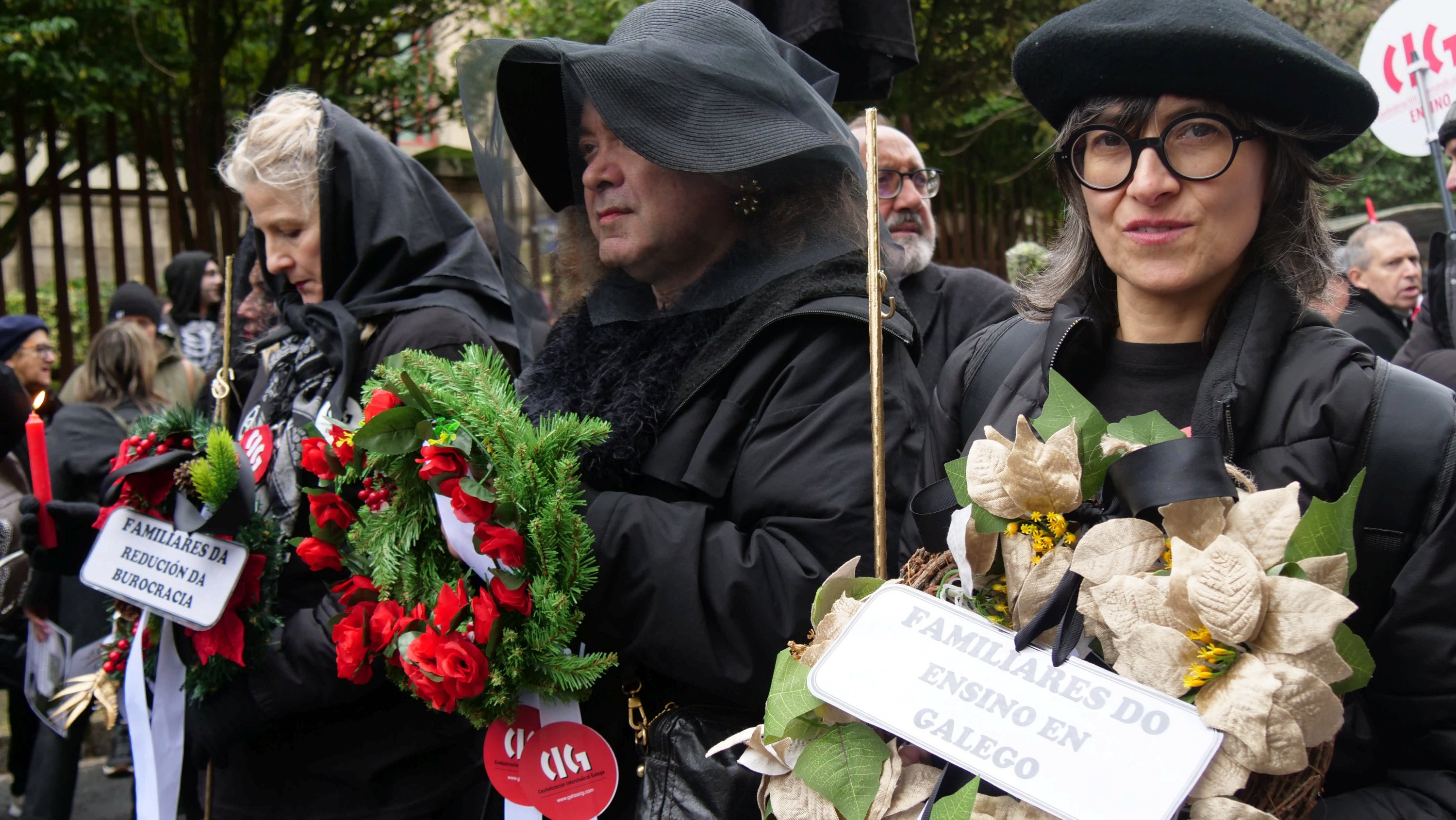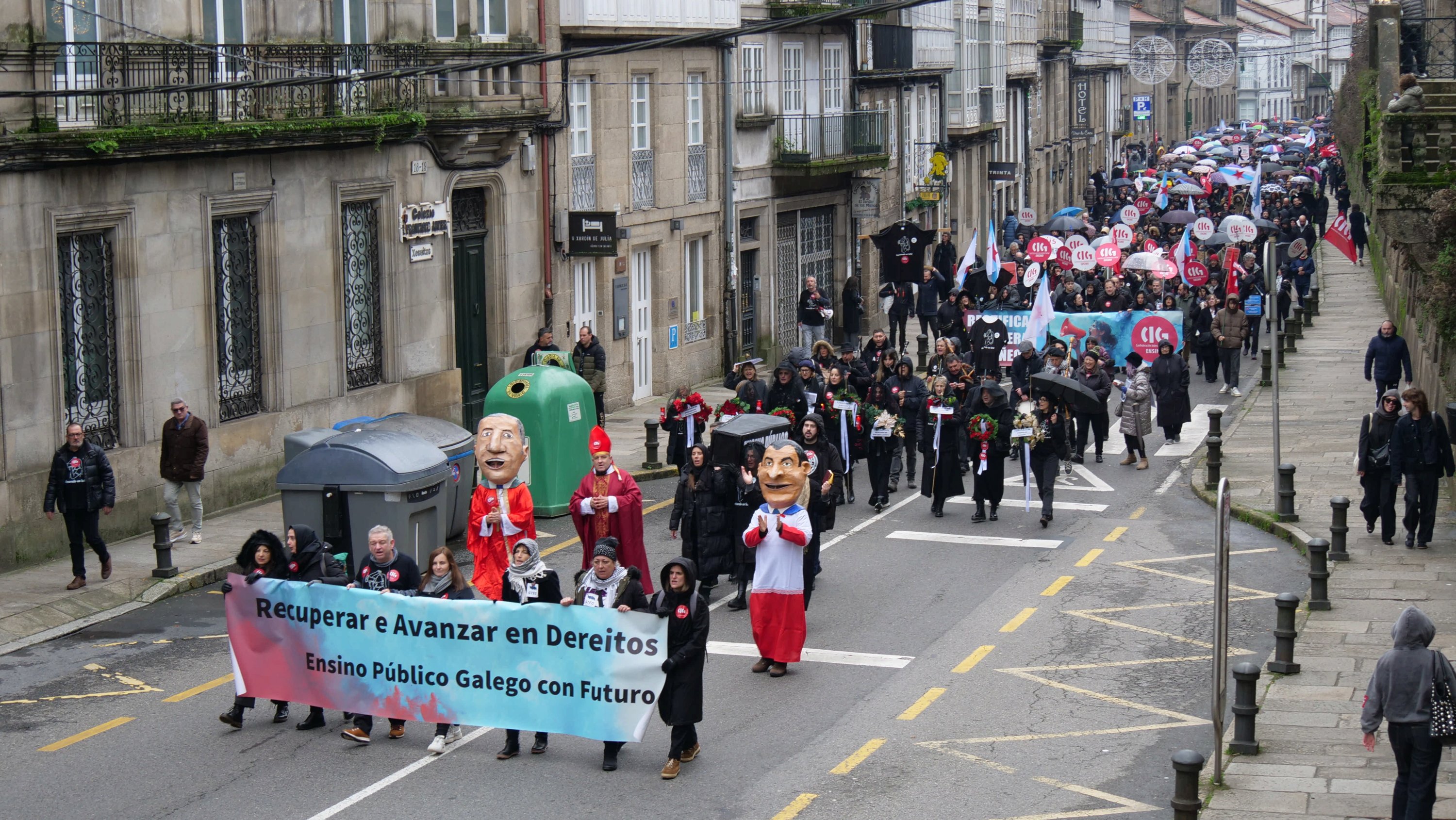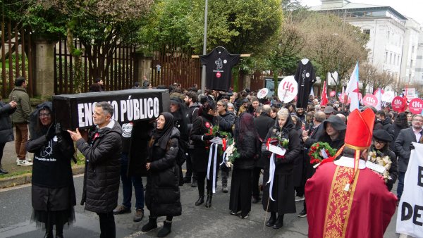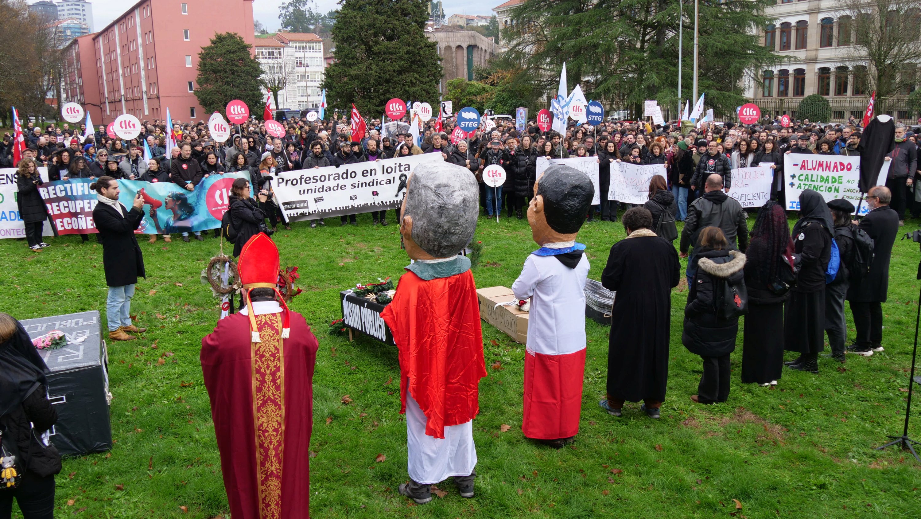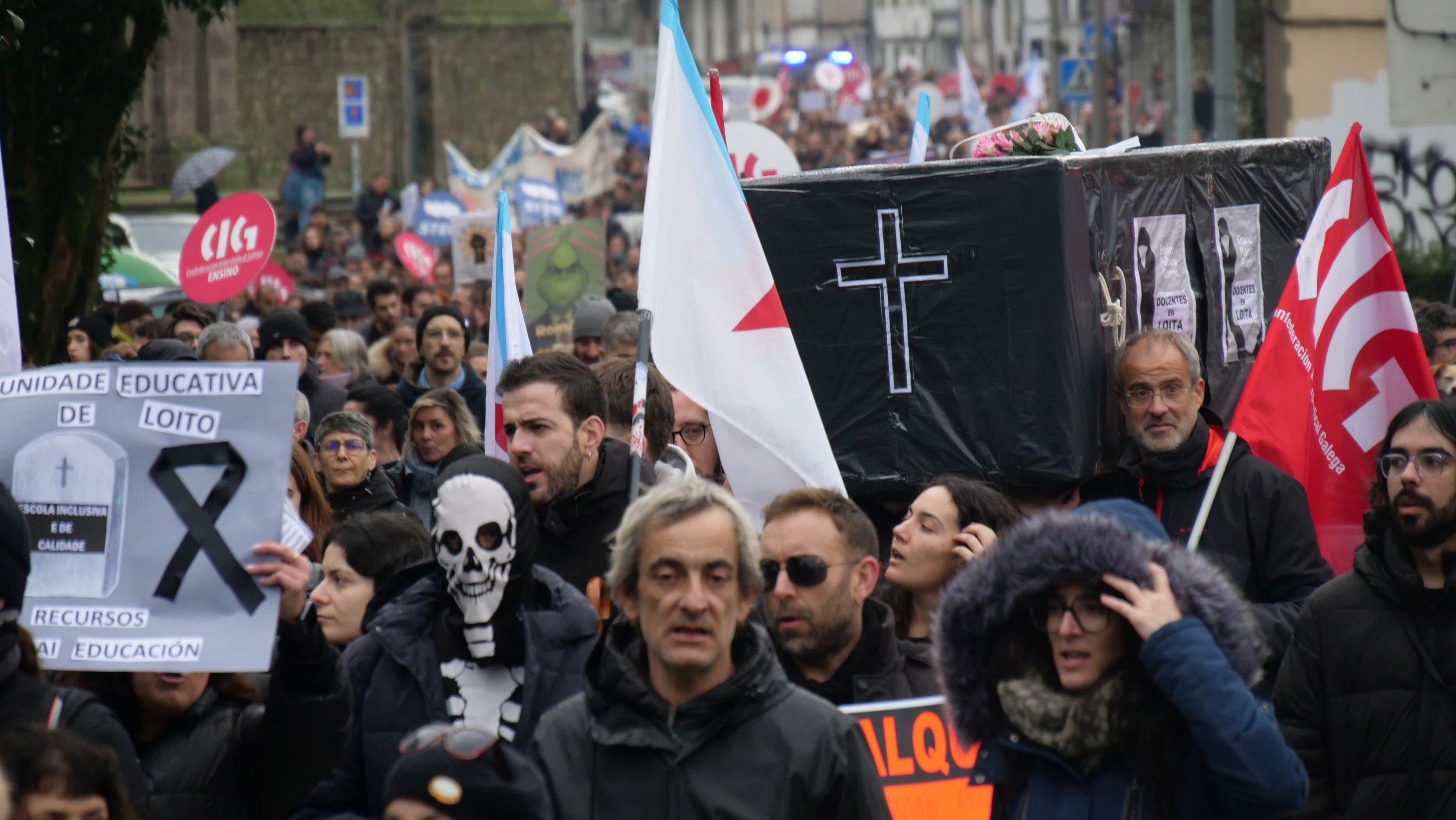 Milleiros de docentes escenificaron este mércores o enterro do ensino público galego cunha manifestación que partiu do Parlamento e rematou no complexo administrativo da Xunta en San Caetano. No que xa é o quinto día de folga dende que deu comezo o curso 2025-2026, as organizacións convocantes quixeron lanzar mensaxes en positivo polo conseguido nestes tres meses de intensa mobilización que fixeron reaccionar a Consellaría. Pois, malia negarse a negociar coa maioría sindical, Educación anunciou que adiantará a negociación da baixada de ratios en secundaria e que o vindeiro curso haberá novidades a respecto da recuperación do horario lectivo.