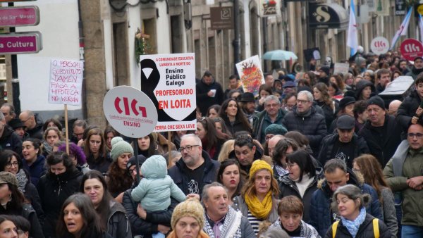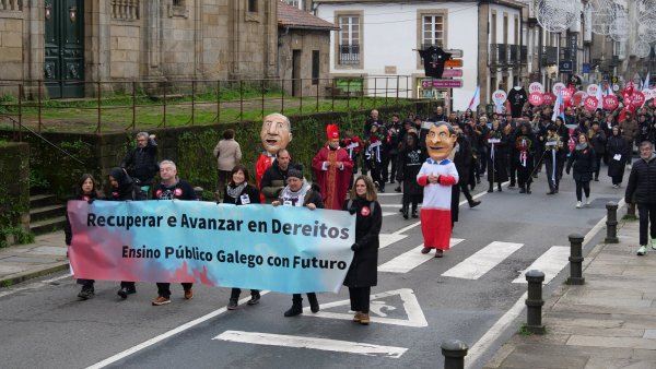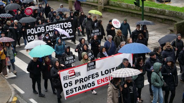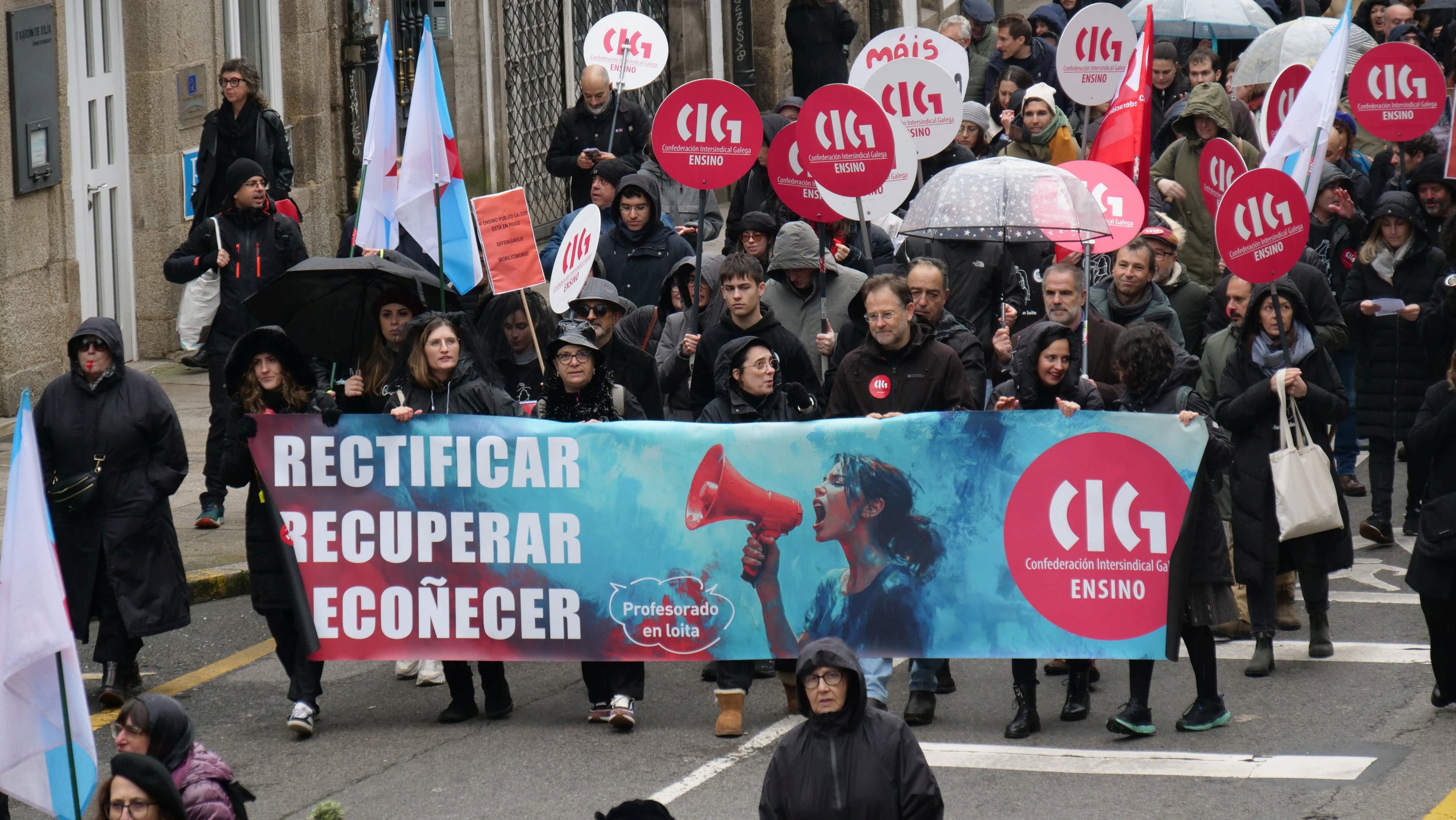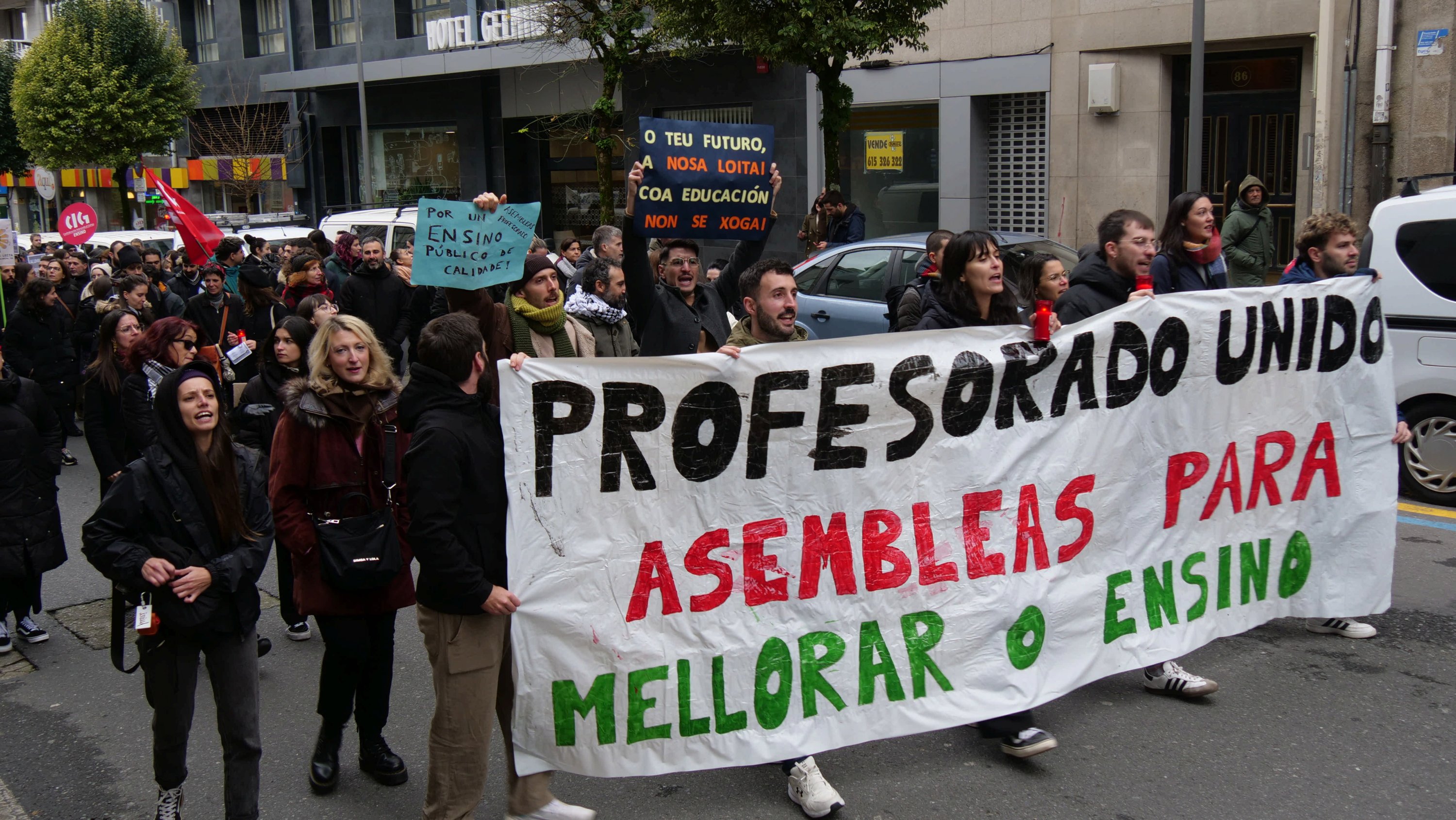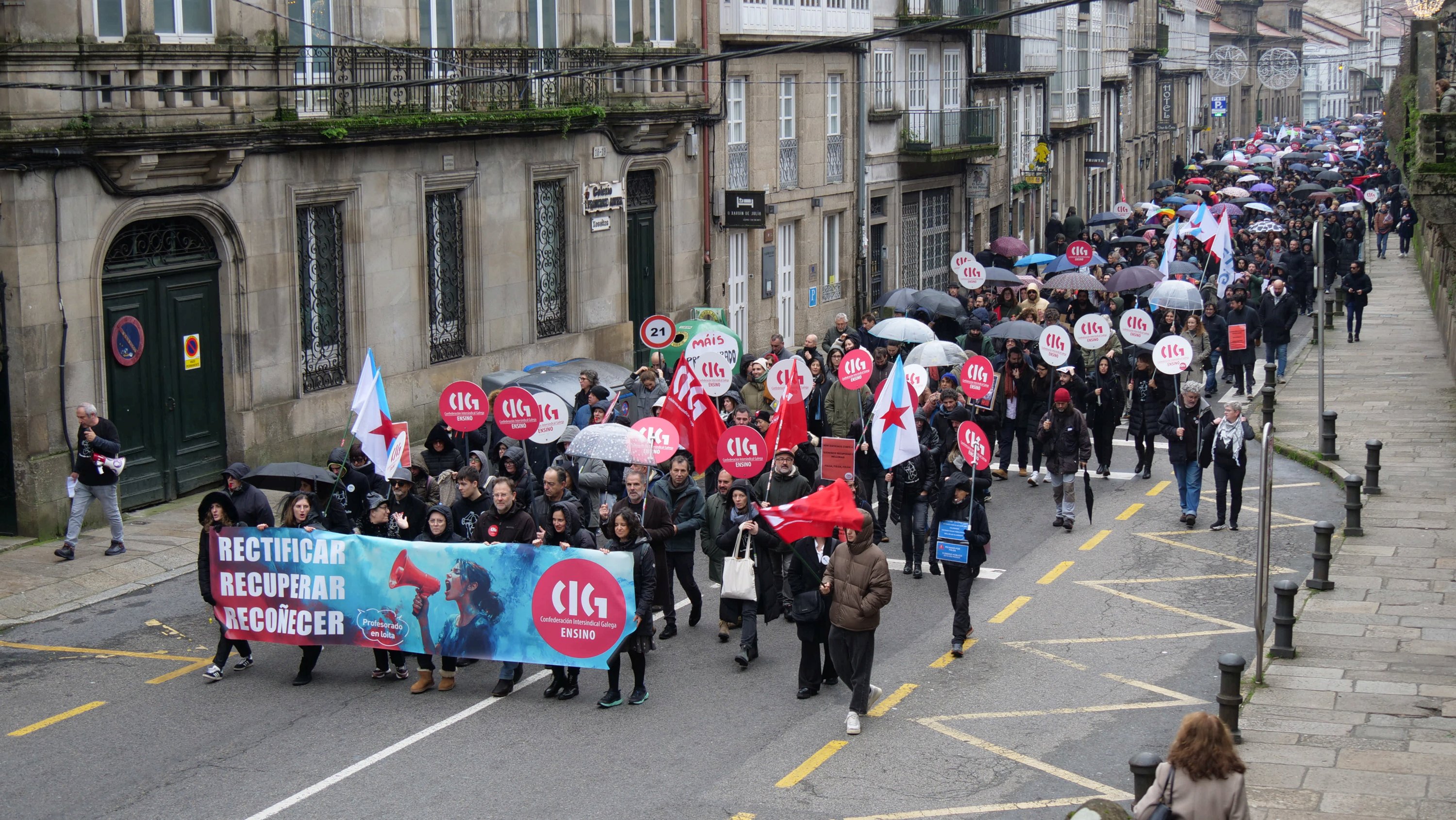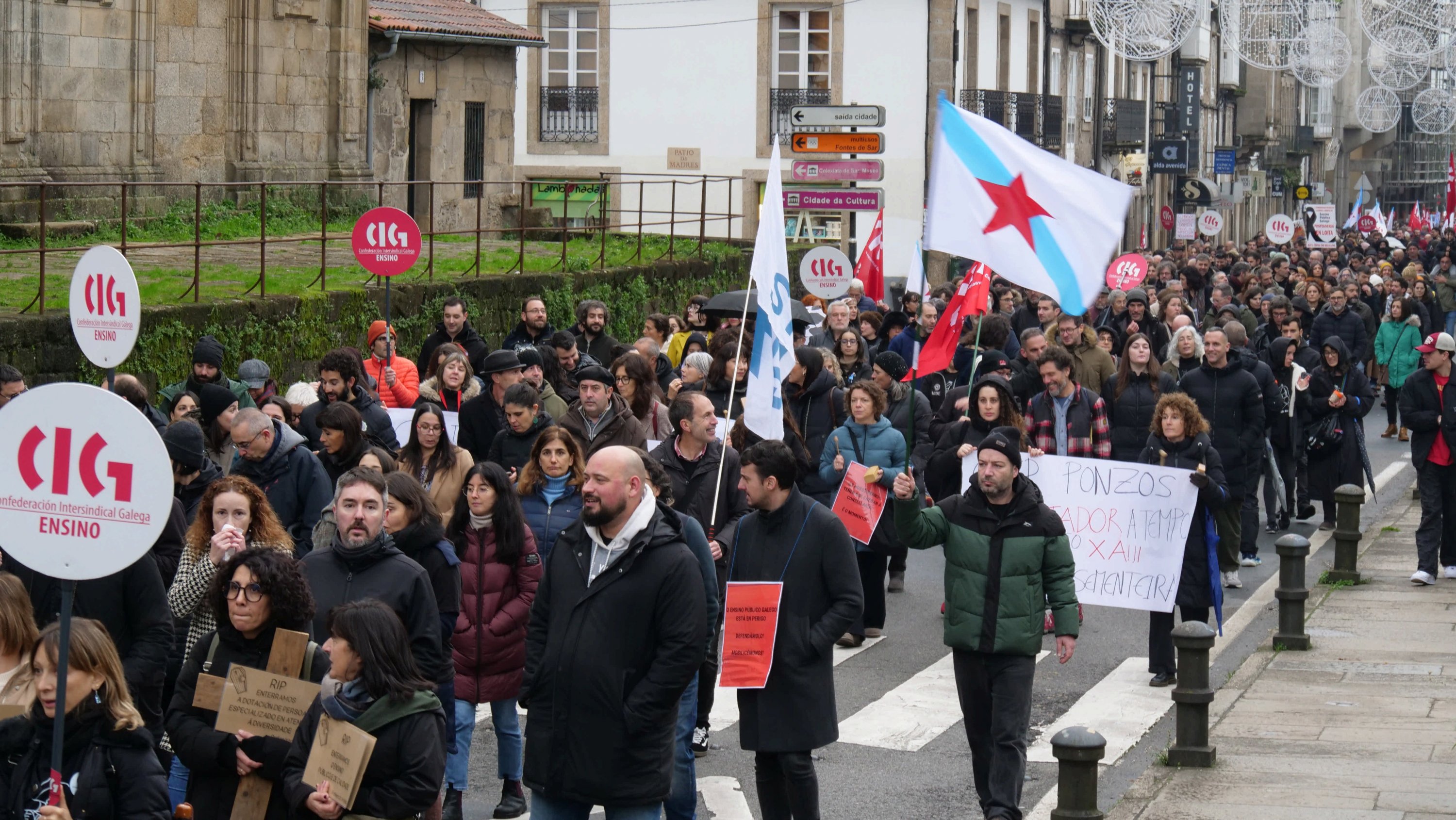 Milleiros de docentes escenificaron este mércores o enterro do ensino público galego cunha manifestación que partiu do Parlamento e rematou no complexo administrativo da Xunta en San Caetano. No que xa é o quinto día de folga dende que deu comezo o curso 2025-2026, as organizacións convocantes quixeron lanzar mensaxes en positivo polo conseguido nestes tres meses de intensa mobilización que fixeron reaccionar a Consellaría. Pois, malia negarse a negociar coa maioría sindical, Educación anunciou que adiantará a negociación da baixada de ratios en secundaria e que o vindeiro curso haberá novidades a respecto da recuperación do horario lectivo.