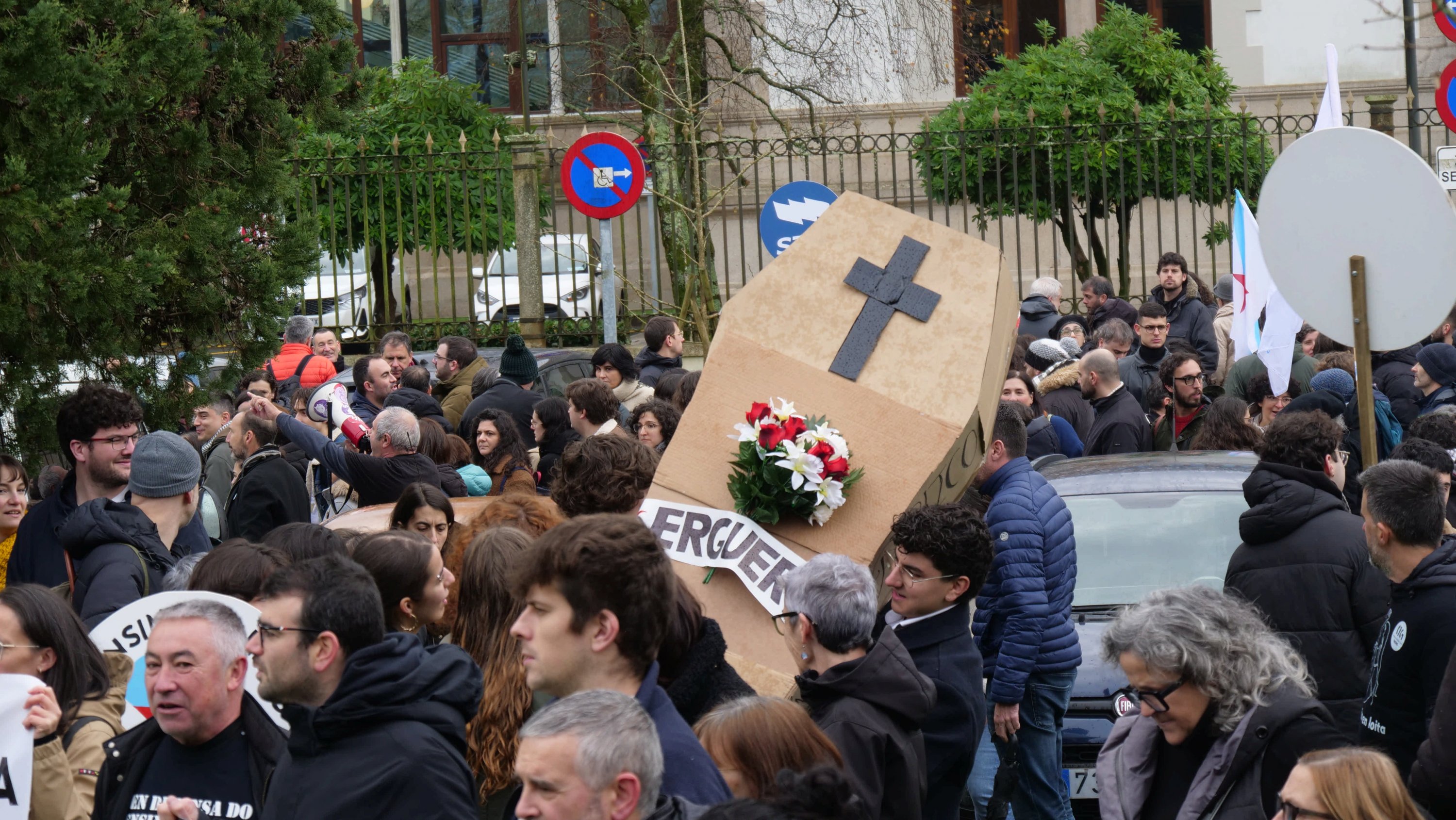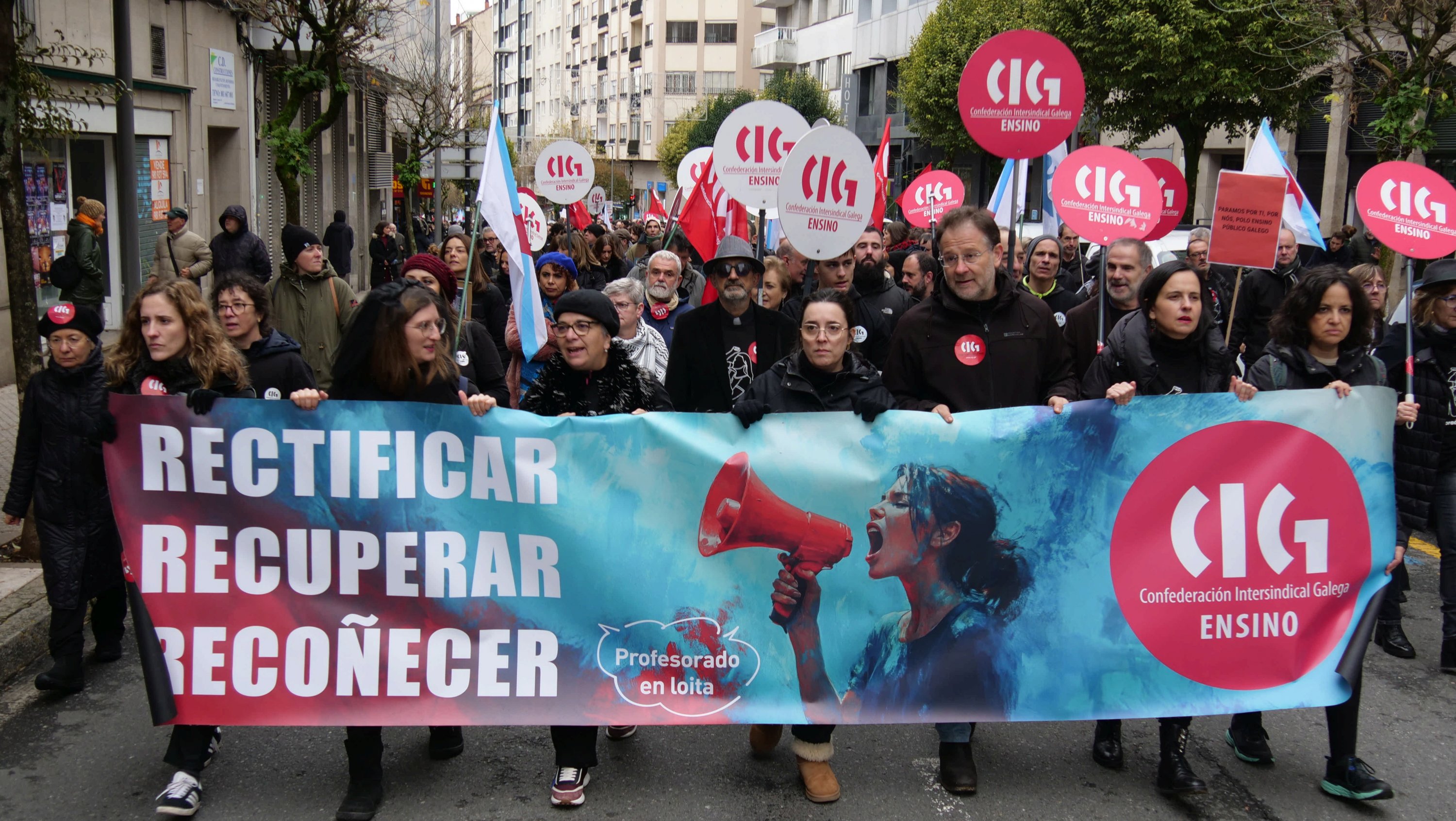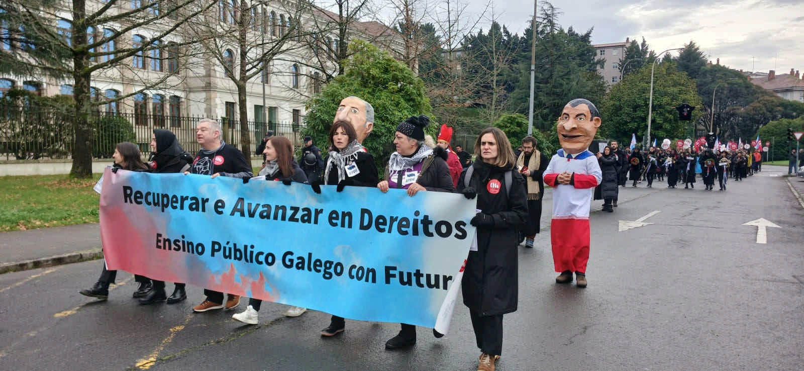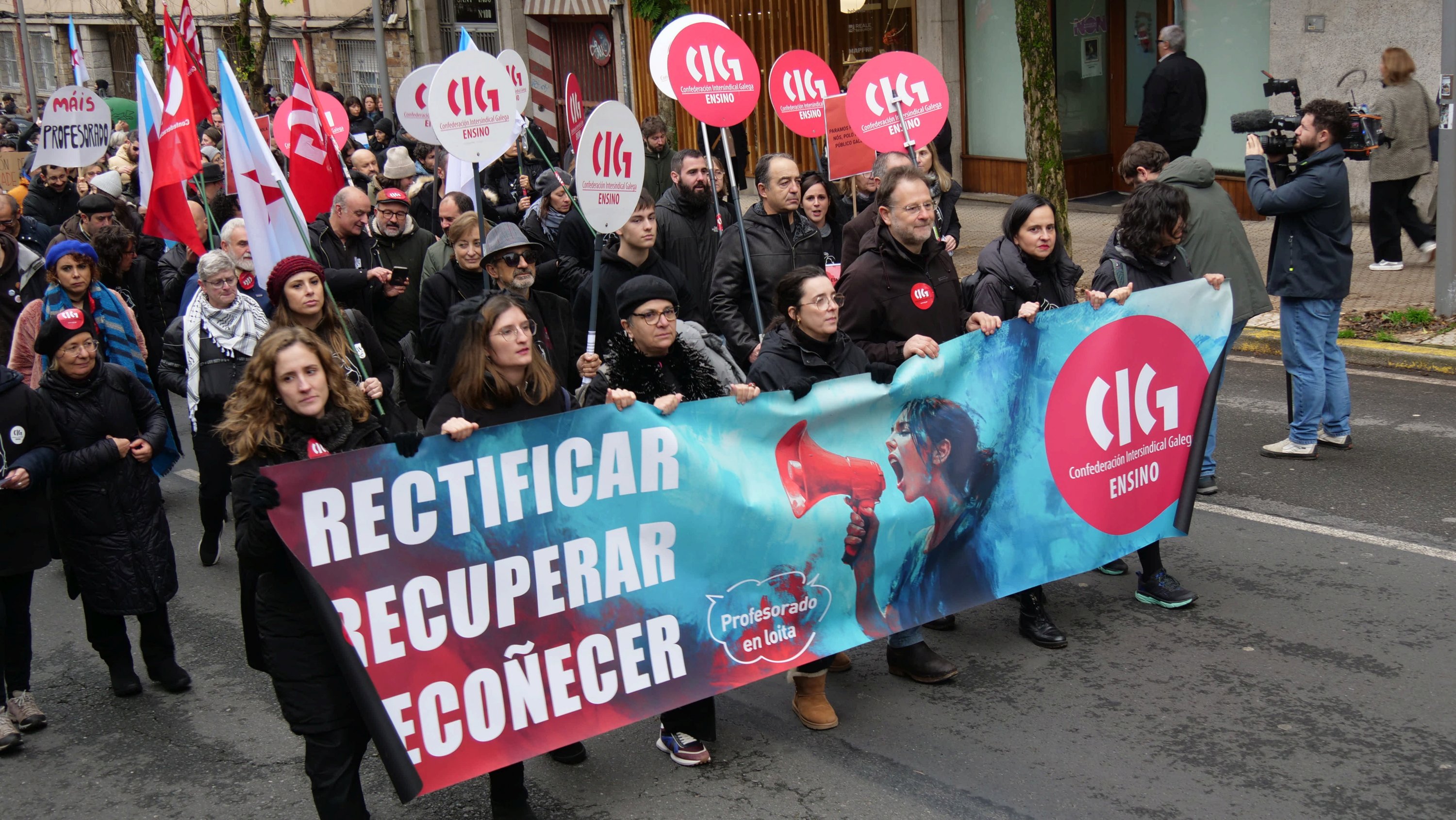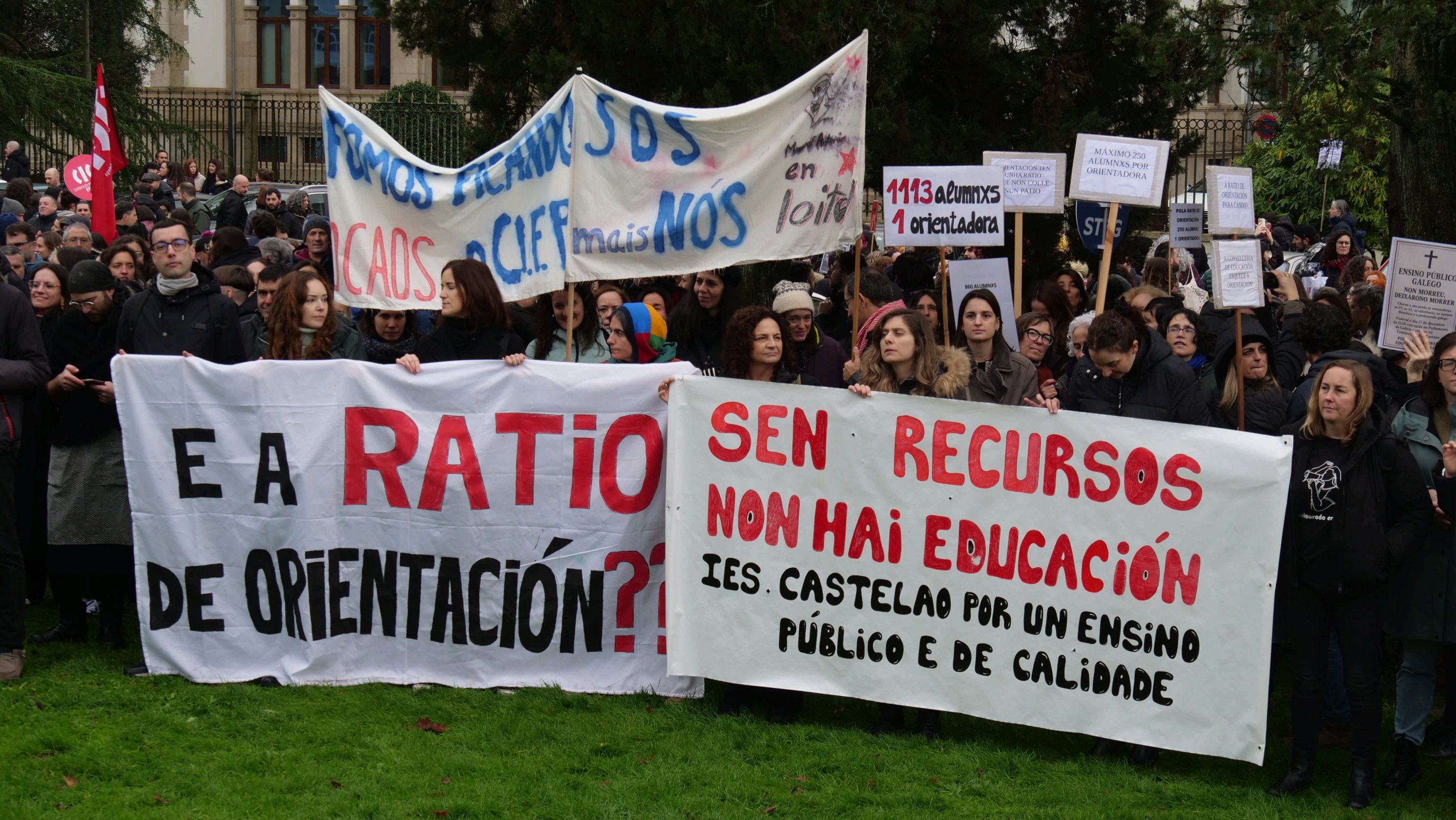 Milleiros de docentes escenificaron este mércores o enterro do ensino público galego cunha manifestación que partiu do Parlamento e rematou no complexo administrativo da Xunta en San Caetano. No que xa é o quinto día de folga dende que deu comezo o curso 2025-2026, as organizacións convocantes quixeron lanzar mensaxes en positivo polo conseguido nestes tres meses de intensa mobilización que fixeron reaccionar a Consellaría. Pois, malia negarse a negociar coa maioría sindical, Educación anunciou que adiantará a negociación da baixada de ratios en secundaria e que o vindeiro curso haberá novidades a respecto da recuperación do horario lectivo.