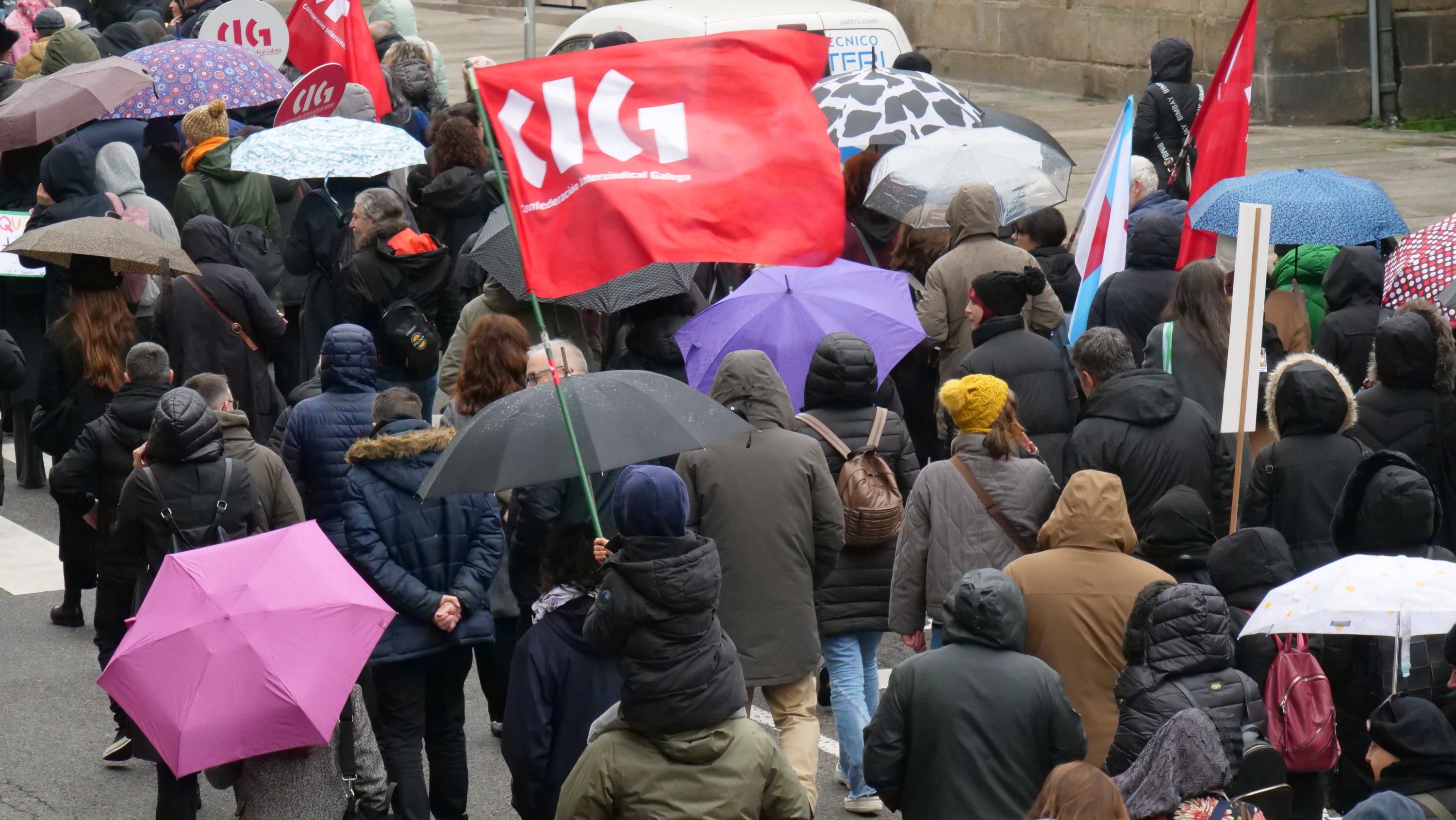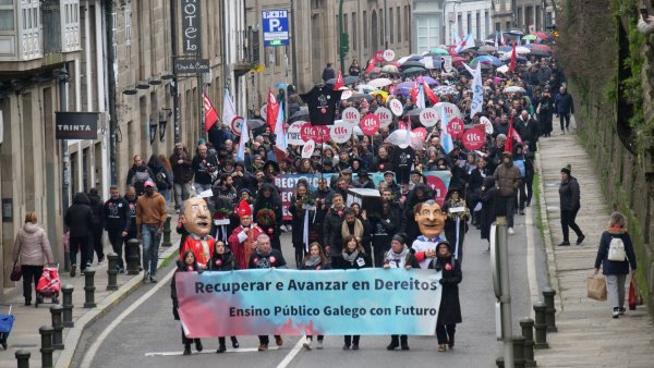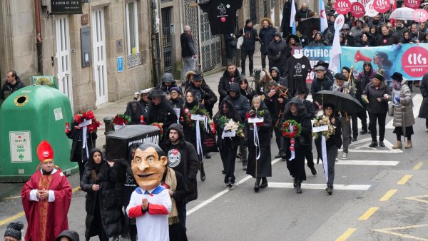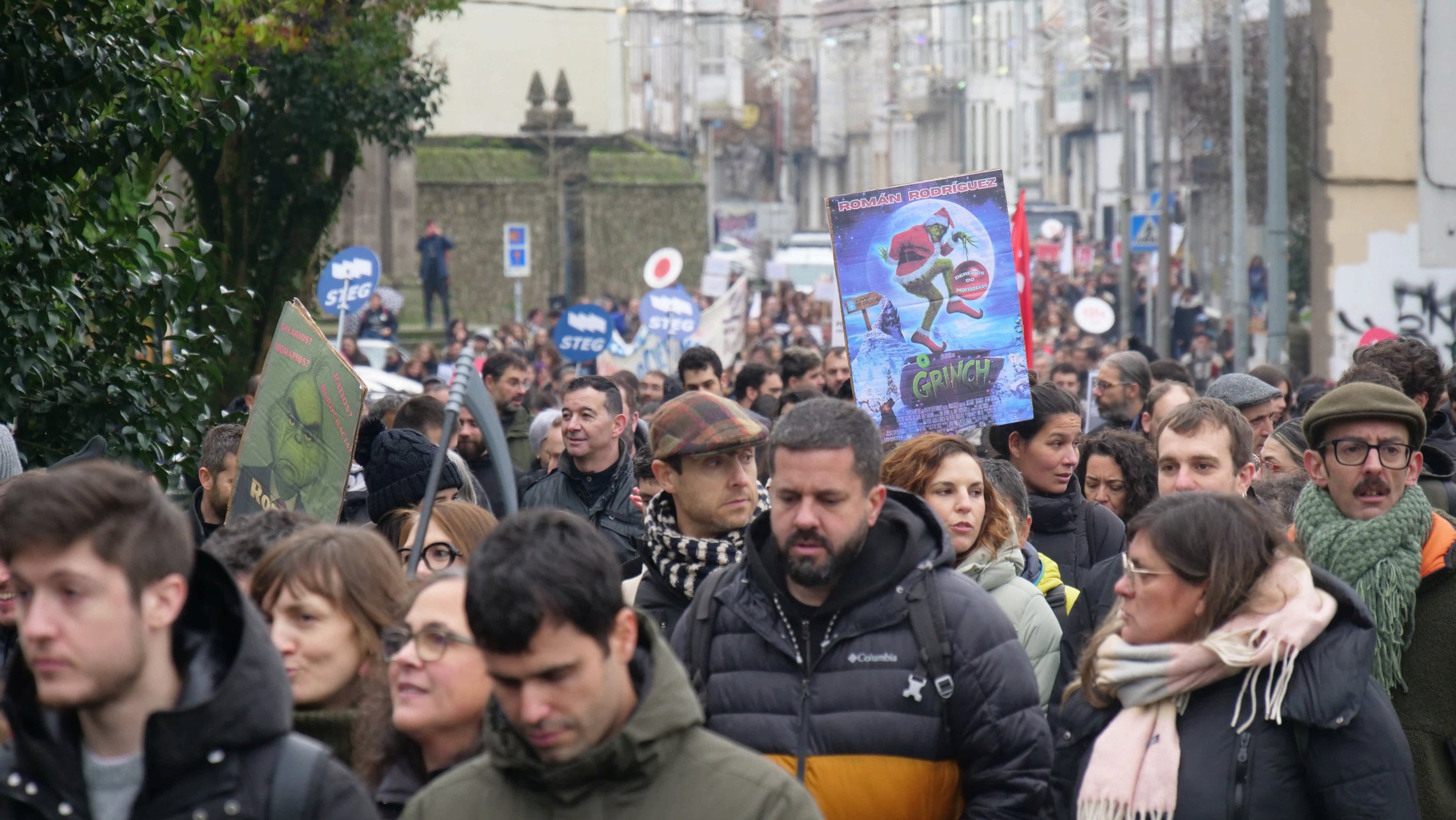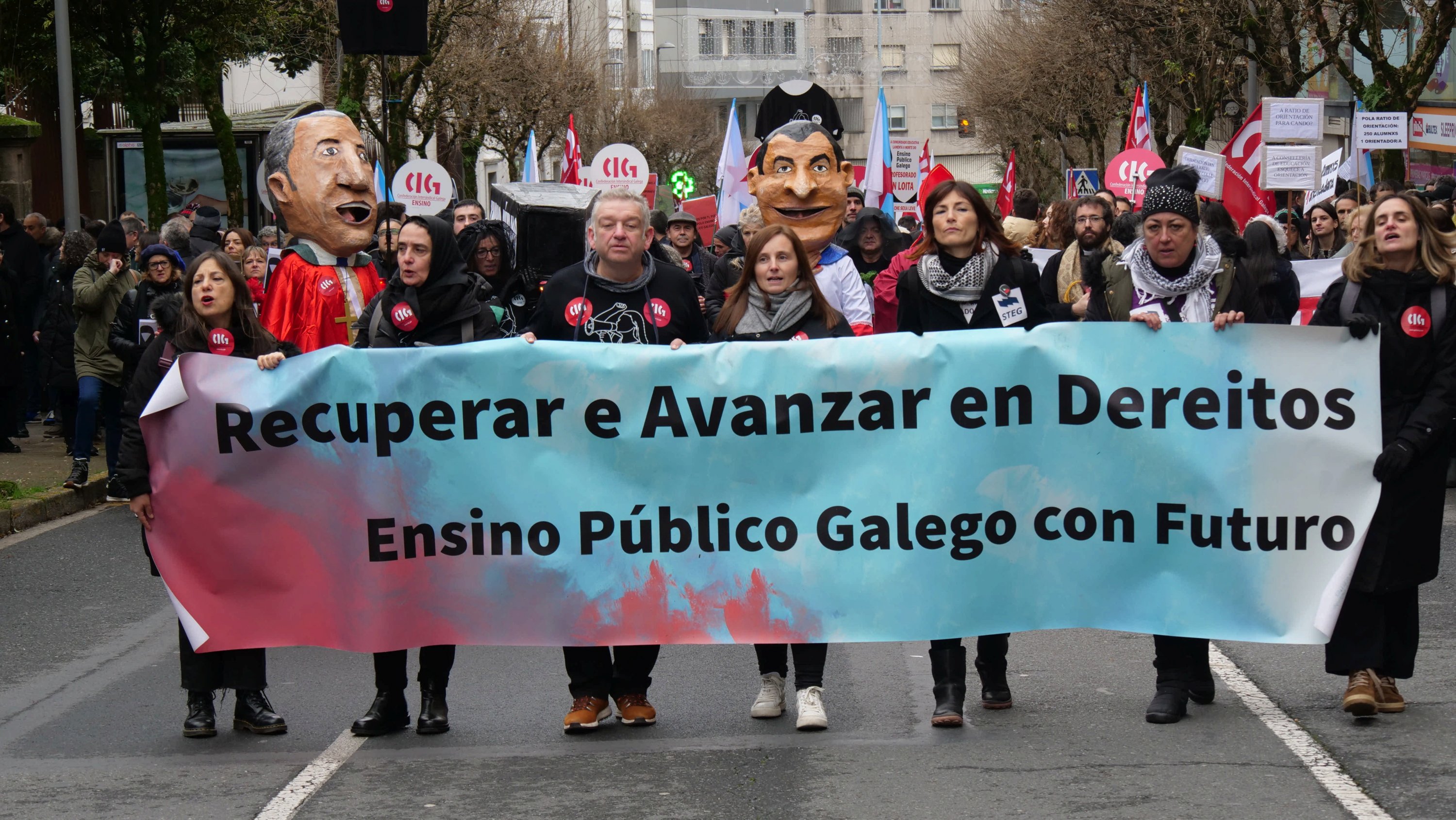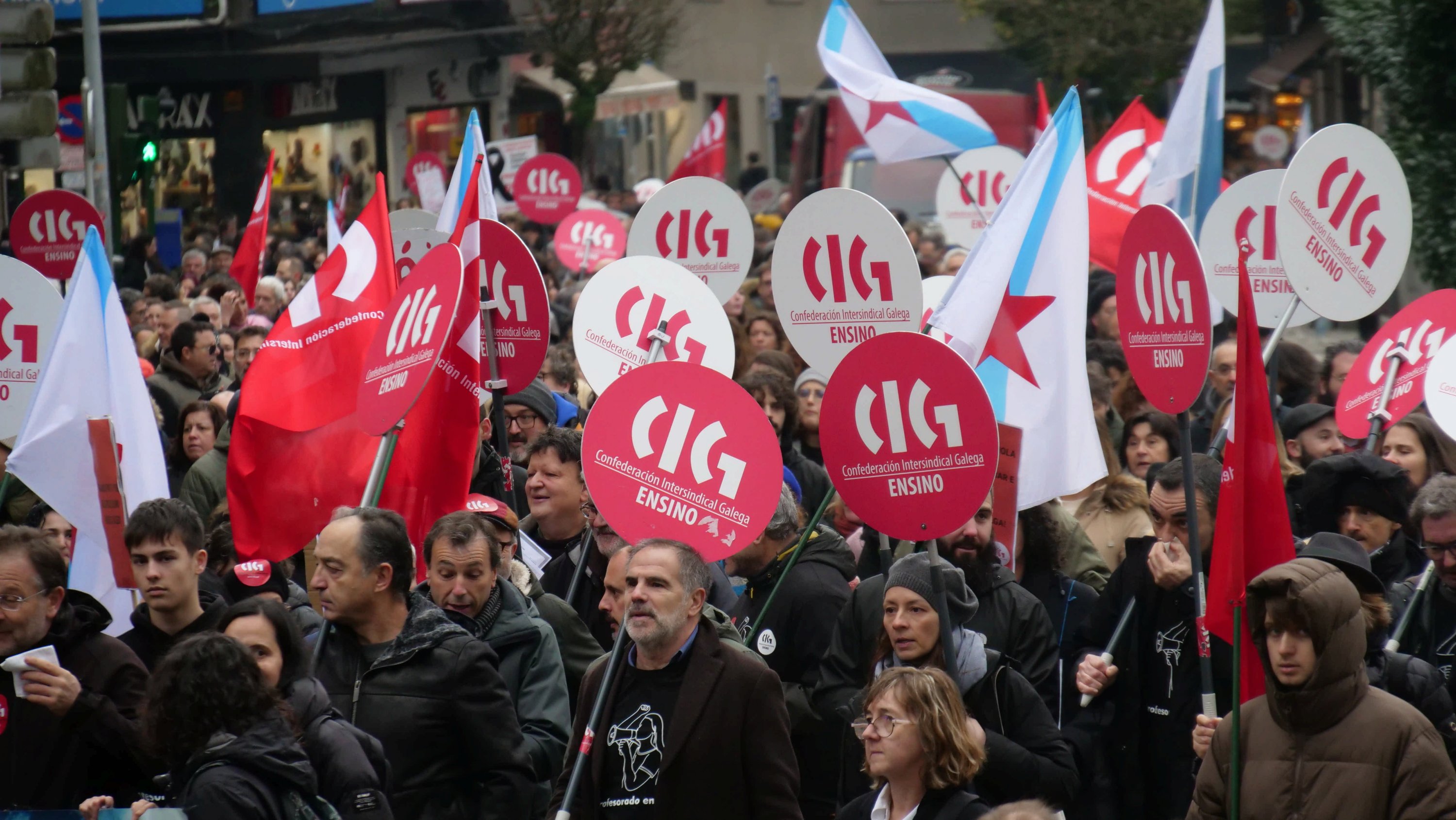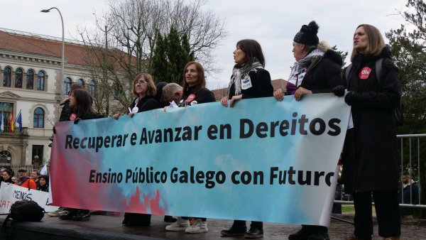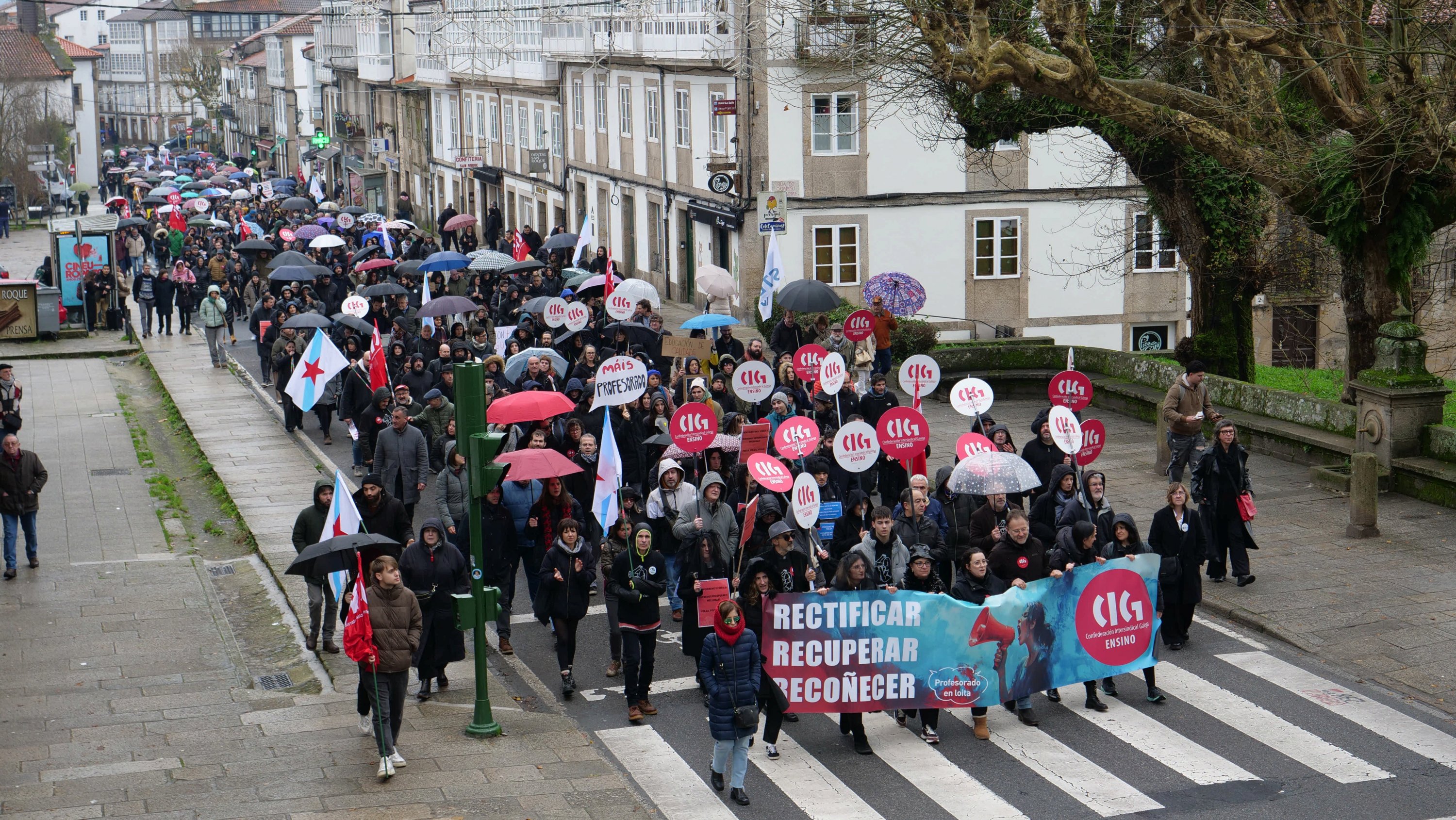 Milleiros de docentes escenificaron este mércores o enterro do ensino público galego cunha manifestación que partiu do Parlamento e rematou no complexo administrativo da Xunta en San Caetano. No que xa é o quinto día de folga dende que deu comezo o curso 2025-2026, as organizacións convocantes quixeron lanzar mensaxes en positivo polo conseguido nestes tres meses de intensa mobilización que fixeron reaccionar a Consellaría. Pois, malia negarse a negociar coa maioría sindical, Educación anunciou que adiantará a negociación da baixada de ratios en secundaria e que o vindeiro curso haberá novidades a respecto da recuperación do horario lectivo.