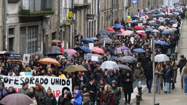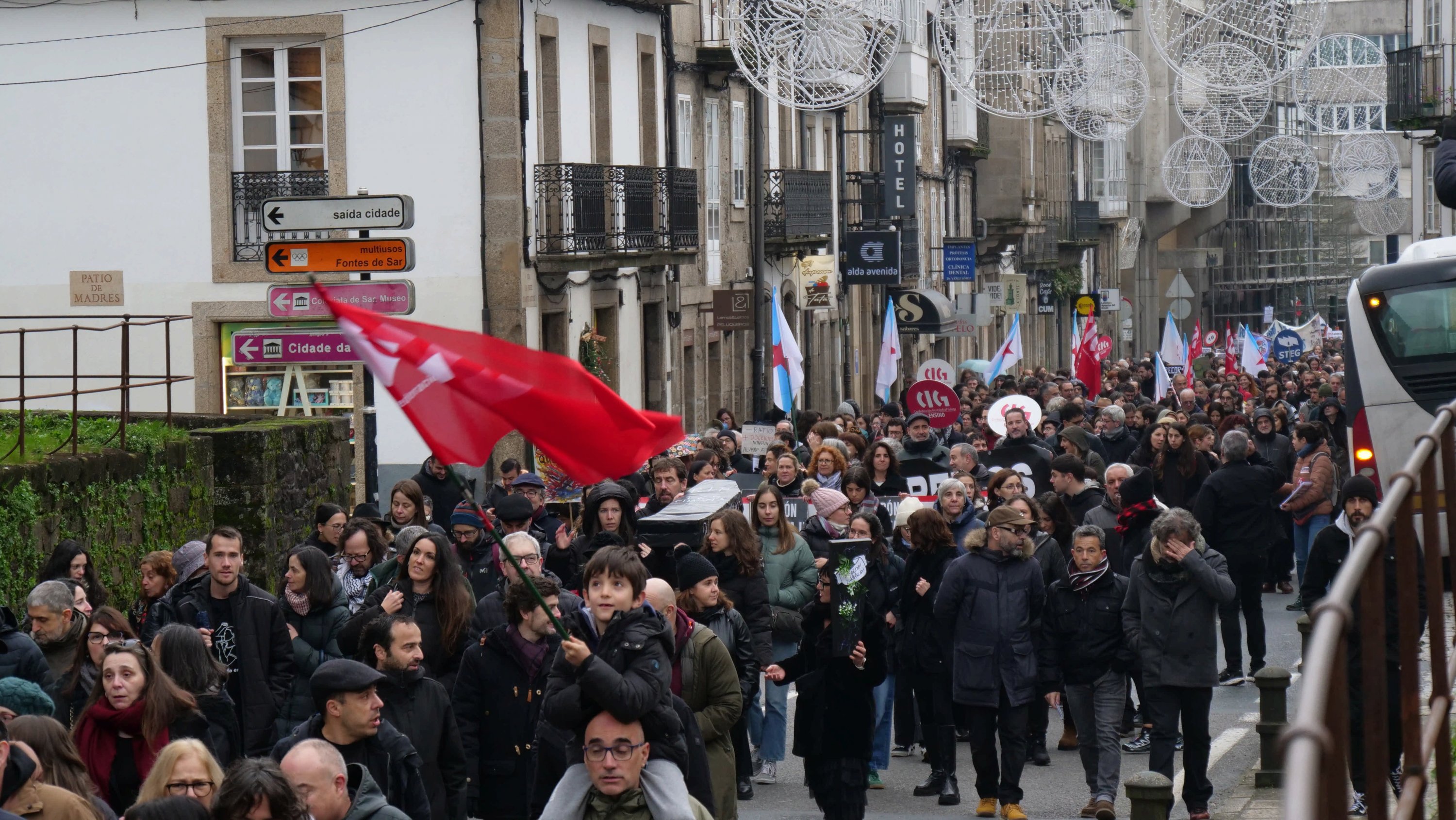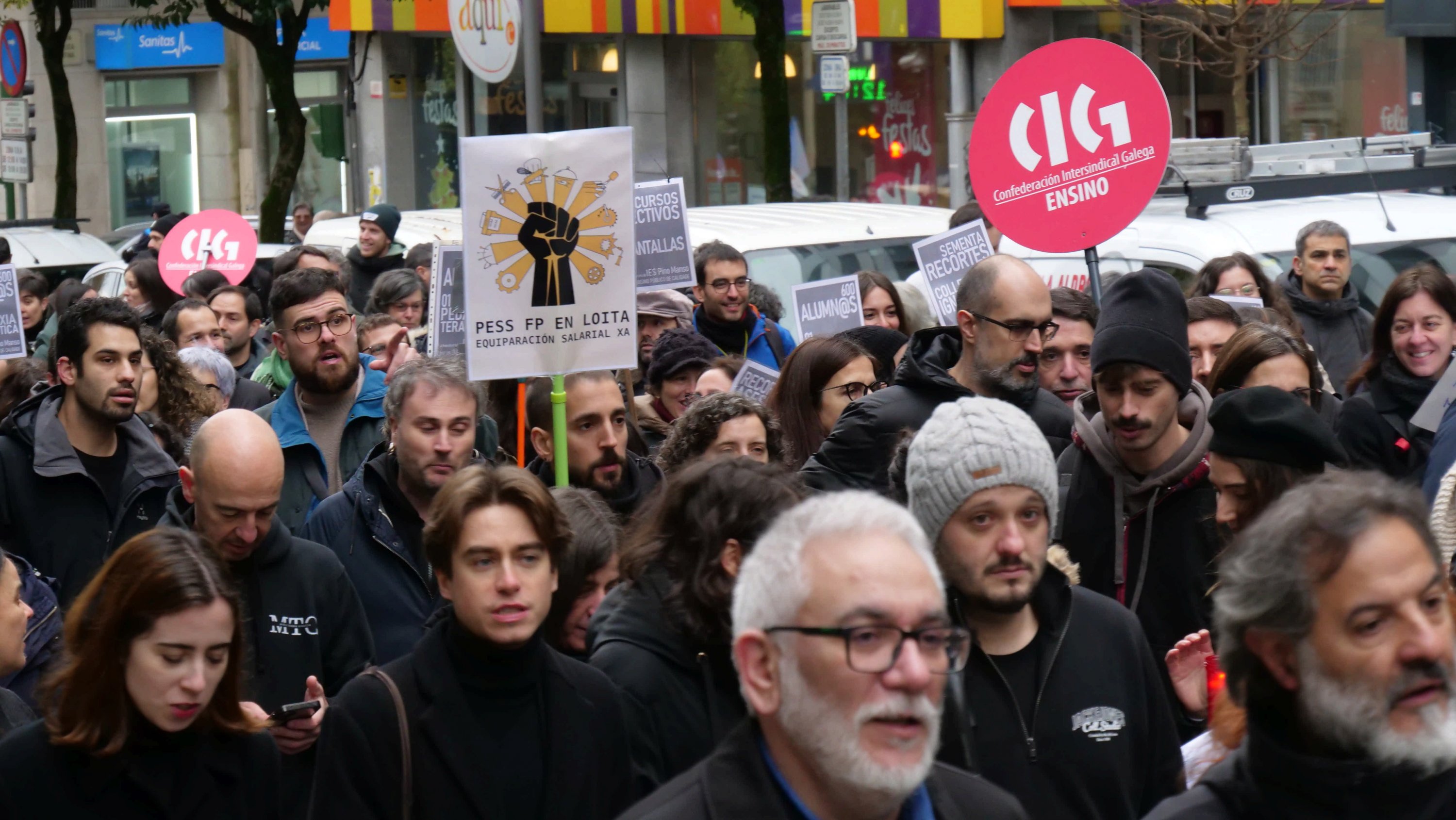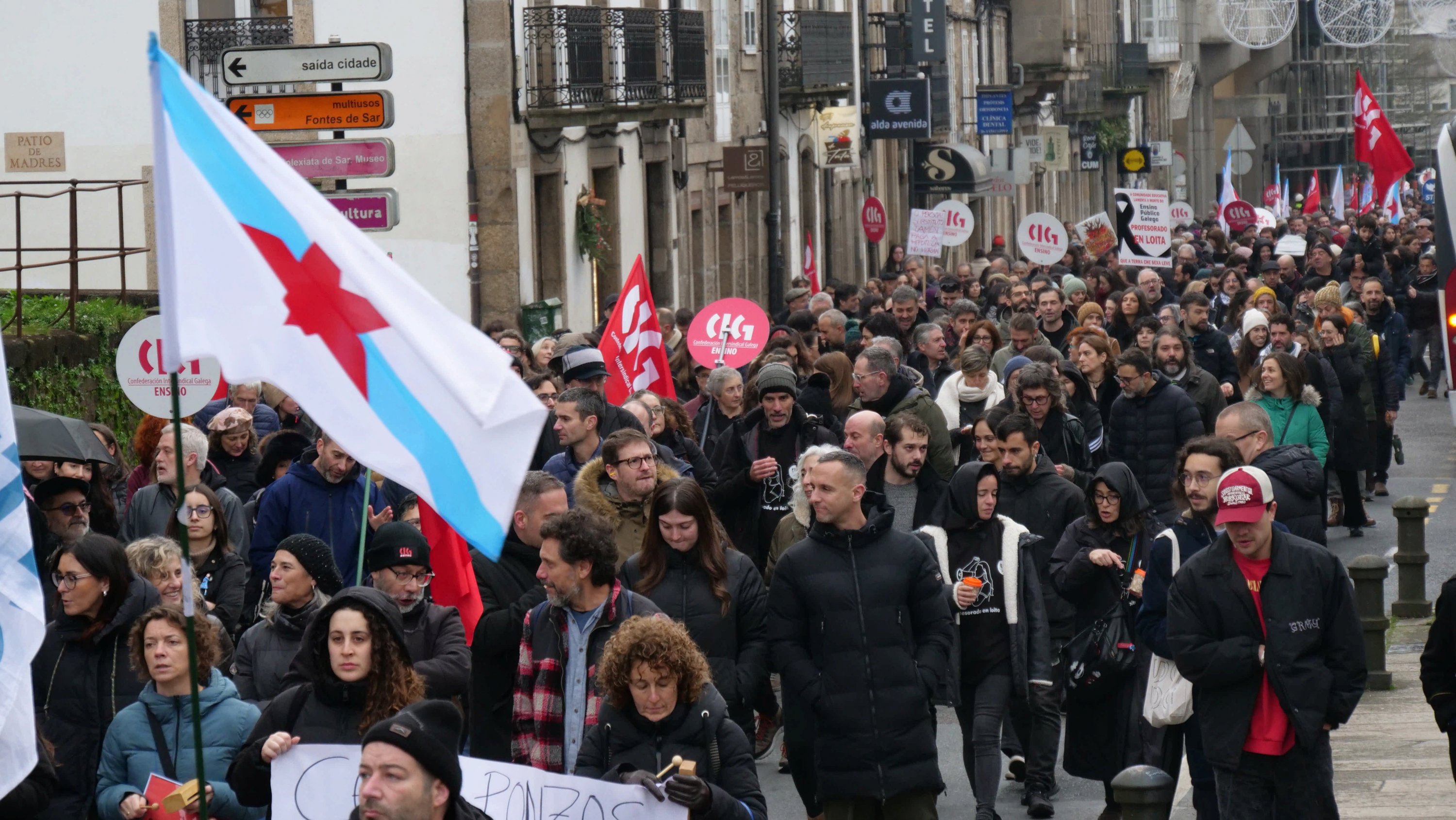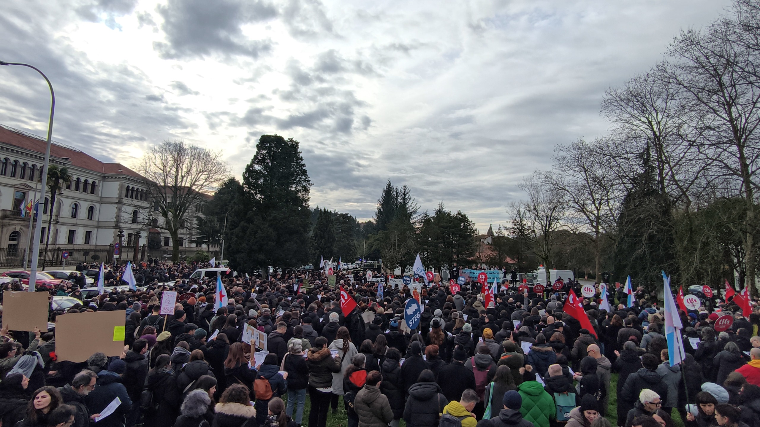 Milleiros de docentes escenificaron este mércores o enterro do ensino público galego cunha manifestación que partiu do Parlamento e rematou no complexo administrativo da Xunta en San Caetano. No que xa é o quinto día de folga dende que deu comezo o curso 2025-2026, as organizacións convocantes quixeron lanzar mensaxes en positivo polo conseguido nestes tres meses de intensa mobilización que fixeron reaccionar a Consellaría. Pois, malia negarse a negociar coa maioría sindical, Educación anunciou que adiantará a negociación da baixada de ratios en secundaria e que o vindeiro curso haberá novidades a respecto da recuperación do horario lectivo.