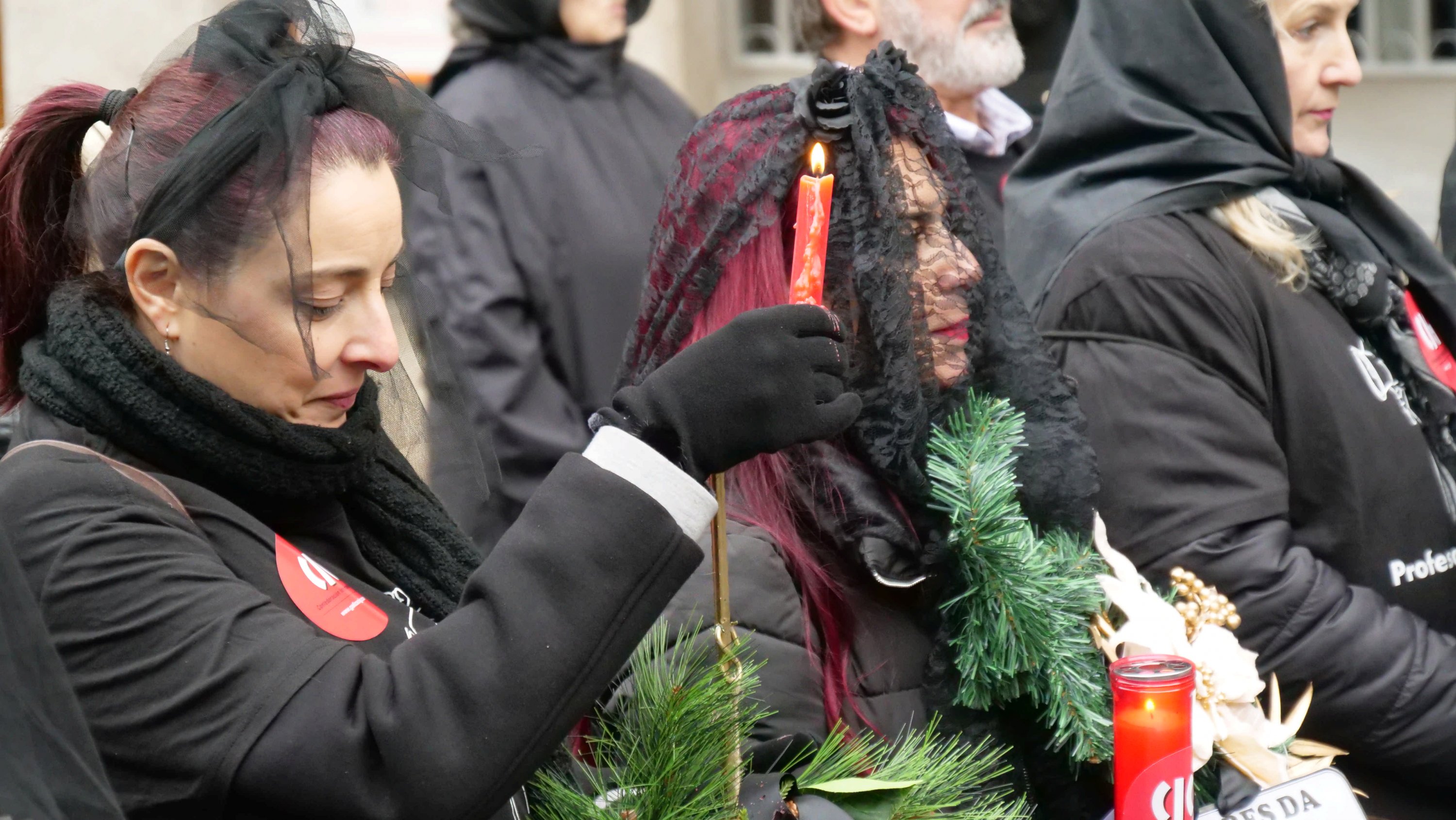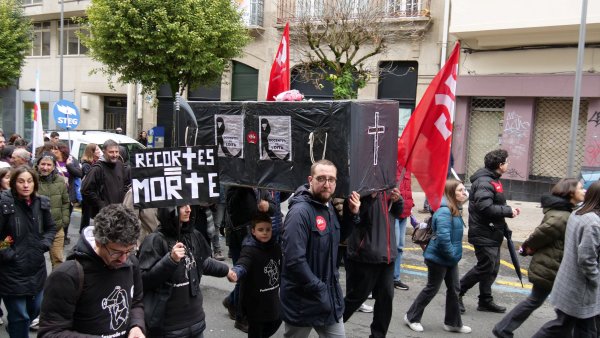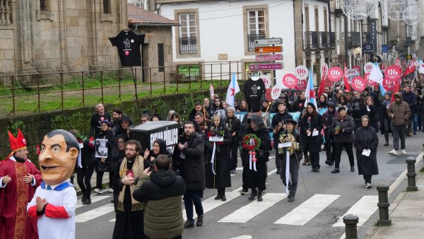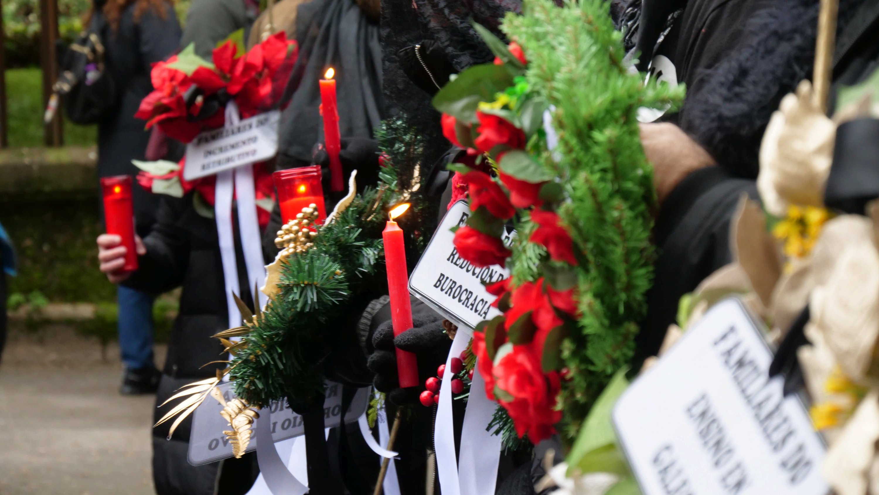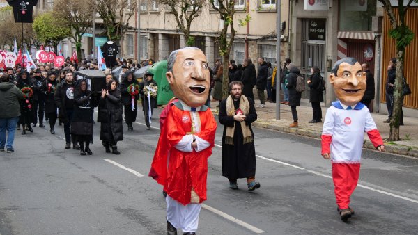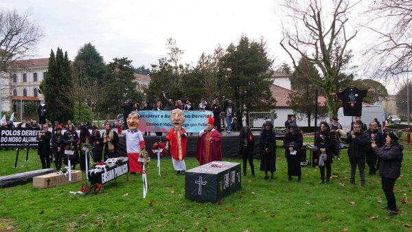 Durante a marcha portáronse cadaleitos, candeas, esquelas e outra simboloxía mortuoria, xunto con cabezudos do presidente Rueda e do conselleiro Rodríguez. Houbo minutos de silencio, loito e toque de campás pero na intervención final as responsábeis da CIG-Ensino e do STEG quixeron deixar unha mensaxe optimista sinalando que “todo o esforzo e sacrificio que está facendo o persoal que secunda a folga e asiste ás mobilizacións non pode ser inútil e que o que está por vir ten que ser para mellor”.