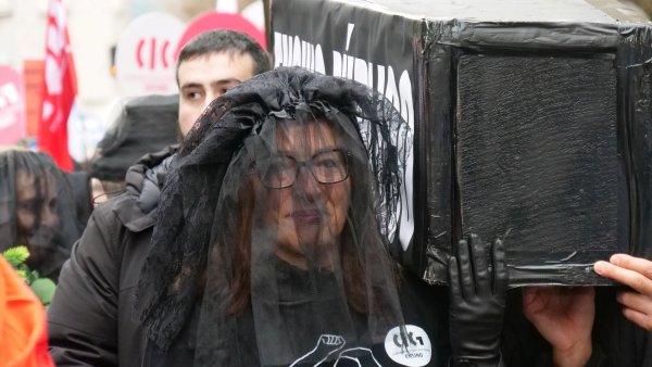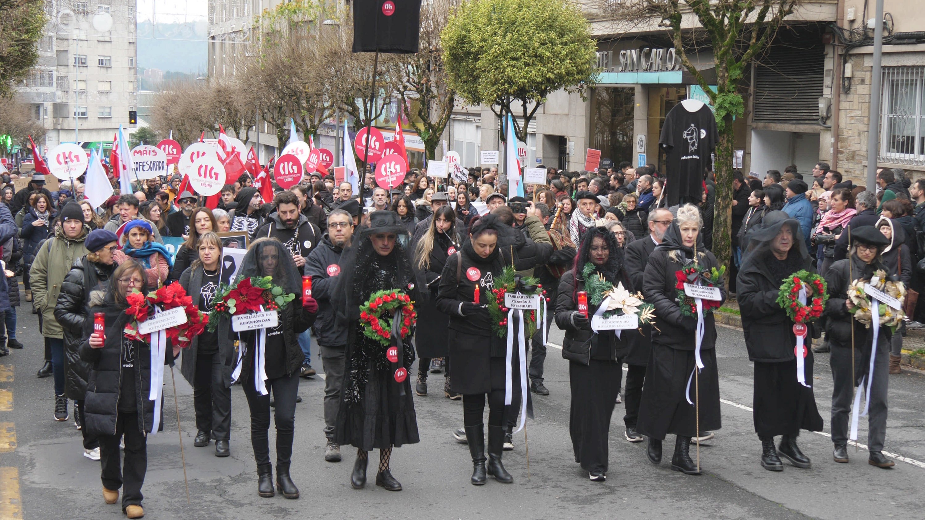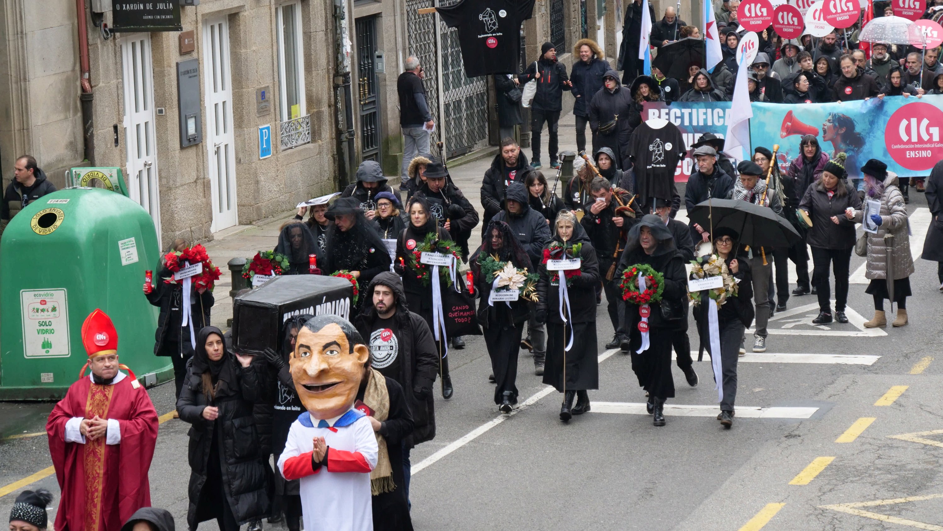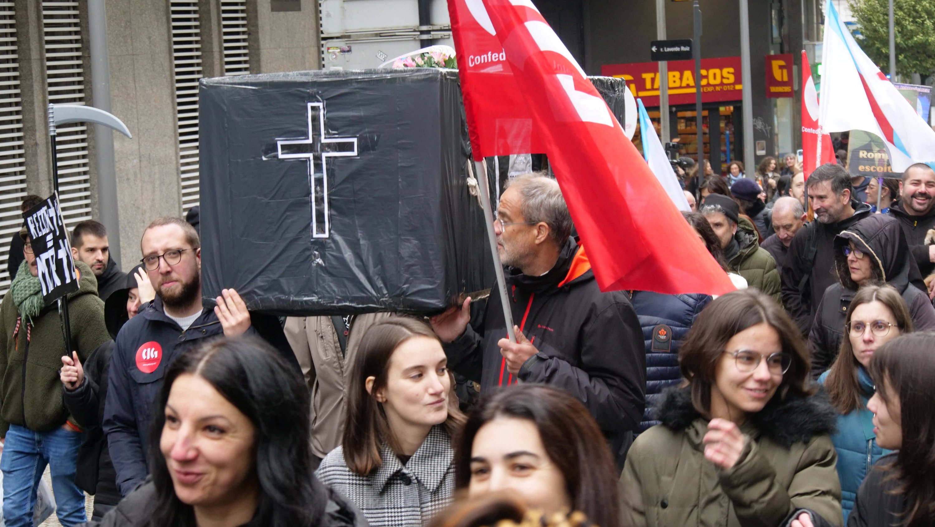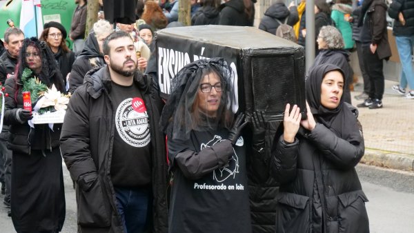 Milleiros de docentes escenifican nas rúas de Compostela o enterro do ensino público galego