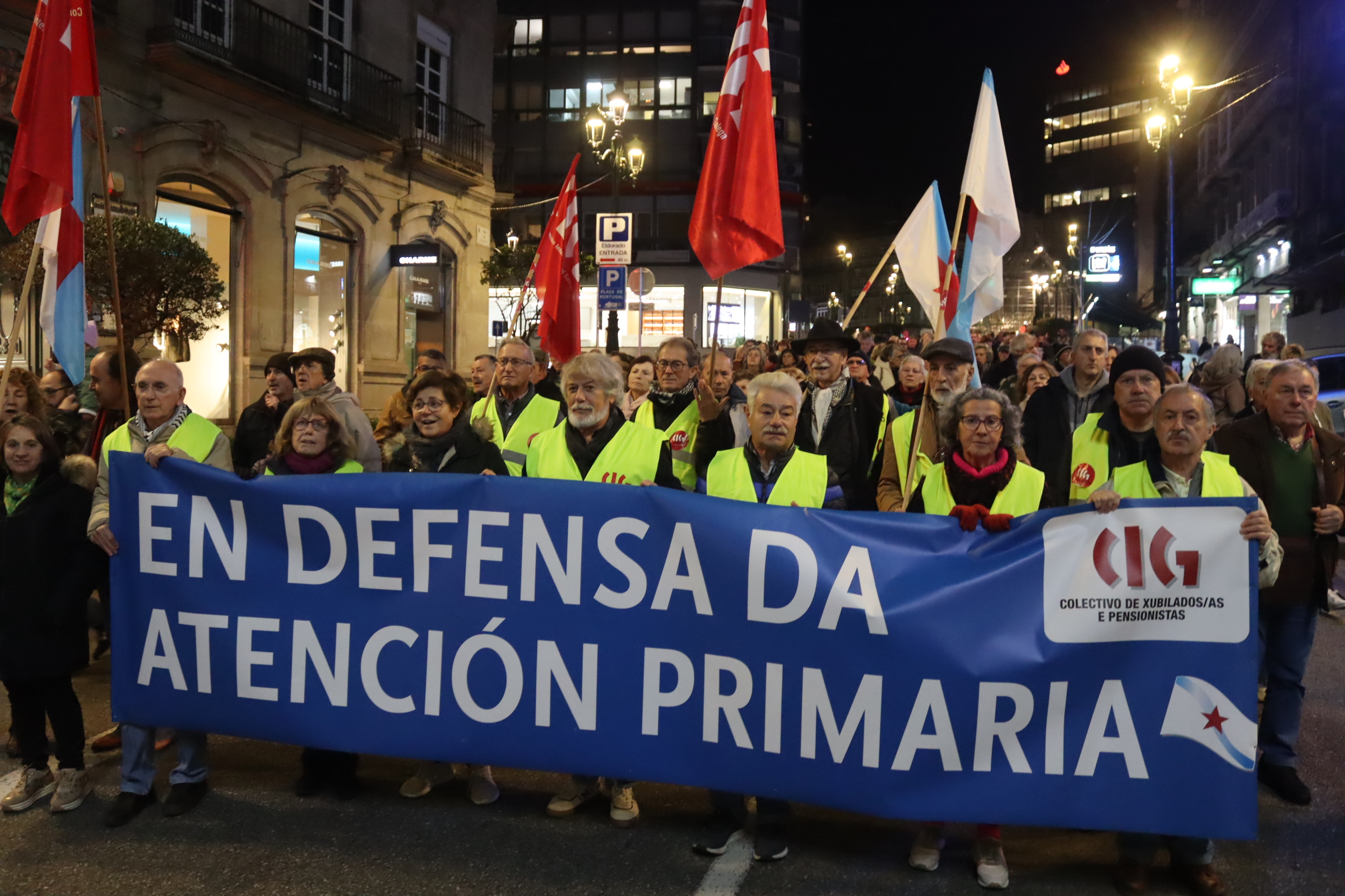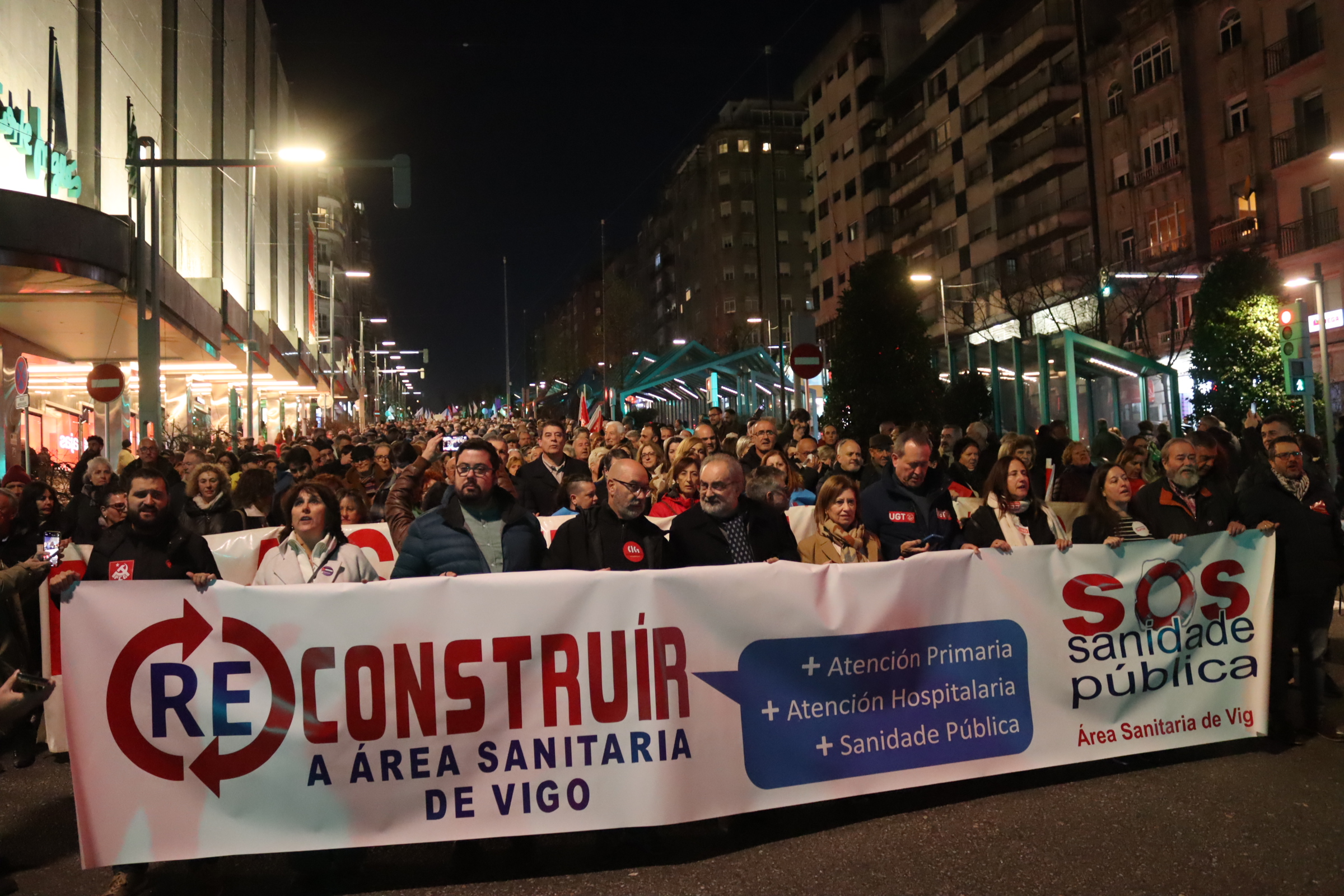 A marcha, que se celebrou baixo o lema ‘Reconstruír a área sanitaria de Vigo’, arrincou ás 19:10 horas da Praza dos Cabalos e rematou no cruzamento da rúa Urzaiz con Colón, onde as integrantes do grupo de teatro A Panadaría deron lectura ao manifesto da organización. O texto chama a dotar a área sanitaria viguesa dos recursos humanos e materiais precisos para conseguir unha asistencia sanitaria “100% pública e de calidade” e reclama as responsabilidades políticas oportunas polas condicións de licitación e construción do Álvaro Cunqueiro.