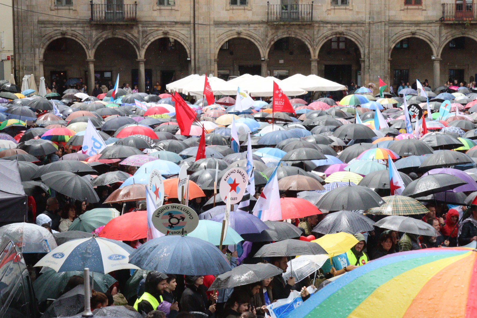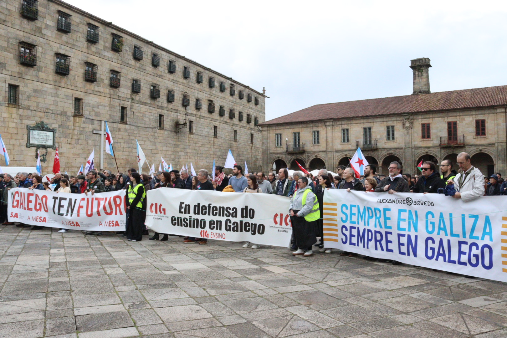 "Para unha Galiza viva, activa e consciente das súas capacidades, precisamos dun goberno realmente comprometido coa súa obriga de promover o uso, presenza e disposición do idioma, cun galego vivo", aseverouse nunha ateigada Praza da Quintana durante o acto final conducido por Isa Risco, que contou coa actuación do grupo Dakidarría e ao que Marcos Maceiras, presidente da Mesa pola Normalización Lingüística e portavoz da plataforma Queremos Galego, lle puxo o broche final.