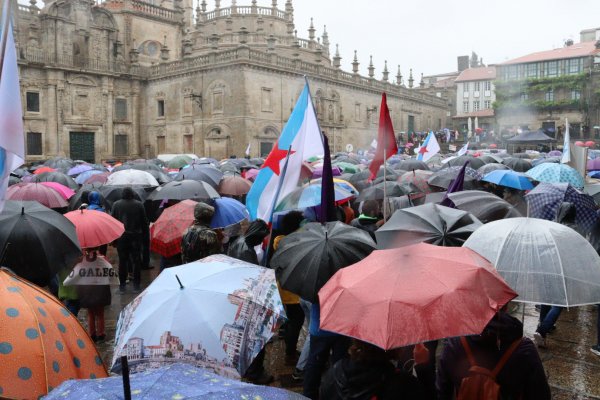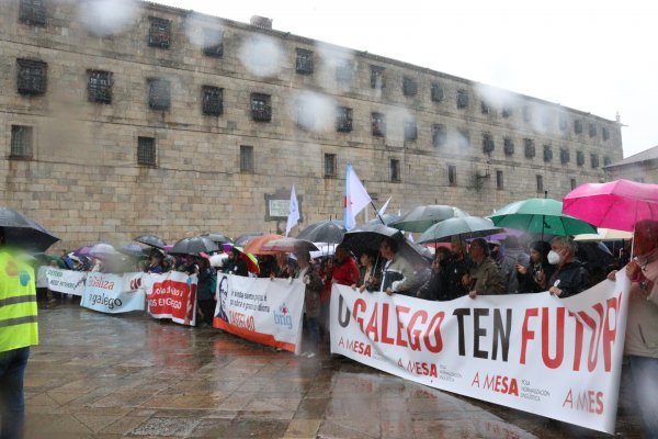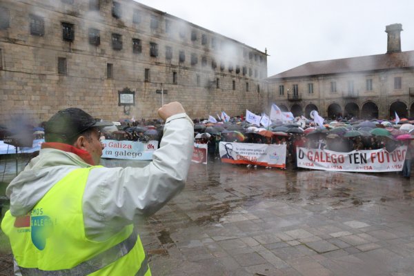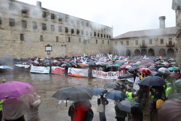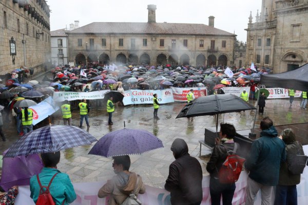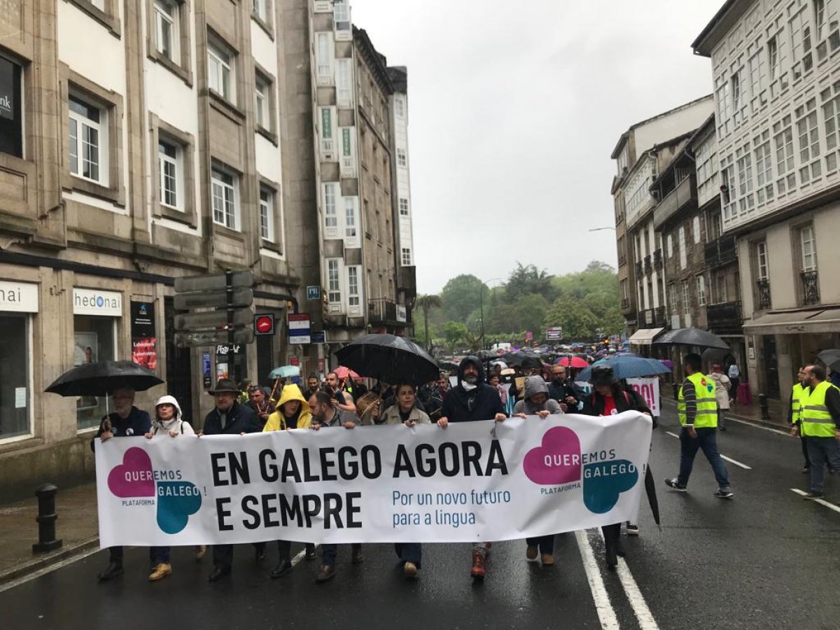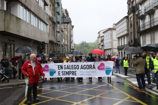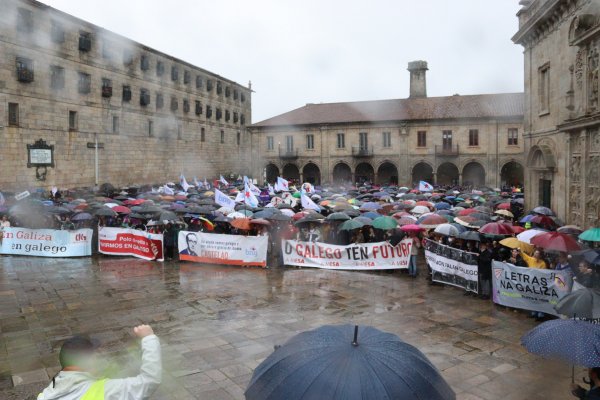 Baixo unha intensa e persistente choiva, milleiros de persoas tomaron as rúas de Compostela para celebrar o Día das Letras Galegas mais tamén para reivindicar “un novo futuro para a lingua” e reclamar o dereito a vivir en galego “agora e sempre”. A manifestación partiu da Alameda compostelá e rematou na praza da Quintana. Un percorrido no que as e os manifestantes proclamaron, máis unha vez: “Na Galiza, en galego”.