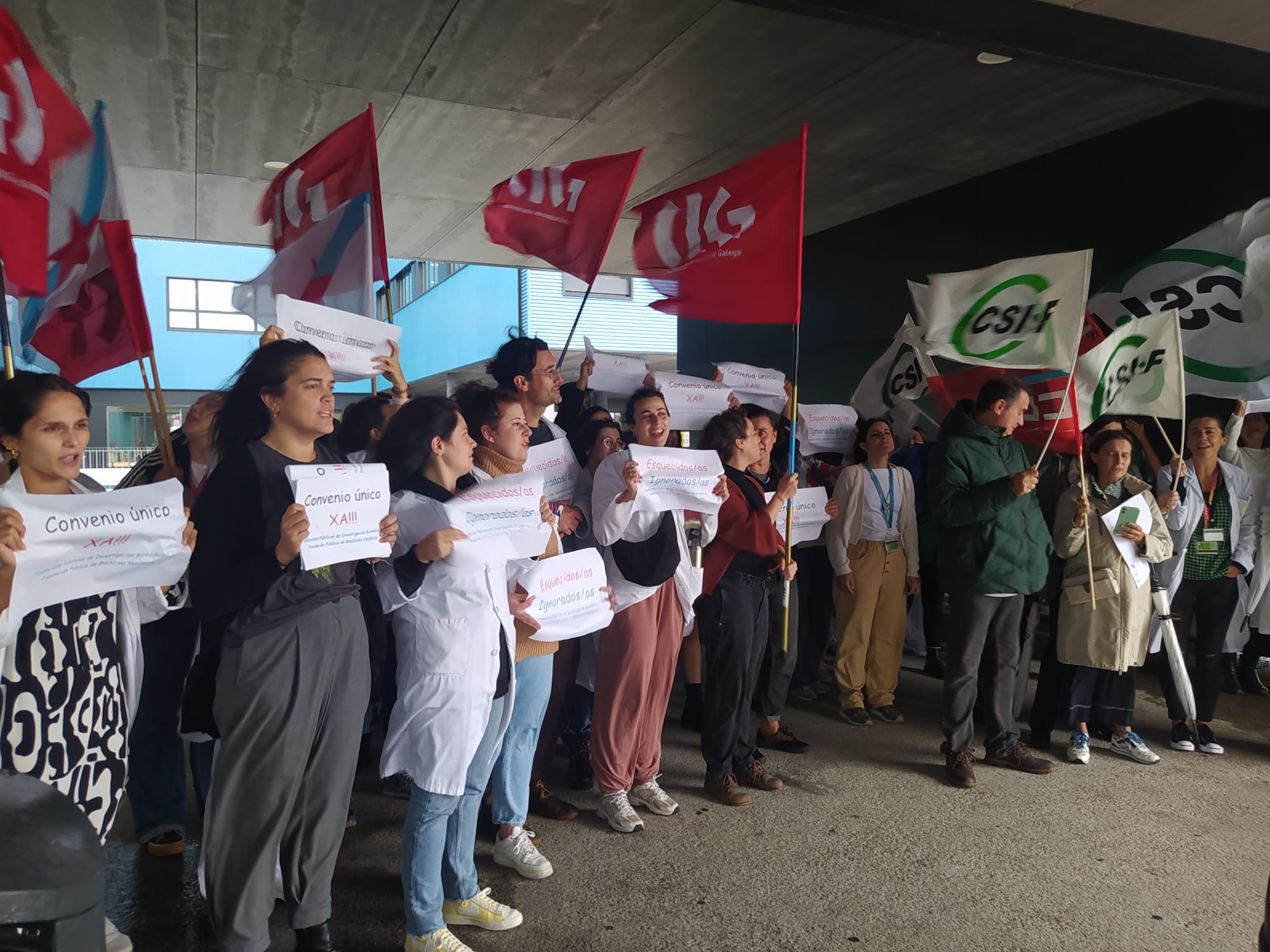 Mentres tanto, este persoal investigador segue sen ter condicións laborais equiparadas ao do persoal estatutario do SERGAS, perciben uns salarios inferiores, non teñen acceso á carreira profesional e non se lles recoñecedo traballado no resto da administración pública para cobrar os seus trienios.