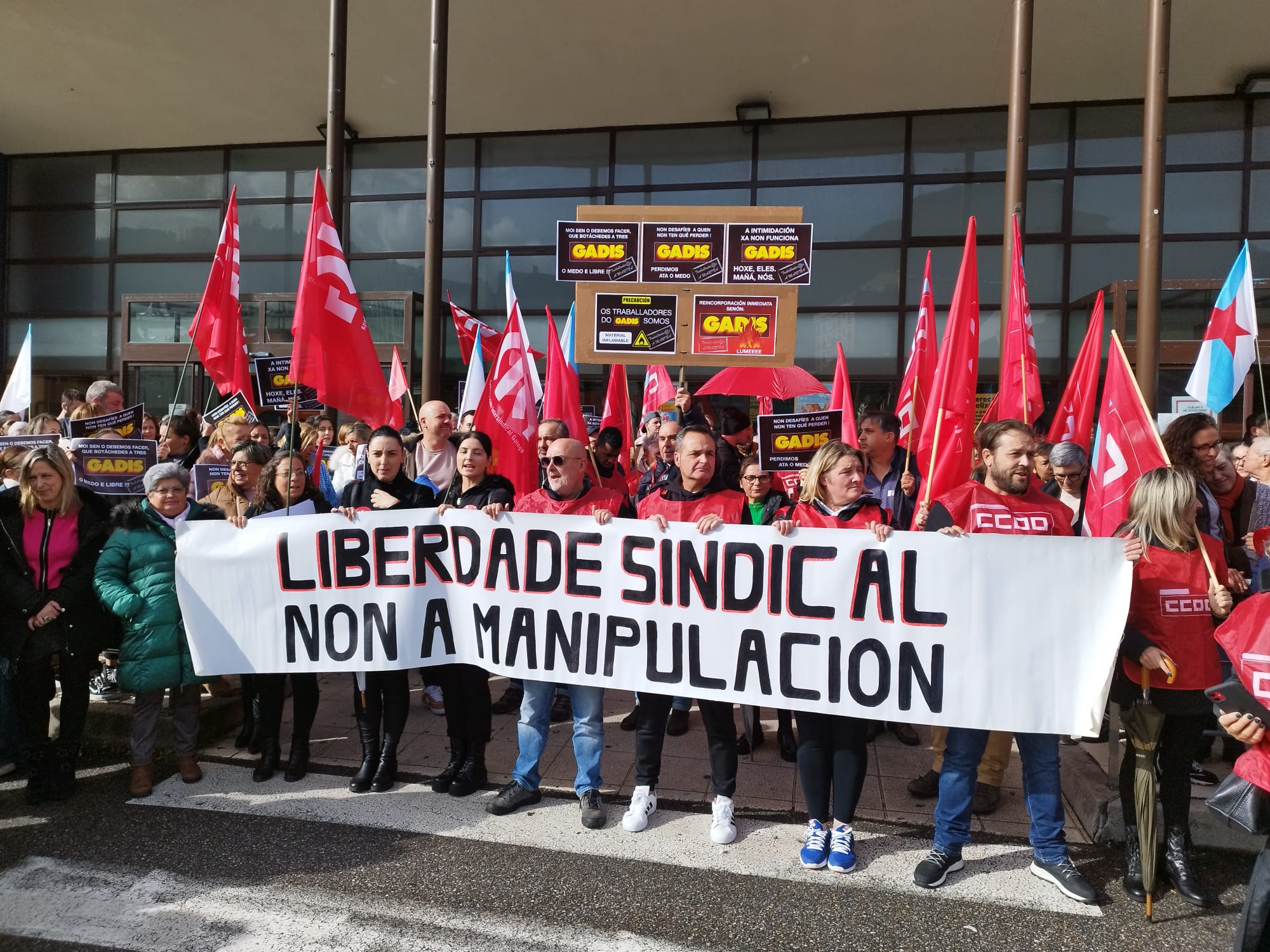 Traballadoras e traballadores de Gadis concentráronse este venres diante do Hiper Gadis de Viveiro para reclamar a readmisión de varios compañeiros e compañeiras despedidas en represalia pola súa intención de presentarse nas candidatuas de CIG e CCOO. Na protesta, convocada por ambas centrais, demandouse o cese inmediato destas prácticas antisindicais e que se respecten as liberdades e dereitos das e dos traballadores.