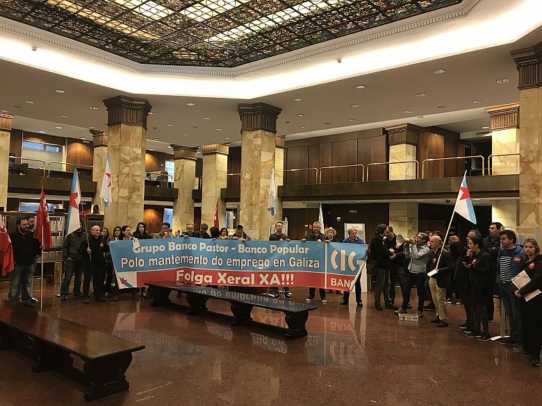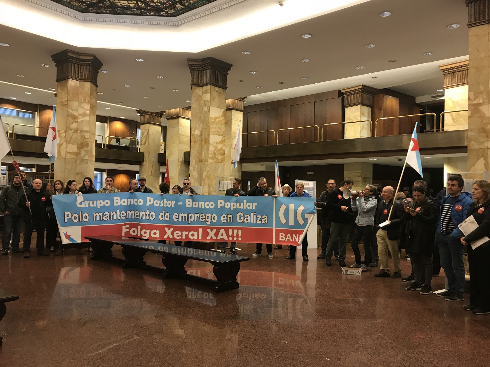 Ao inicio da protesta diante do Banco Pastor, os delegados e delegadas da central ocuparon durante unha media hora as oficinas da entidade coreando consignas contra o desmantelamento do Pastor, en defensa do emprego, e para esixir a intervención do Goberno galego neste novo espolio ao noso sector financeiro.