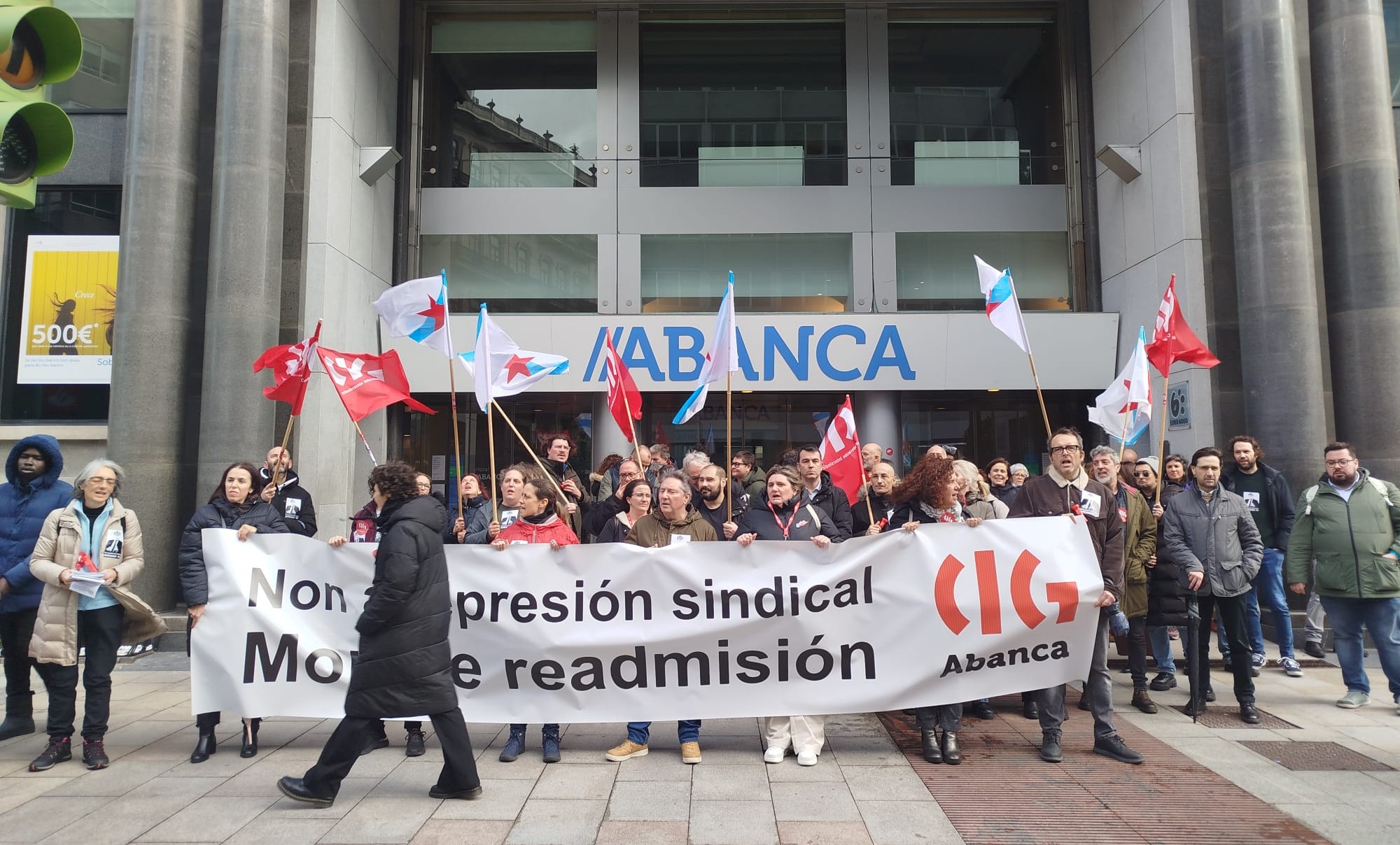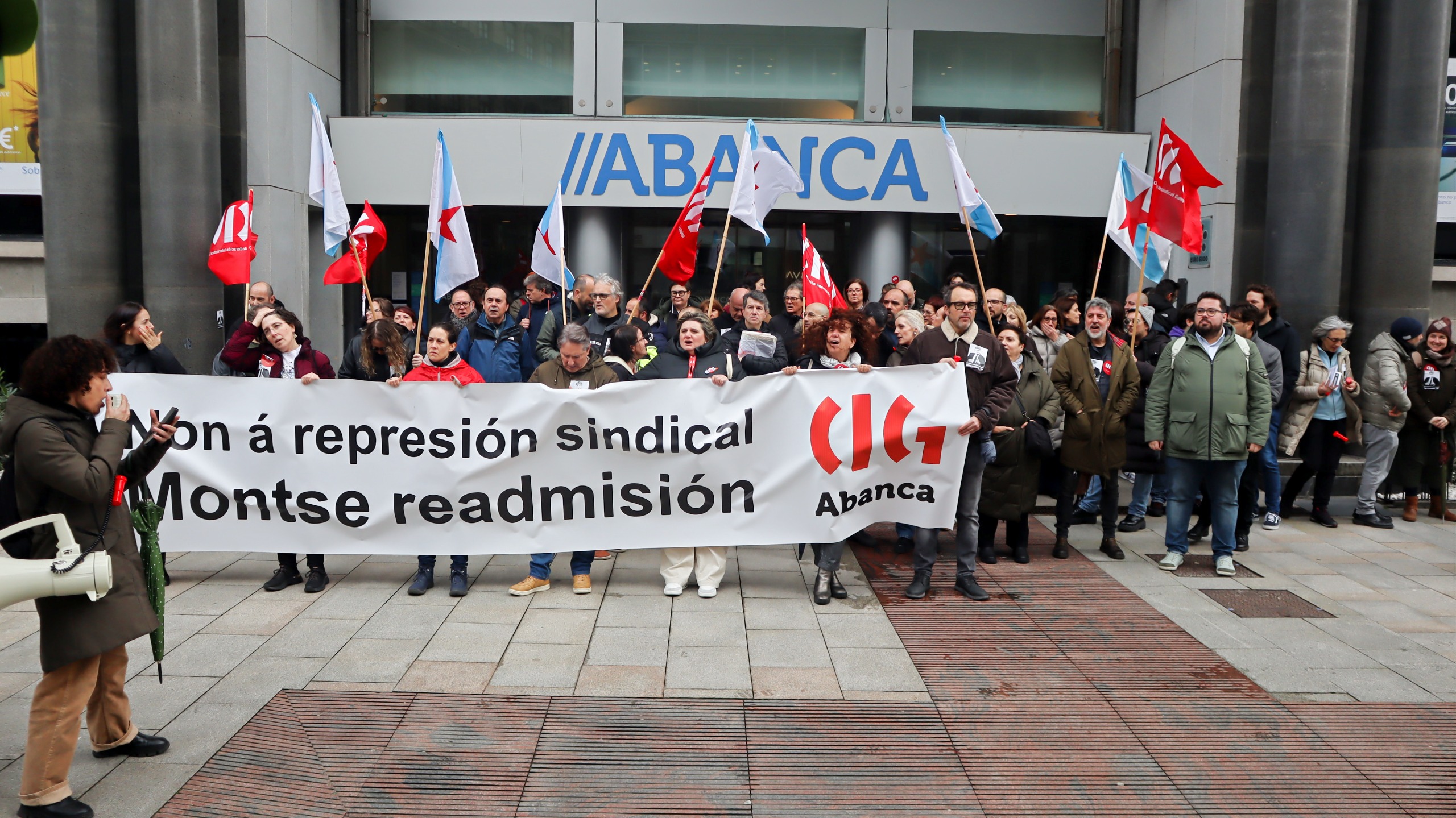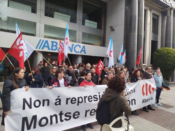 A protesta tivo lugar de 11:30 a 12:30 horas no exterior das instalacións centrais do banco ao berro de “Non é un despido, é unha cacería”, “Montse readmisión, Abanca represión” e “Represión sindical, terrorismo patronal” para rexeitar un proceso contra a empregada “propio dos tempos da Inquisición” xa que a compañeira “non puido coñecer nin os feitos concretos que se lle imputaron, colocándoa nunha clara situación de indefensión”, tal e como sinalan dende a central sindical.
