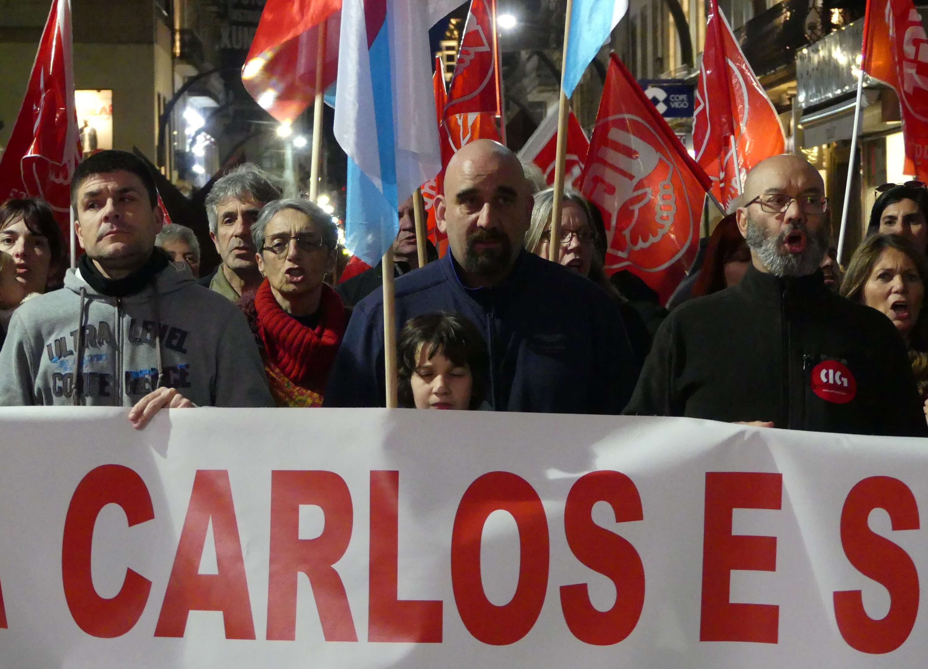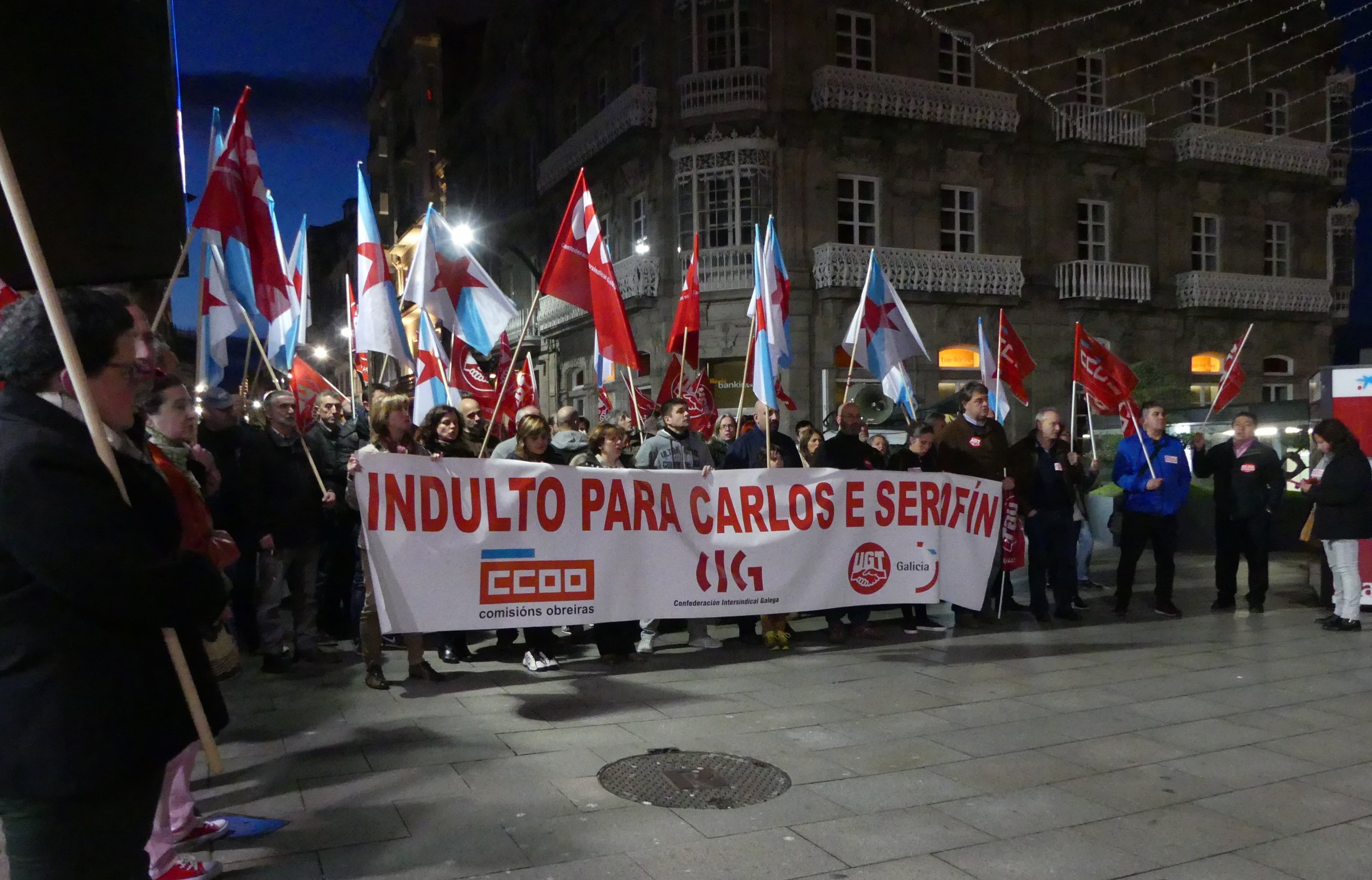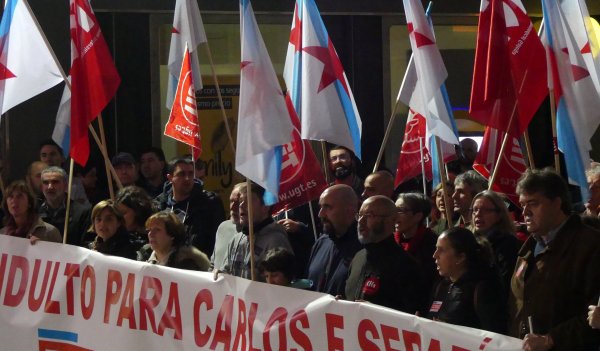 Arredor dun cento de persoas volveron amosar hoxe en Vigo a súa solidariedade con Carlos Rivas e Serafín Rodríguez, os dous traballadores condenados a tres anos de cadea pola súa participación na folga provincial do transporte en 2008. Os asistentes á concentración celebrada esta tarde na cidade reclamaron a berros a concesión dun indulto que evitaría a súa entrada en prisión. “Non son ladróns, son traballadores!”, “A represión non é a solución” e “Indulto xa!” foron de novo as consignas máis coreadas durante unha mobilización que se desenvolveu a carón da farola de Urzaiz de 19.30 a 20.00 horas.