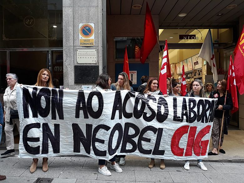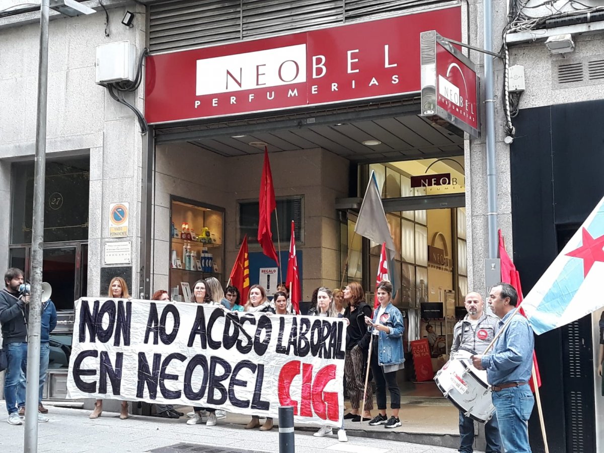 A CIG-Servizos e traballadoras da empresa Perfumerías Neobel, do grupo Perfumerías Avenida, desenvolveron este xoves unha nova concentración, diante da tenda que a cadea ten na República do Salvador en Compostela, para protestar contra o acoso laboral. Na empresa hai 6 traballadoras de baixa dun total de 12 que conforman o cadro de persoal, 4 delas polo acoso laboral sufrido na empresa.