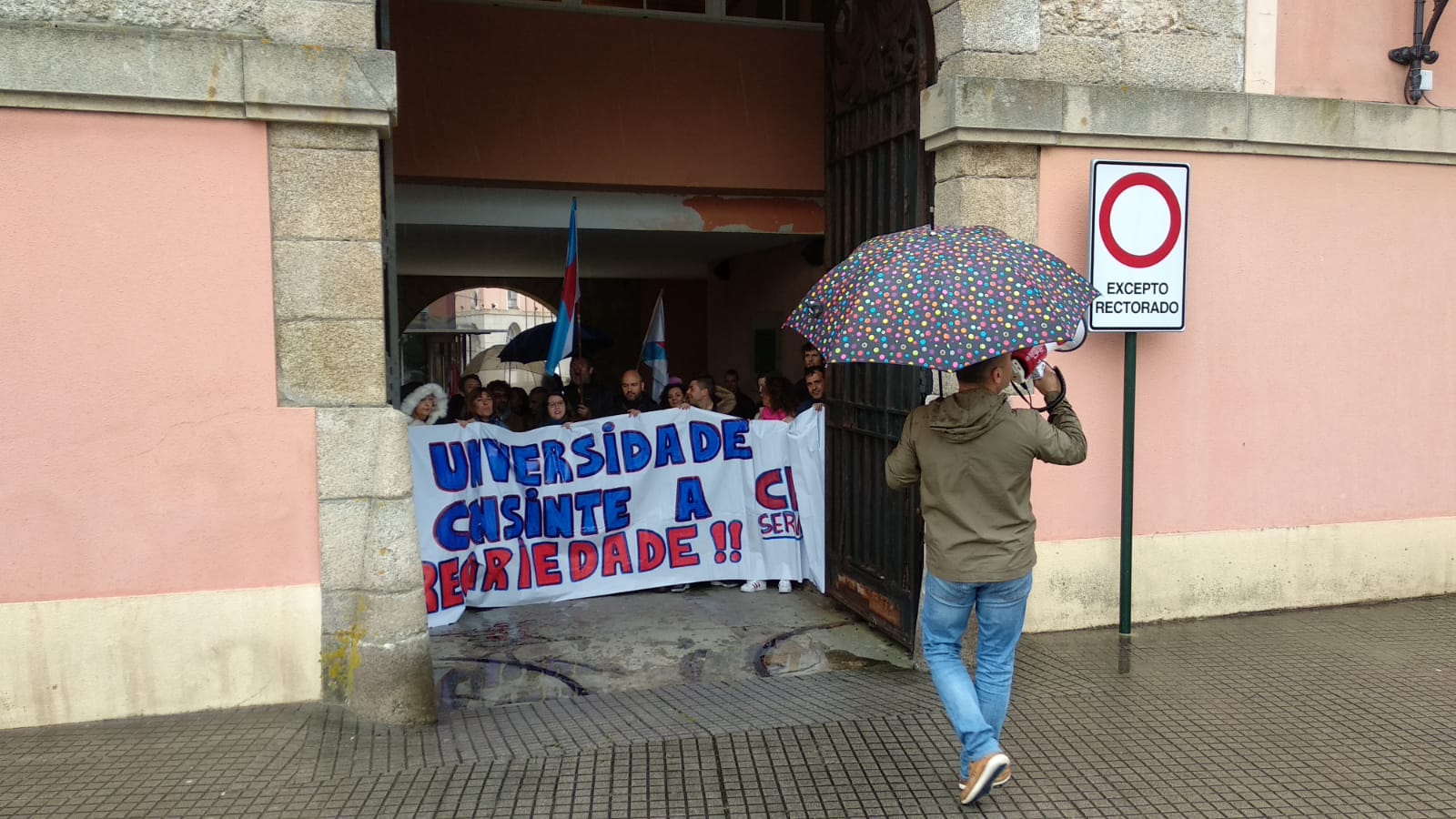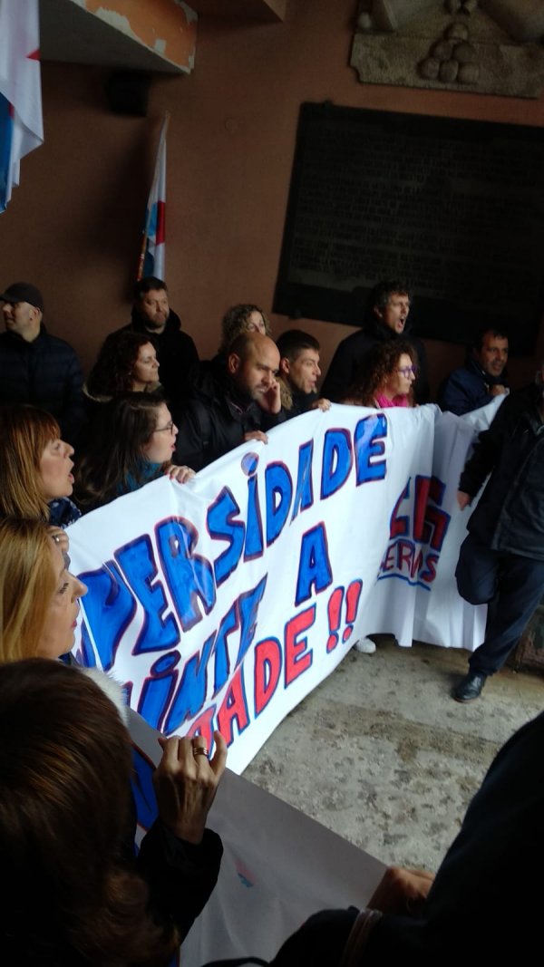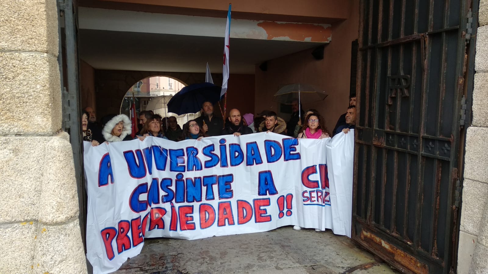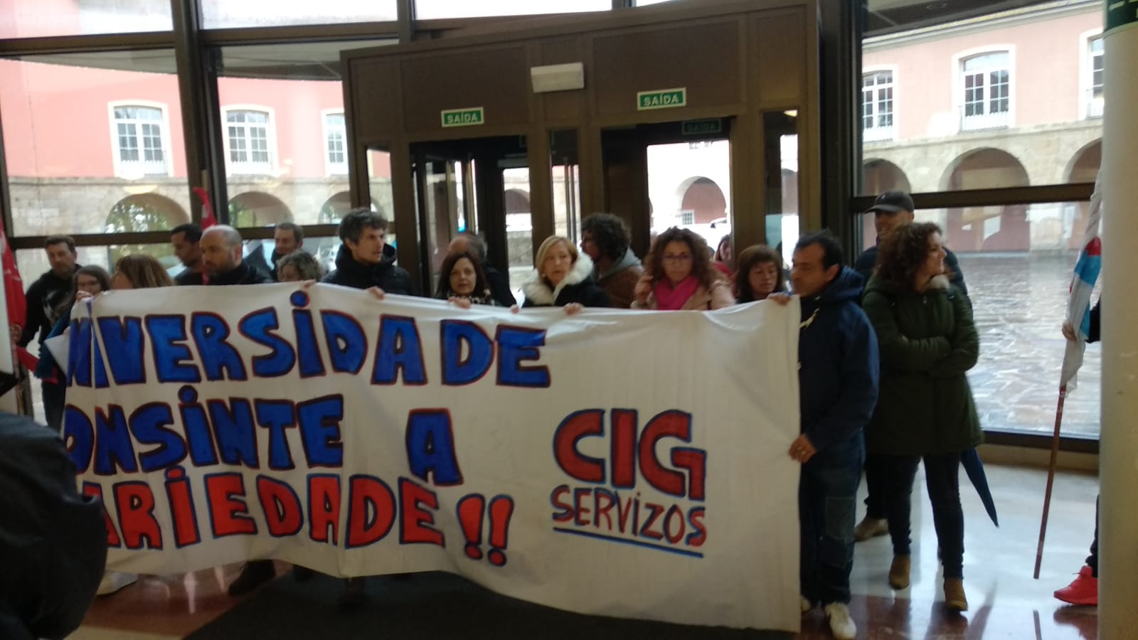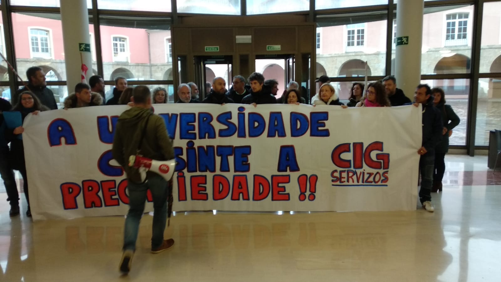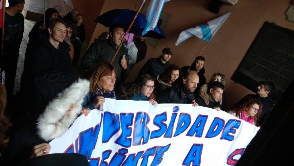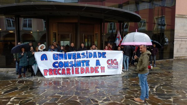 A concentración desenvolveuse diante do reitorado, mais en determinado momento trasladouse até o recibidor do edificio. Só despois deste movemento foi que o reitor chamou para falar cunha representación do persoal, con que se comprometeu a manter unha xuntanza (previsibelmente ao longo da vindeira semana) para abordar a problemática laboral nos servizos auxiliares, tras o despedimento de 12 traballadoras/es ((5 do campus de Ferrol e 7 da Coruña) pola nova adxudicataria.