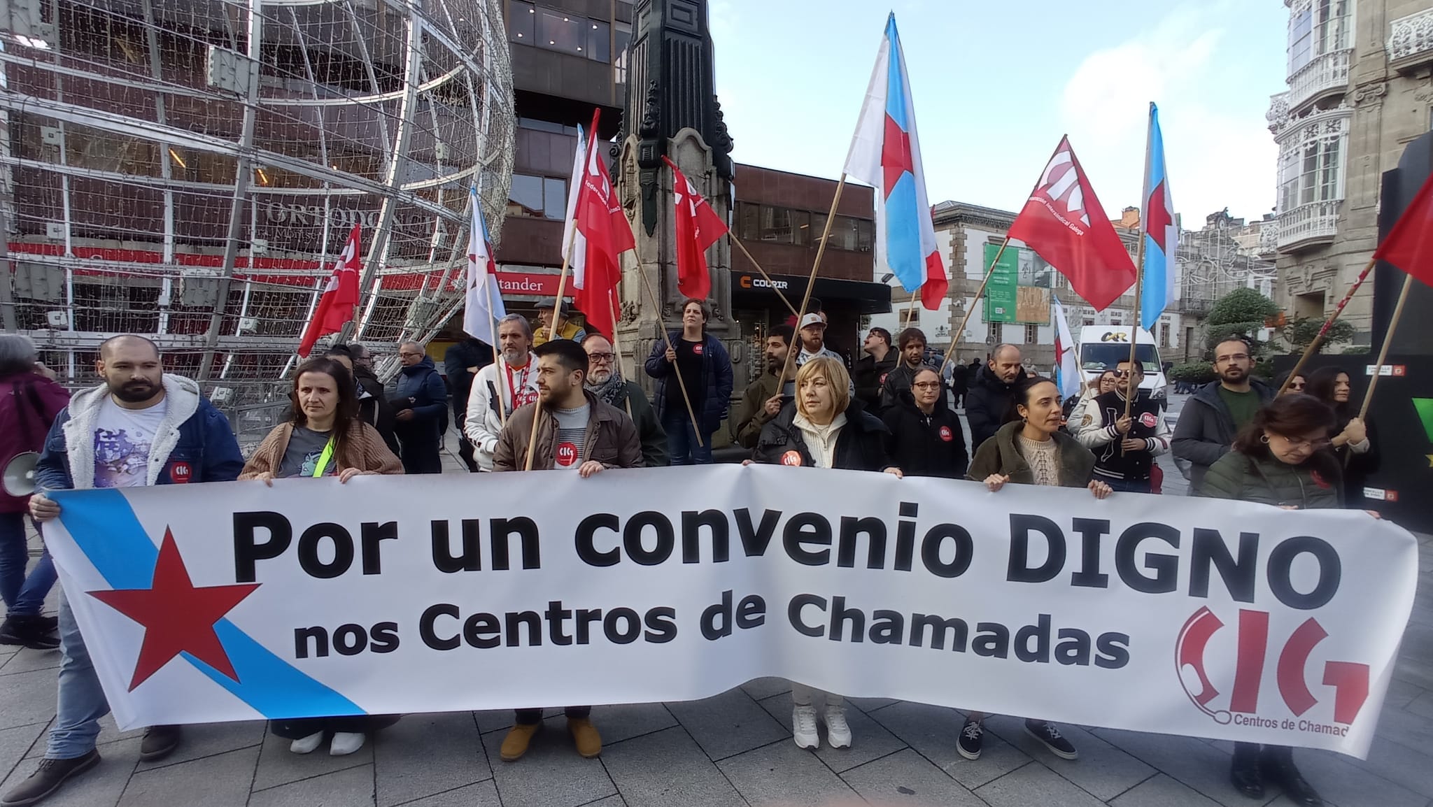 Traballadoras e traballadores dos centros de chamadas volveron colgar este luns os cascos para exixir un convenio digno e con dereitos. Despois de tres anos de negociación e preto de 30 reunións, a patronal teima na súas propostas de miseria que condenan o persoal á precariedade laboral e salarial. Por iso, hoxe secundaron esta nova xornada de folga, na que a CIG tamén realizou concentracións na Coruña e Vigo.