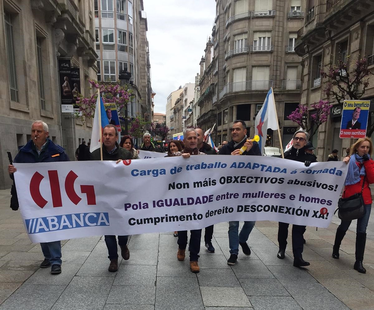 O conflito en Abanca continúa. Un grupo de delegados/as da CIG na entidade de capital venezolano percorreron as rúas da cidade de Ourense este xoves 4 de abril, concentrándose diante de sete oficinas en protesta pola política comercial da entidade, nomeadamente contra os obxectivos de colocacións de produtos financeiros que a clientela non reclama e para demandar a igualdade entre mulleres e homes.