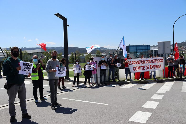 Os traballadores e traballadoras Veolia (auxiliar que se encarga do mantemento de Inditex) están secundando este luns unha folga de 24 horas para demandar a readmisión dun traballador despedido sen motivo, despois de pasar 12 anos facendo o mesmo servizo. Para dar máis visibilidade ás súas reivindicacións, o persoal fixo unha concentración diante da sede do grupo téxtil en Arteixo que contou coa participación solidaria de traballadores e traballadoras doutras contratas e da propia Inditex.