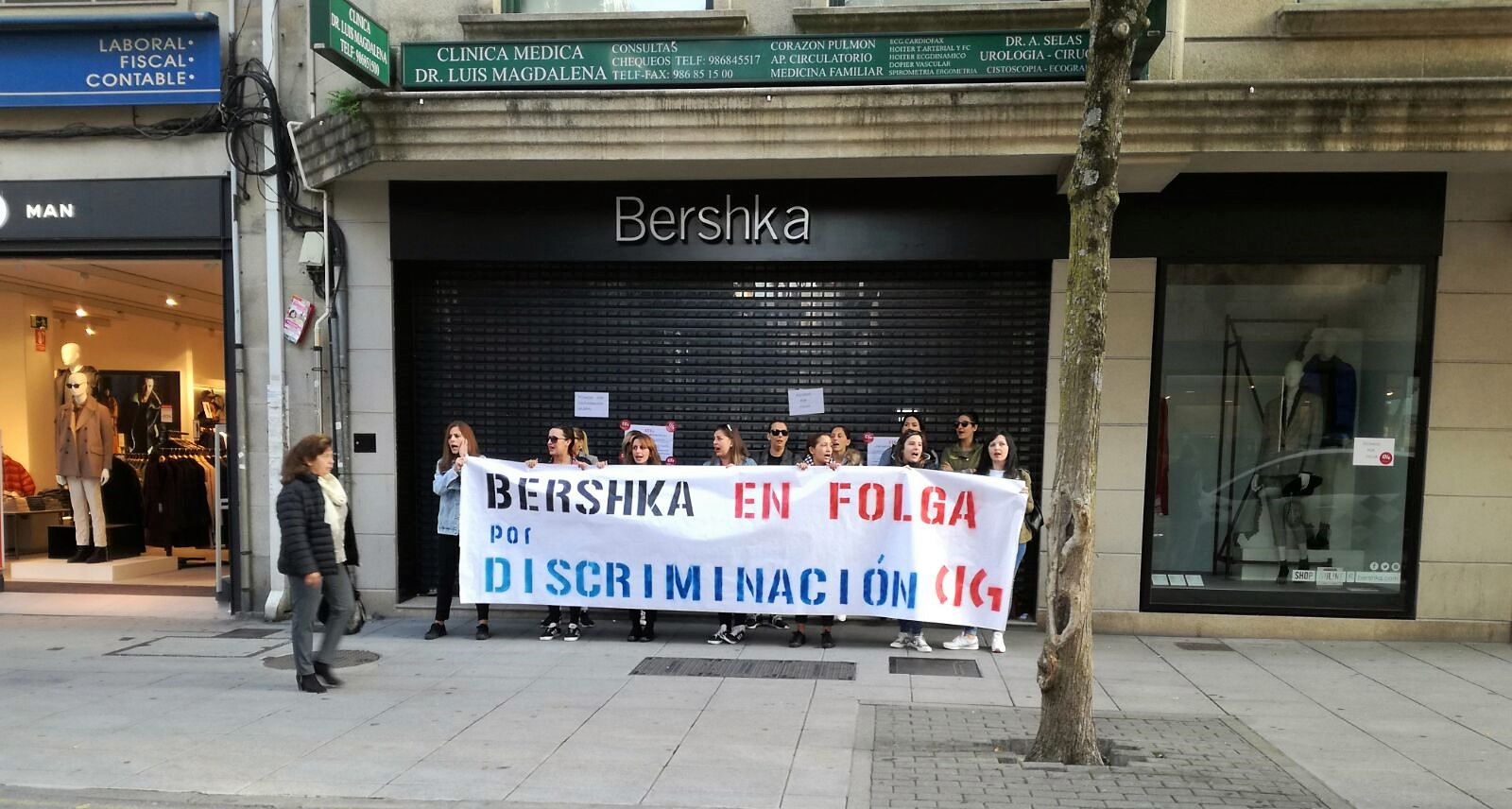 O 100% do cadro de persoal de Bershka na provincia de Pontevedra, integrado por unhas 65 traballadoras/es, secundou a segunda xornada da folga indefinida convocada contra a discriminación laboral na empresa pertencente ao grupo téxtil Inditex. Ao igual que no día de onte, grupos de empregadas/es concentráronse dende primeira hora diante das cinco tendas que a marca ten na provincia (Vigo, Pontevedra e Vilagarcía), que ao igual que no día de onte non abriron as súas portas.