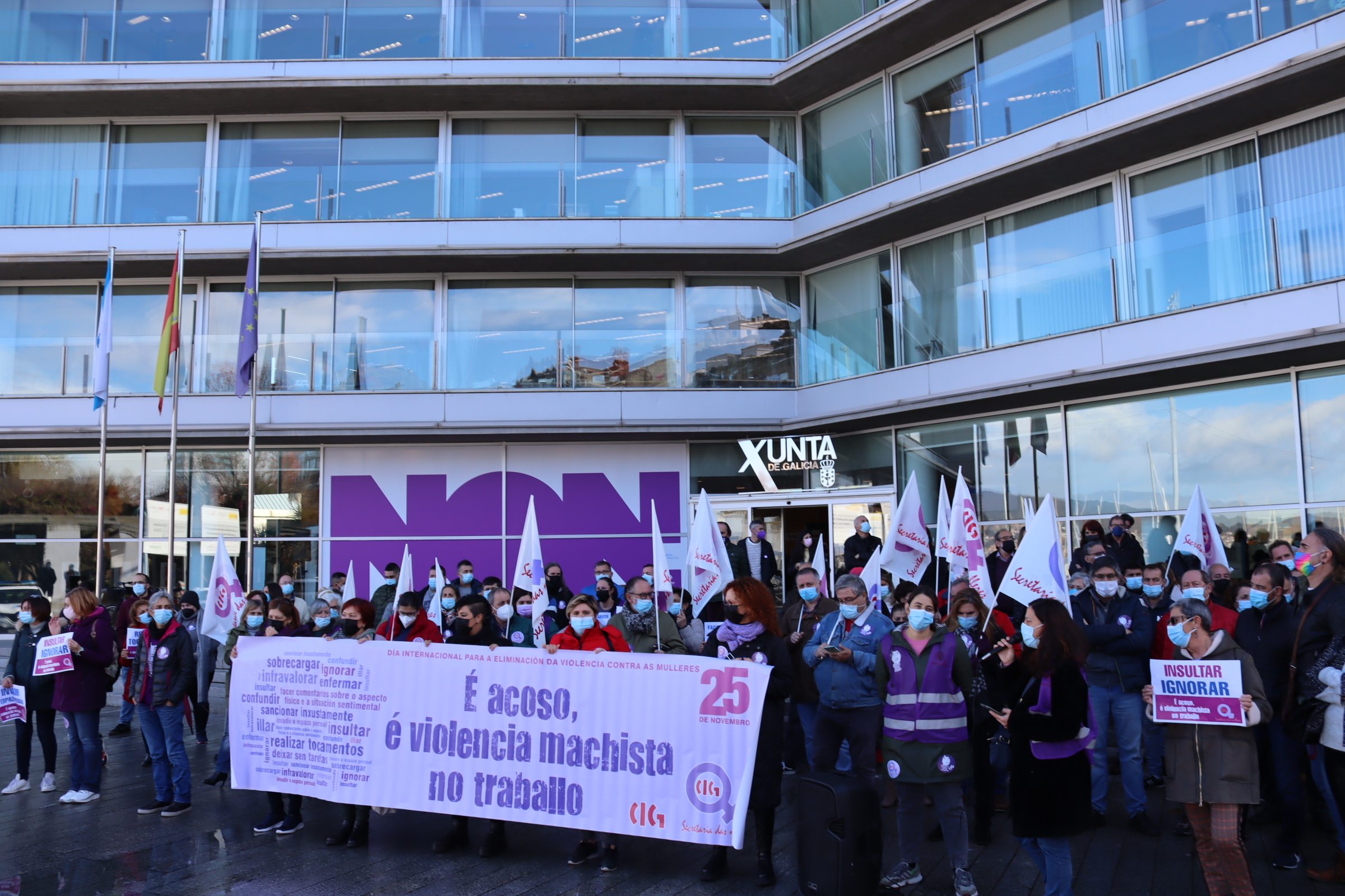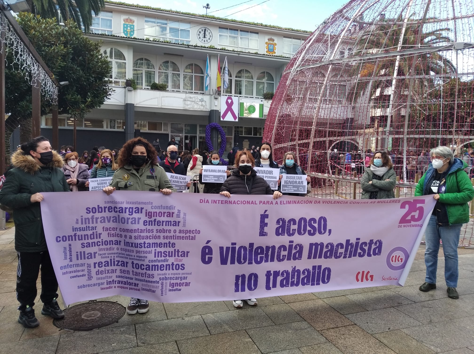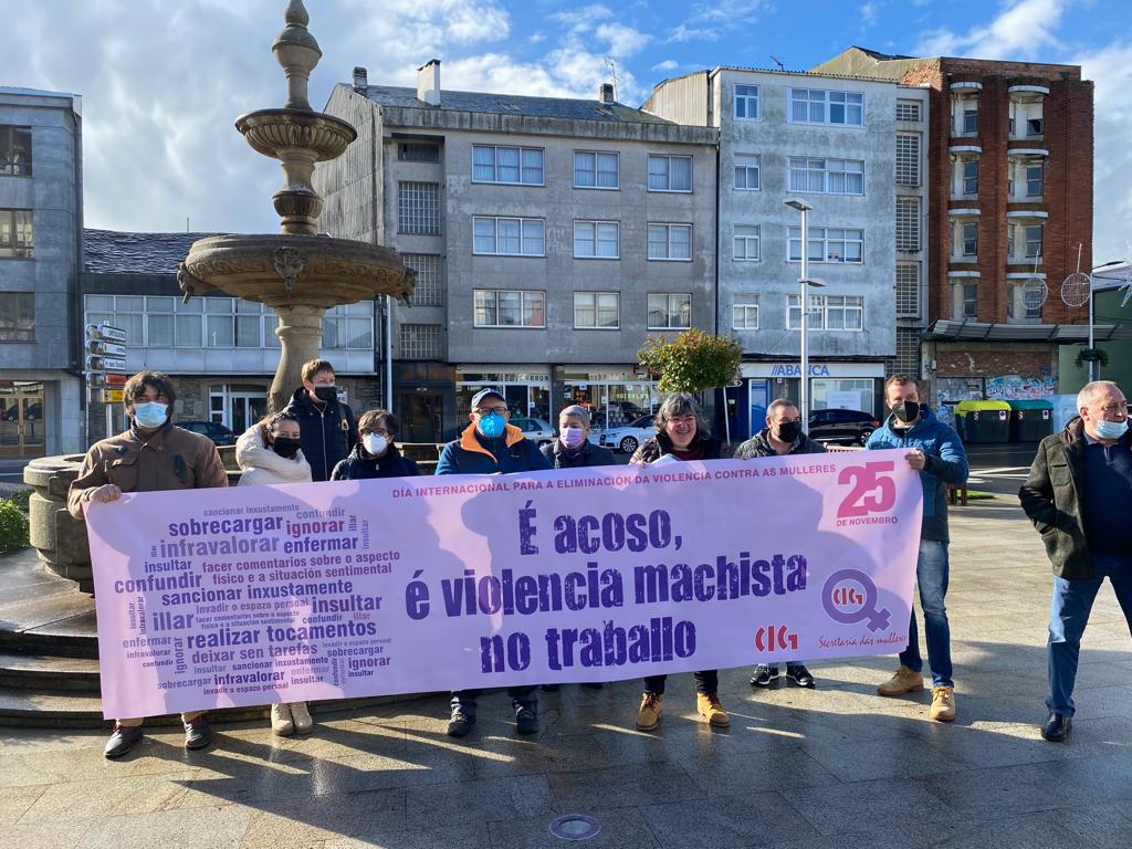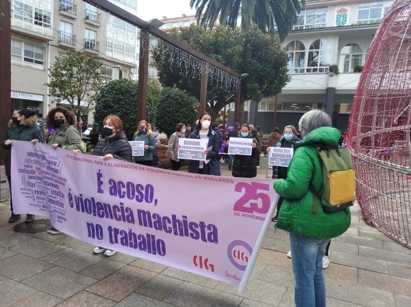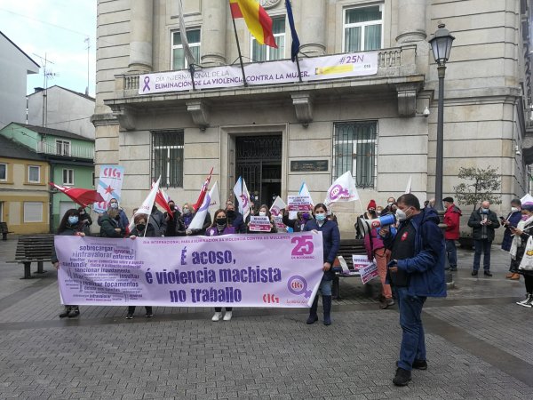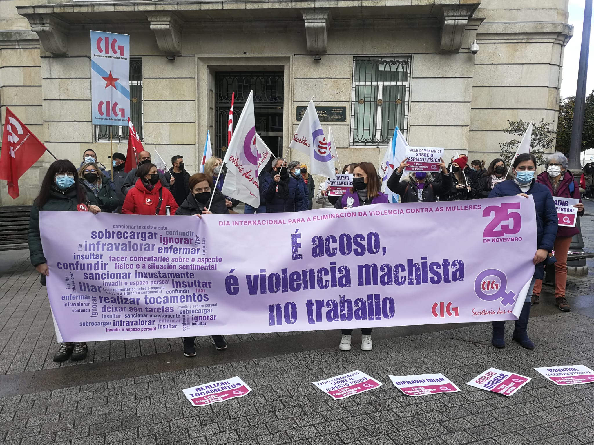 A secretaría das mulleres da CIG desenvolveu esta mañá concentracións en nove localidades galegas para denunciar o acoso que sofren as mulleres no ámbito laboral. Celebrou ademais asembleas en todas as comarcas para abordar este tema que centra a campaña que, baixo o lema “ É acoso, é violencia machista no traballo”, desenvolve a central sindical arredor do Día Internacional para a Eliminación da Violencia contra as Mulleres.