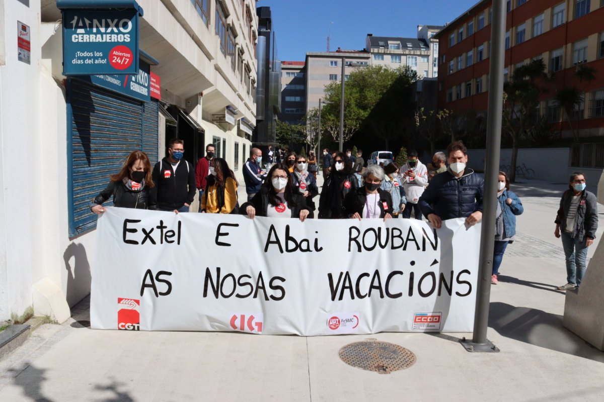 O comité de Extel (AbaiGroup) na Coruña realizou unha concentración este venres diante do SMAC con motivo do acto de conciliación polo conflito colectivo presentado contra o novo intento da dirección de recortar dereitos adquiridos polos traballadores e as traballadoras, nesta ocasión relativos ao goce das vacacións.