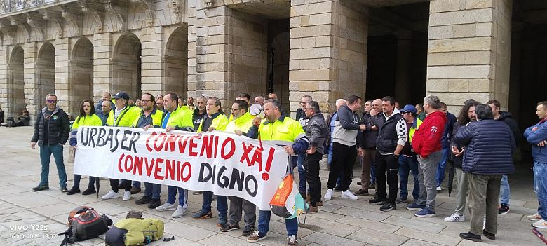 O comité de empresa de Urbaser, concesionaria do servizo de recollida do lixo e limpeza viaria do Concello de Santiago, desenvolveu hoxe unha concentración diante do Pazo de Raxoi para denunciar a parálise na negociación do convenio colectivo. O cadro de persoal esixe respostas inmediatas ante a falta de avances, reclamando melloras laborais que levan meses sen ser atendidas.