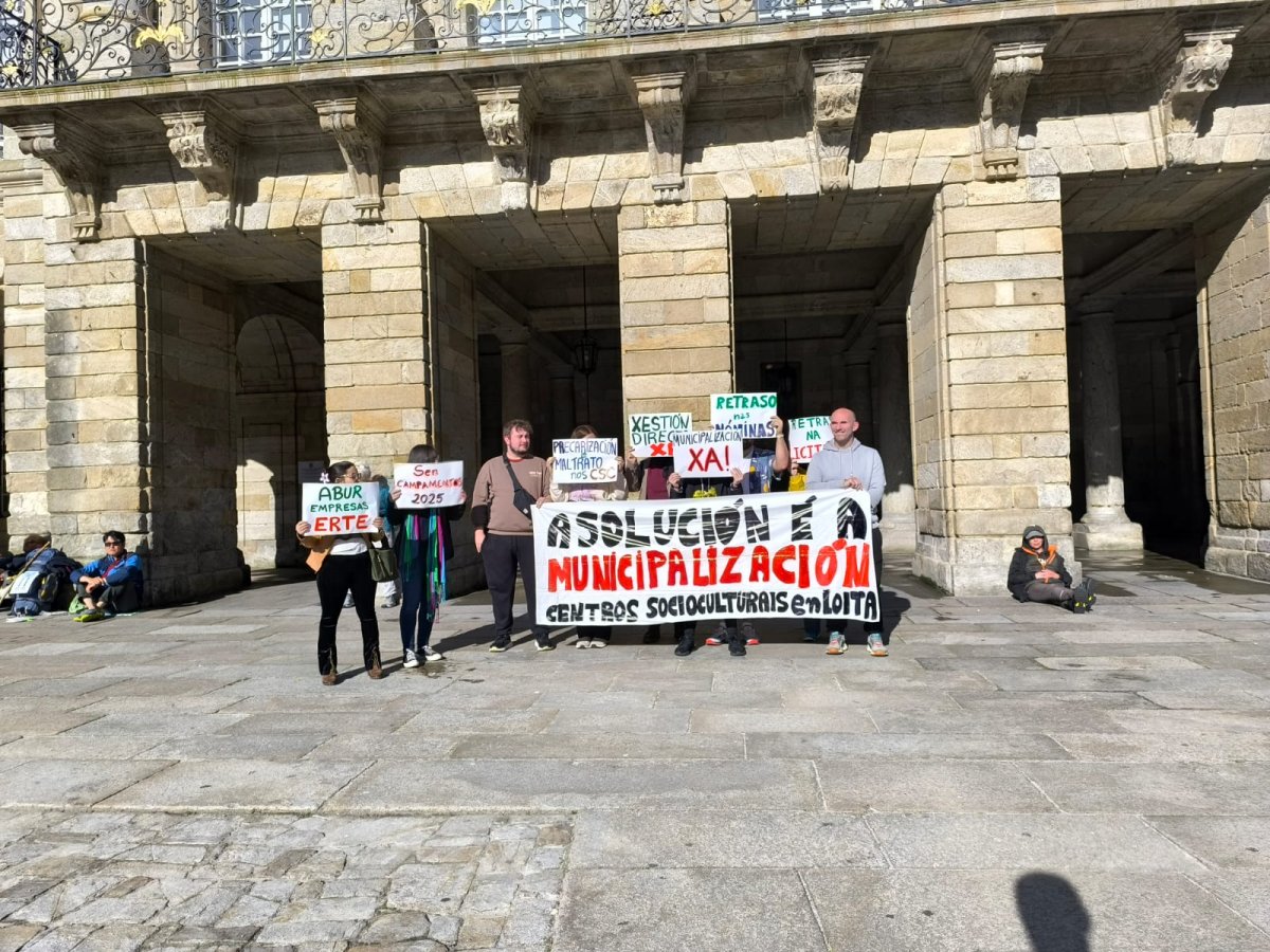 O Comité de Empresa dos Centros Socioculturais de Santiago concentrouse este xoves, 24 de abril, diante do Pazo de Raxoi durante o pleno municipal para denunciar a "situación de abandono" á que está abocada a Rede de Centros Socioculturais, sen solucións á vista. O persoal alerta dunha crise agravada desde febreiro, cando a empresa dos Lotes I e IV (Serviplus) anunciou a súa marcha prematura, deixando o servizo nunha situación "cada vez máis inestable".
