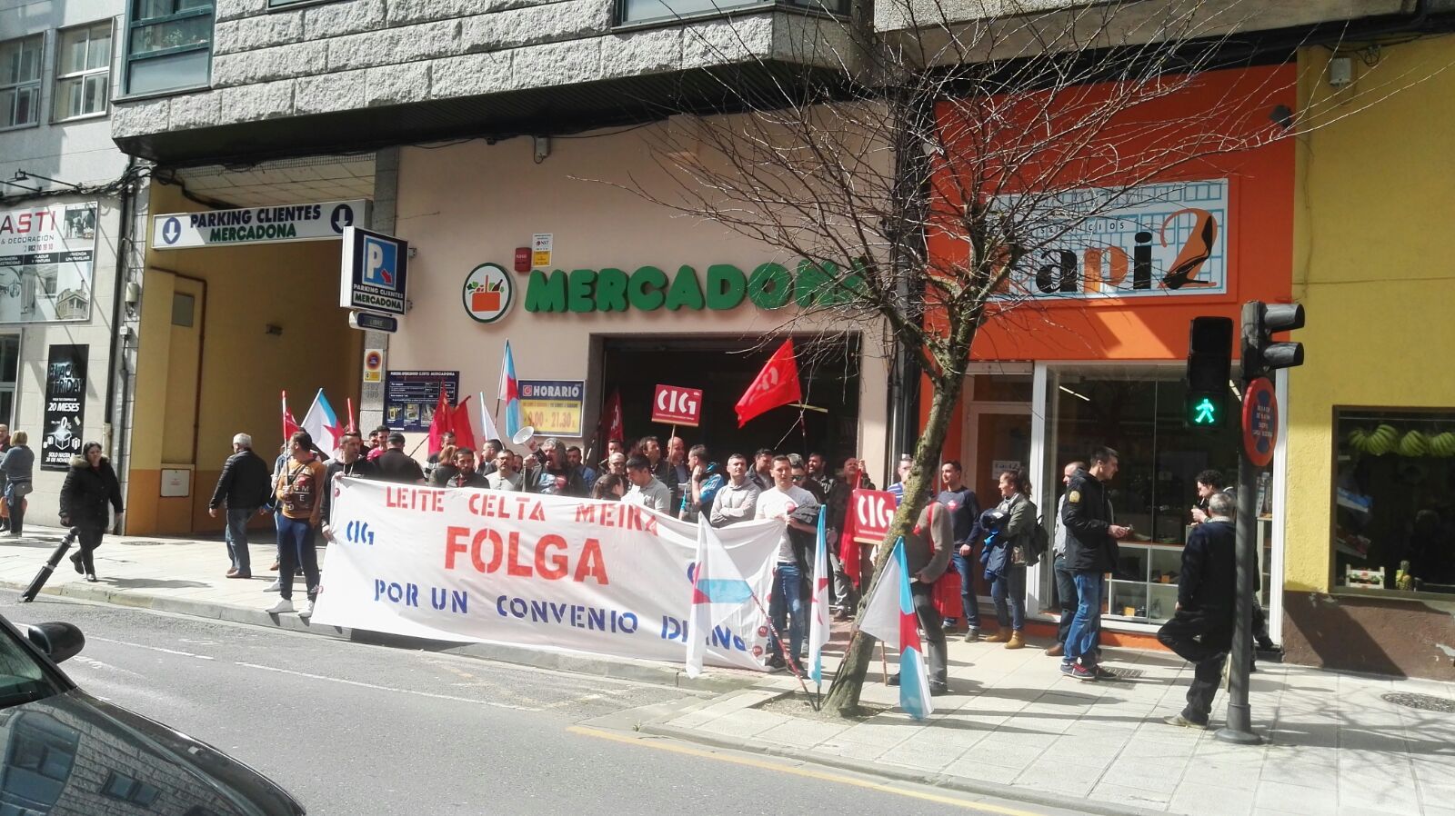O persoal de Leche Celta, en folga indefinida dende o pasado xoves, levou este martes a súa loita por un convenio digno até o supermercado que Mercadona ten na Avenida da Coruña en Lugo, xa que esta empresa é a única cliente da factoría de Meira. Durante a concentración, os traballadores e traballadoras repartiron información sobre o conflito entre a clientela, denunciando que Leche Celta contribúe "a non eliminar as diferenzas salariais entre o seu persoal e con isto, ao mantemento da precariedade laboral na nosa terra".