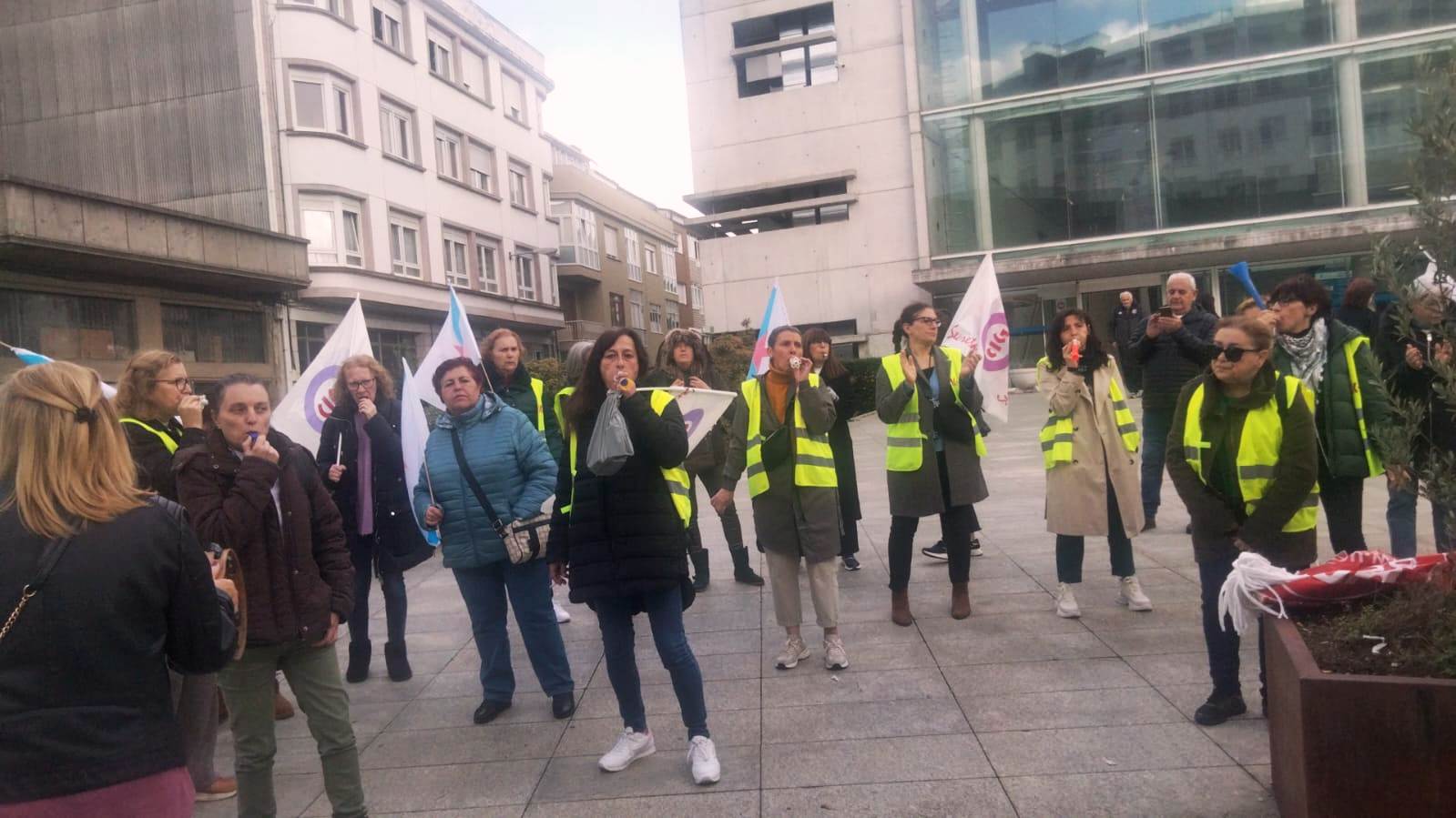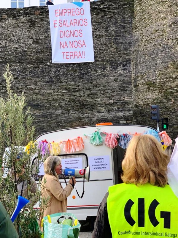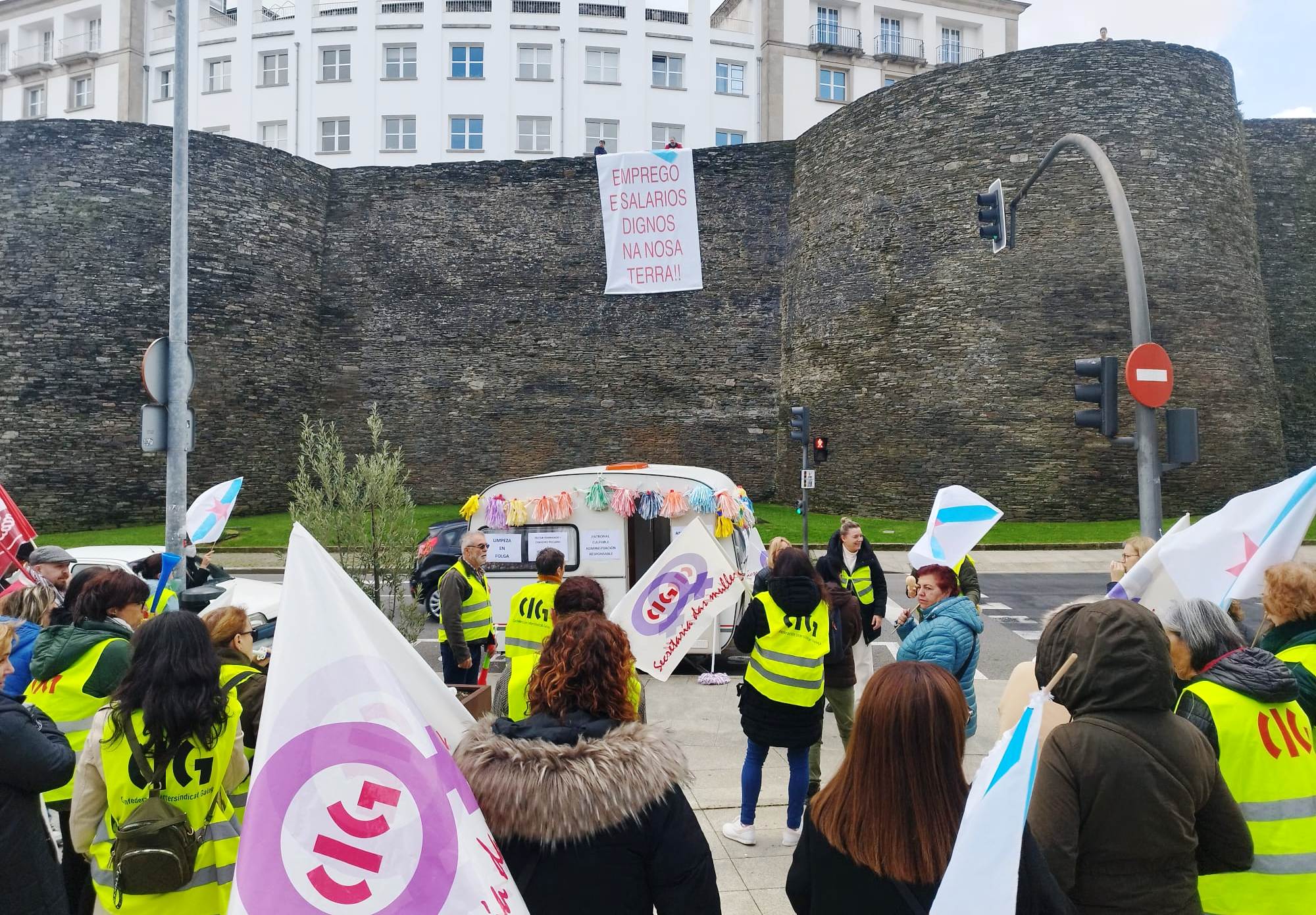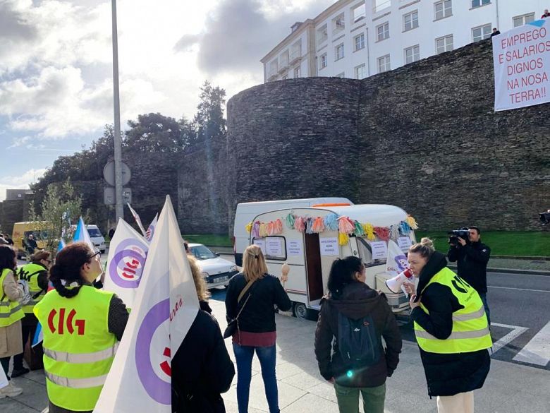 As traballadoras instalaron na mañá deste martes unha caravana reivindicativa diante da explanada do edificio multiusos da Xunta co obxectivo de darlle visibilidade á súa loita e reclamar a intervención da administración autonómica.