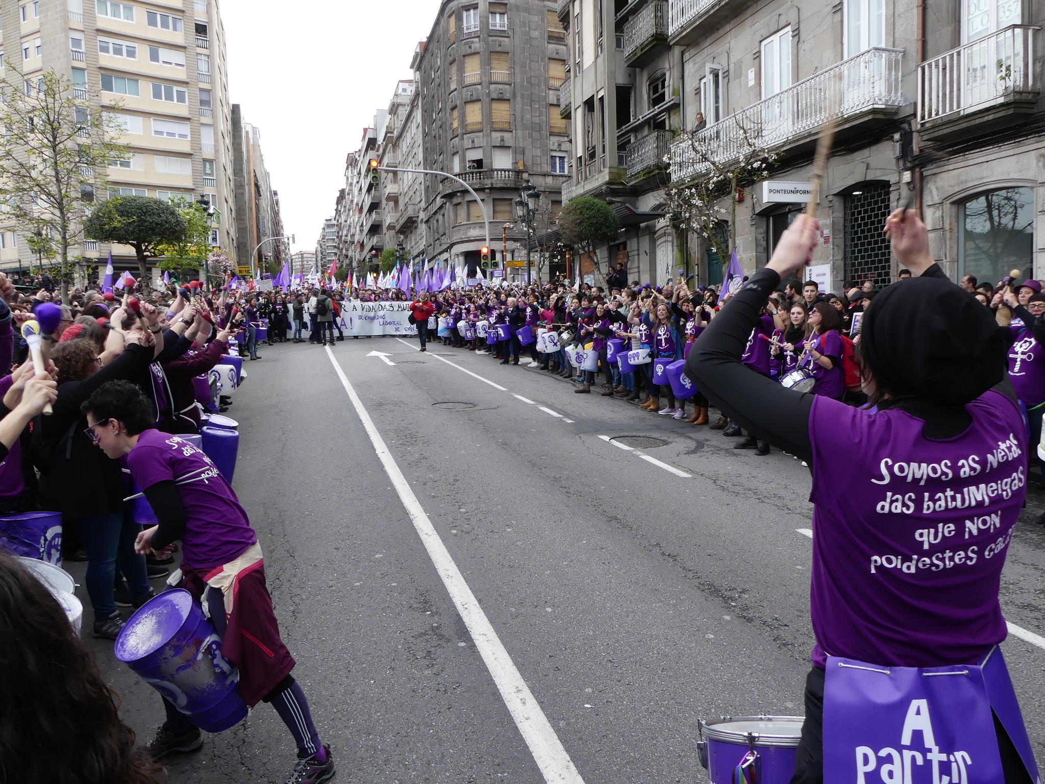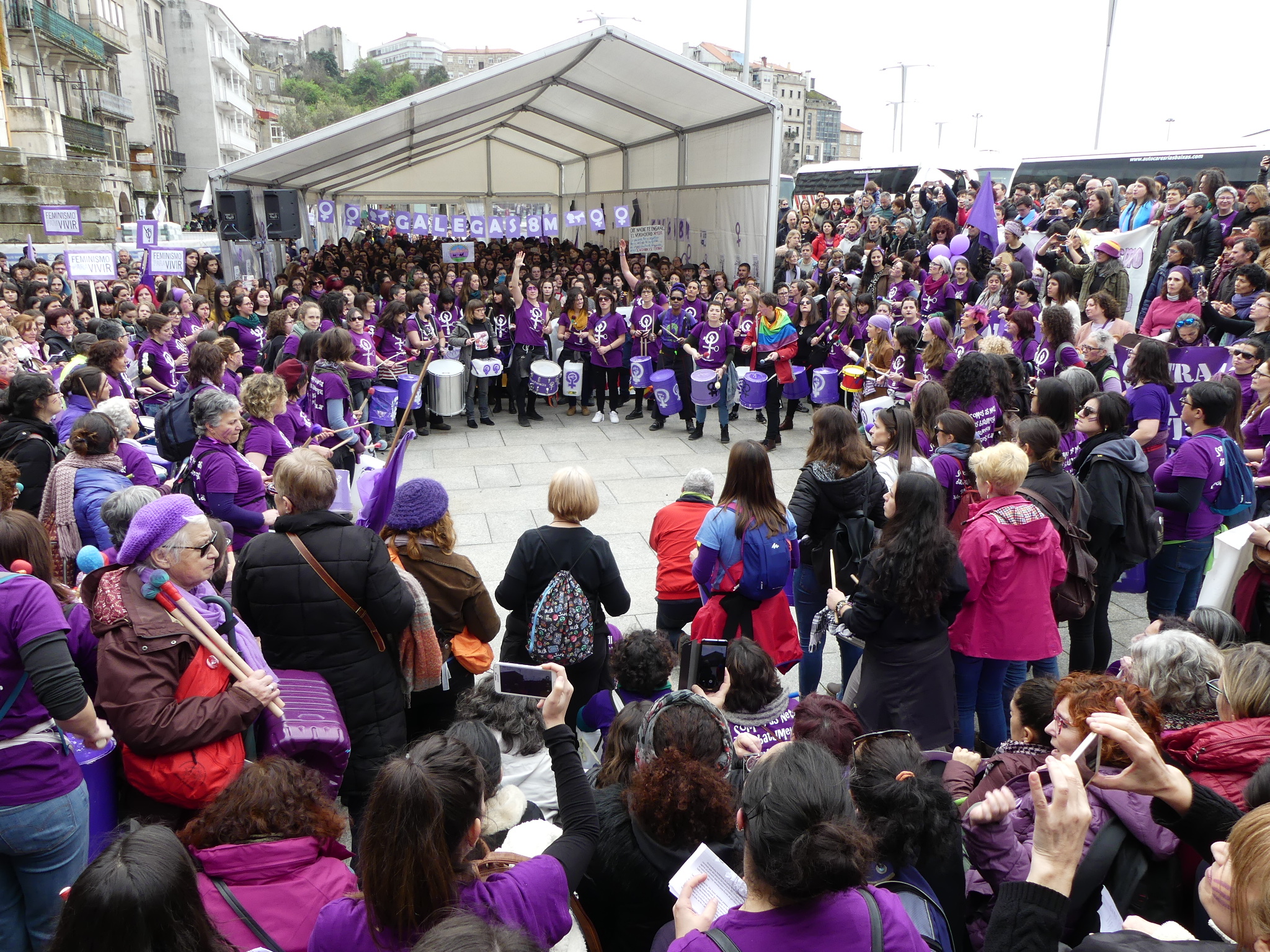 Hoxe ateigamos Vigo, como antesala ao que vai suceder neste 8 de marzo, en sororidade con todas as mulleres que farán paros nesa xornada de folga internacional de mulleres. Hoxe, como todos os 8 de marzo, estamos aquí, en pé de loita, para bater no chan con todas as mulleres do mundo e facer tremer a terra!