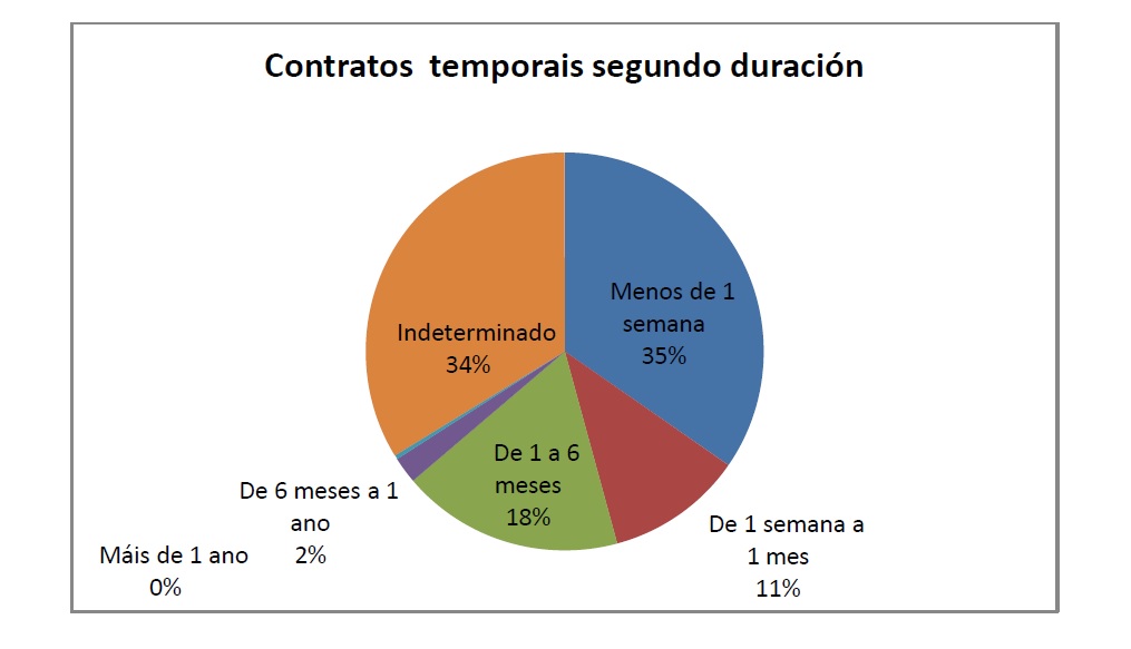 Pero non só existe un abundante número de persoas con contratos a tempo parcial, senón que son de moi escasa duración. De feito, o 35% dos contratos duraron menos dunha semana en 2016. No polo oposto estarían os contratos de máis dun ano que foron o 0,3%, apenas 2.079 contratos. Fronte a isto, no ano 2009 os contratos que duraban menos dunha semana eran o 12,9% do total.