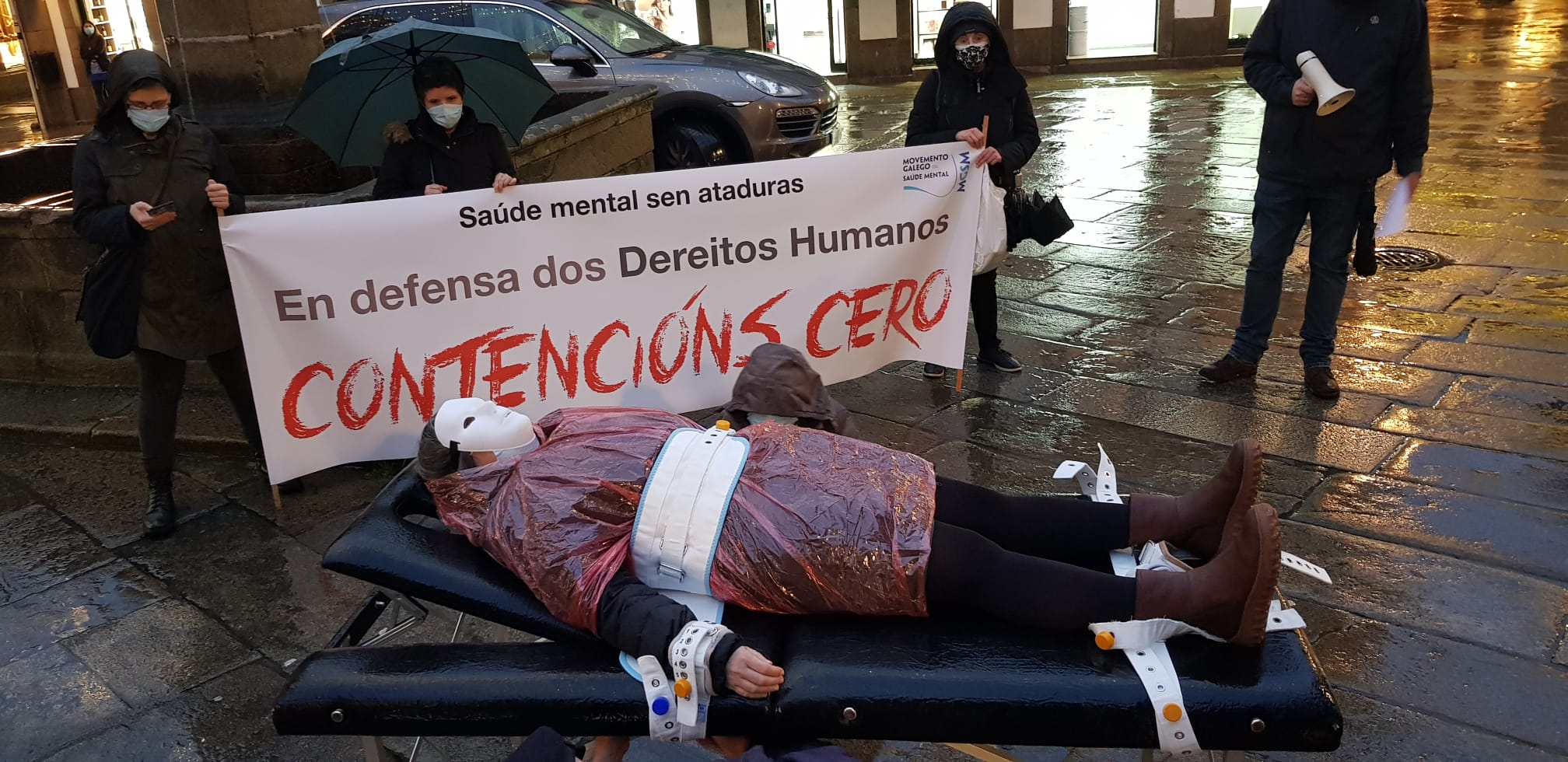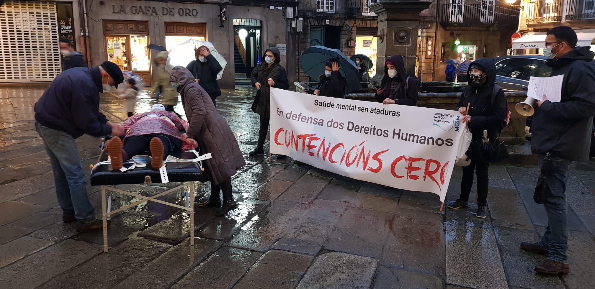 O Movemento Galego pola Saúde Mental conmemoraba este xoves o Día Internacional dos Dereitos Humanos cun acto en repulsa dos métodos de contención mecánica de doentes. Métodos utilizados de forma abusiva no Hospital Pisquiátrico de Conxo e que foron denunciados nesta última semana. No decurso do acto deuse lectura a un manifesto baixo o título “Saúde Mental sen ataduras. Contencións Cero” no que se abonda nesta cuestión mais tamén se denuncia que a situación empeoreou por mor da pandemia.