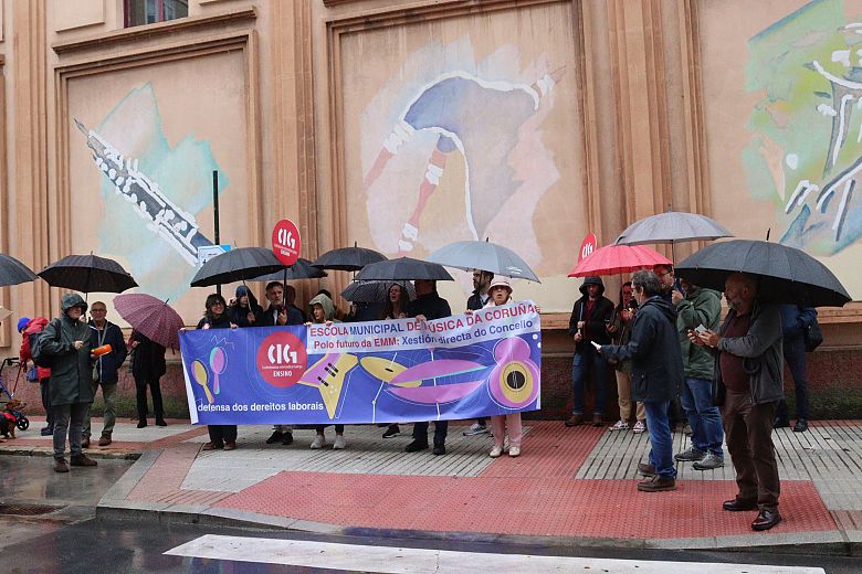 Dentro do calendario de mobilizacións acordado, o persoal da Escola Municipal de Música da Coruña concentrouse este mércores diante do centro educativo para exixir a xestión directa por parte do Concello, que se lle asigne o orzamento necesario para ofertar unha ensinanza pública e de calidade e para demandar que se respecten os dereitos laborais.