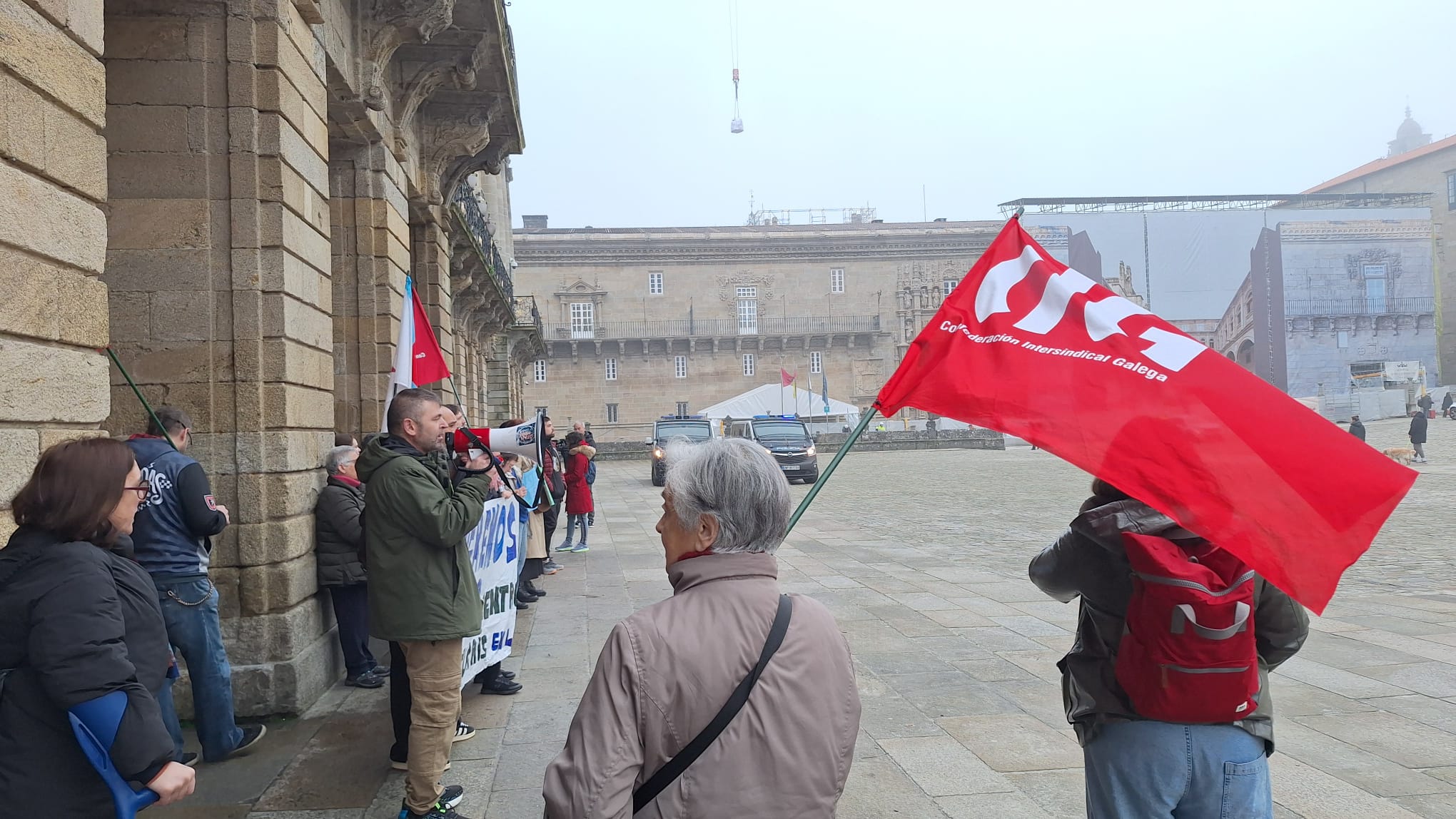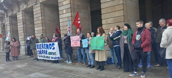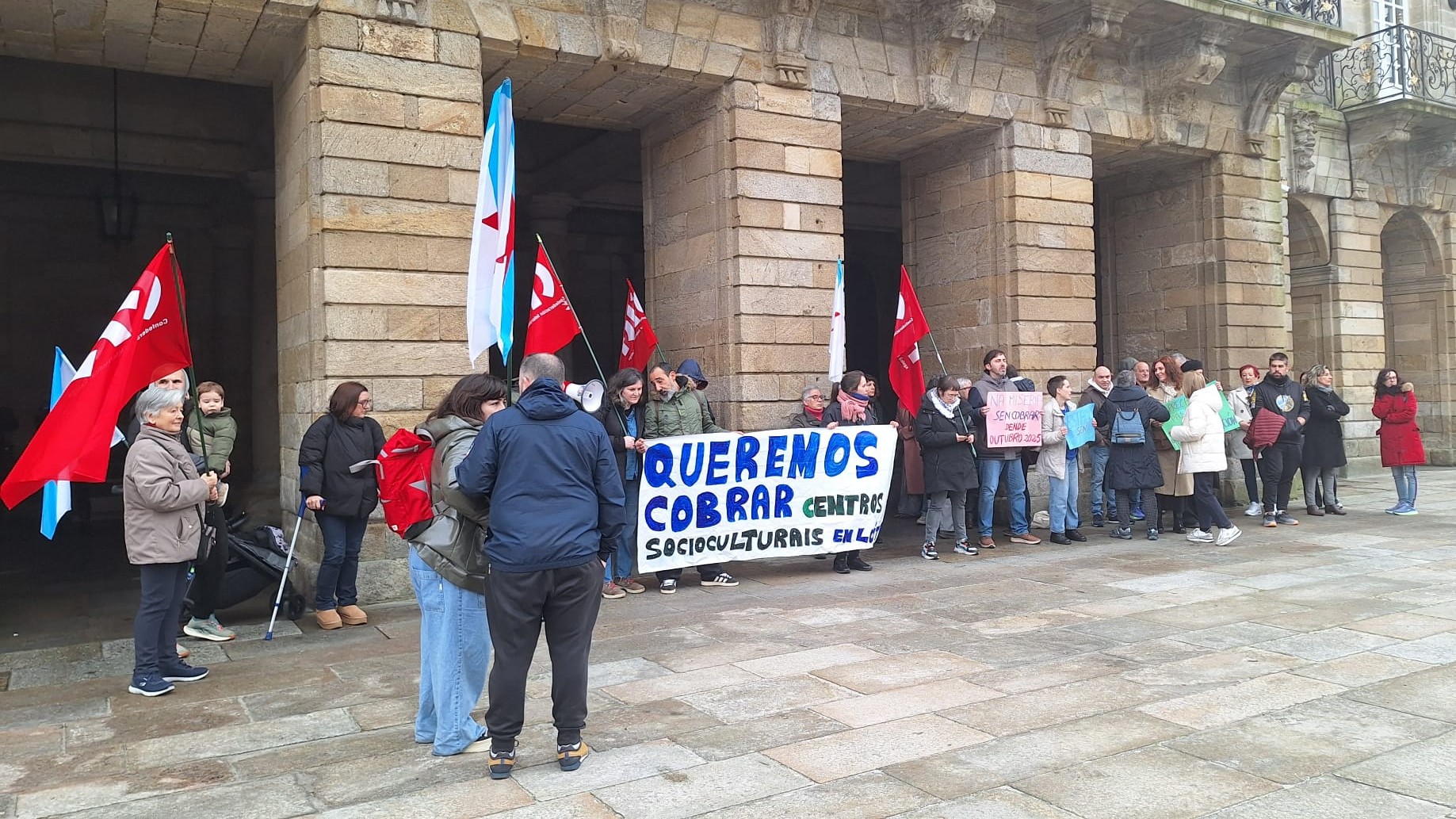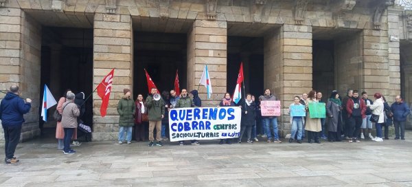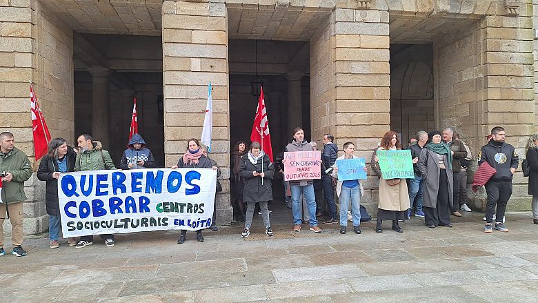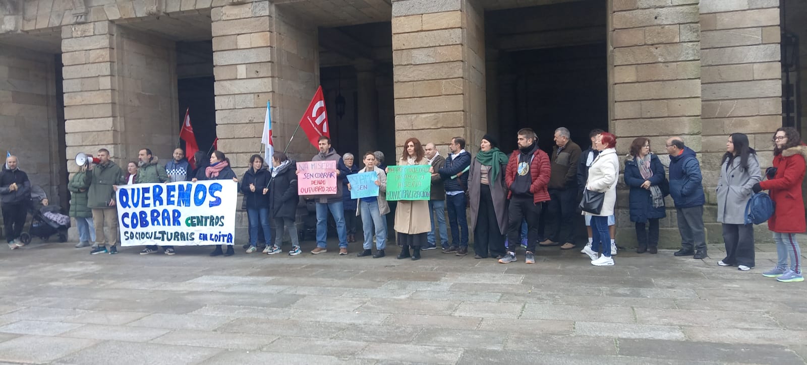 As traballadoras e traballadores da rede de centros socioculturais de Santiago de Compostela concentráronse estes xoves diante do Pazo de Raxoi para demandar respostas e solucións inminentes ante a complexa situación laboral e económica na que se atopan, tras permanecer sen cobrar dende o mes de outubro e a decisión de suspender as actividades. Na protesta, que coincidiu coa celebración do pleno municipal, reclamouse tamén información concreta sobre o futuro do servizo .