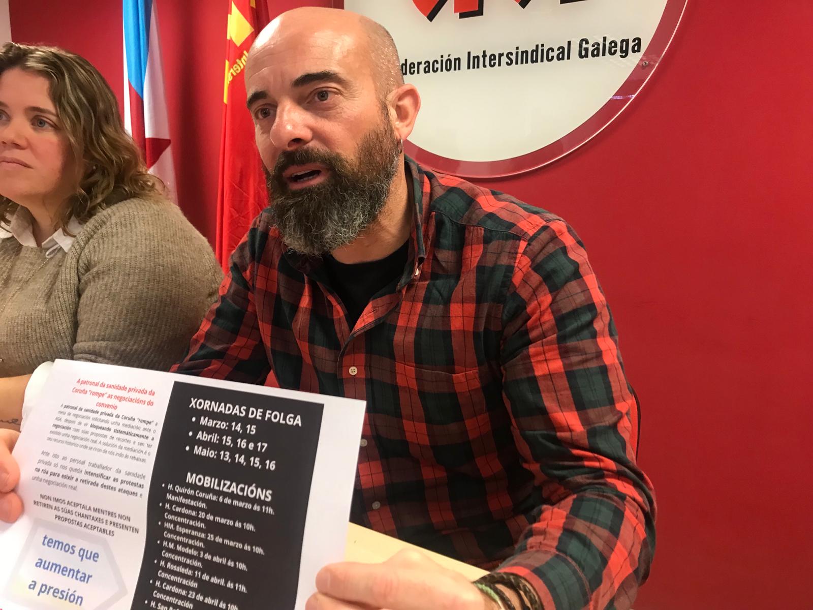 Representantes da mesa de negociación do convenio da sanidade privada da provincia da Coruña da CIG, CCOO e UGT compareceron esta mañá en rolda de prensa para anunciar a convocatoria de novas xornadas de protesta e de folga. Denuncian que a patronal, tras meses bloqueando a negociación coas súas propostas de recorte e sen ter existido unha negociación real, rompeu a mesa e solicitou unha mediación no AGA que rexeitan “mentres non retiren as súas chantaxe e presenten propostas aceptables”.