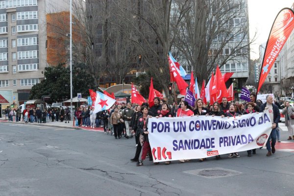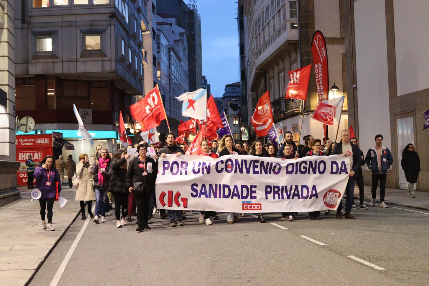 As traballadoras e traballadores da sanidade privada da provincia da Coruña están secundando este xoves de xeito masivo a cuarta xornada de folga para reclamar un convenio digno. Para dar máis visibilidade á súa loita, o persoal mobilizouse pola mañá en Compostela e realizou unha manifestación pola tarde na cidade da Coruña.