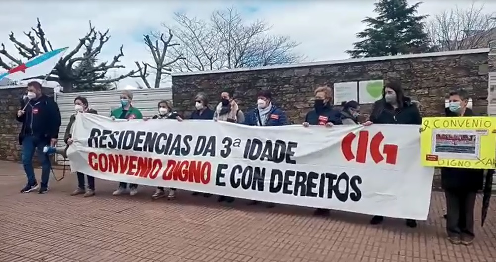 As traballadoras e traballadores de residencias privadas da terceira idade e centros de día privados continúan adiante co calendario de mobilizacións no marco da folga indefinida convocada por CIG, CCOO e UGT en demanda dun convenio colectivo. Ante os abusivos servizos mínimos decretados pola Xunta do 100%, que na práctica imposibilitan o exercicio do dereito fundamental á folga, para darlle visibilidade á súa loita o persoal está realizando concentracións diarias en diferentes residencias de todo o país.