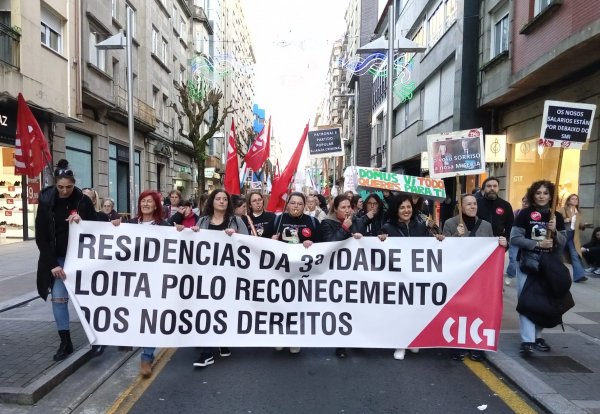 O persoal das residencias da terceira idade privadas continuou hoxe en Pontevedra coa intensa campaña que está a desenvolver ao longo do país para dignificar as súas condicións laborais. Unha nova manifestación convocada pola CIG-Servizos percorreu hoxe as rúas da cidade ao berro de “Non somos escravas, somos traballadoras” en demanda de melloras laborais reais no convenio colectivo.