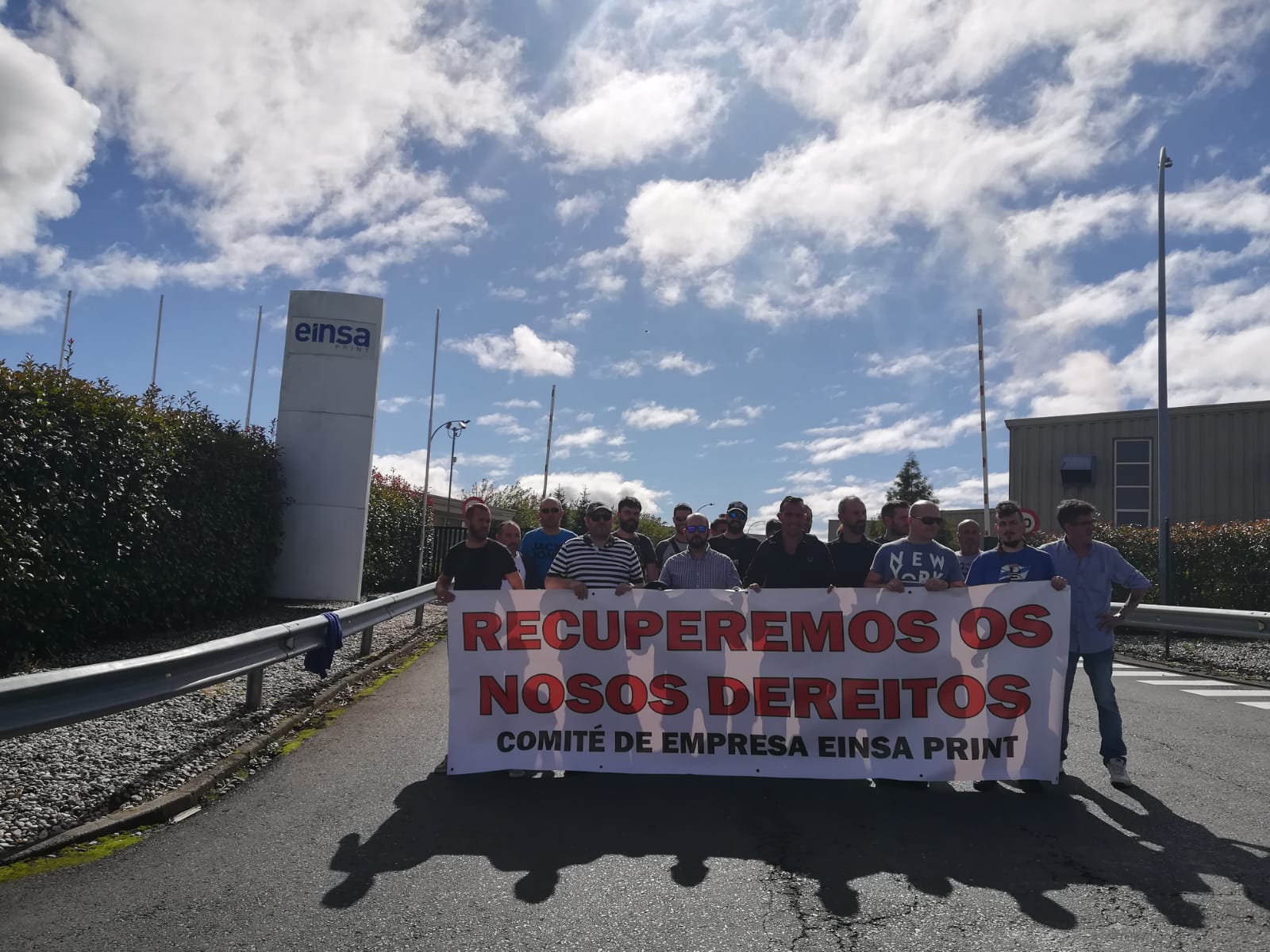 Traballadores e traballadoras de Einsa Print iniciaron este luns un calendario de mobilizacións para esixir da empresa melloras salariais e laborais, que lles permitan recuperar os dereitos perdidos tras doce anos coas condicións conxeladas. As protestas repetiranse o próximo xoves e os día 14 e 17 de outubro, con concentracións de 14 a 16 horas diante das instalacións da planta no Polígono de Penapurreira (As Pontes), coincidindo coas saídas e entradas das quendas de traballo.