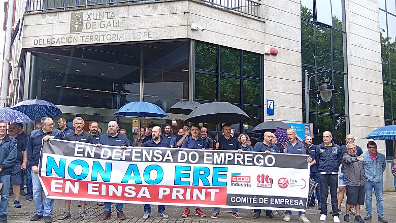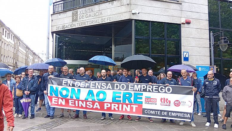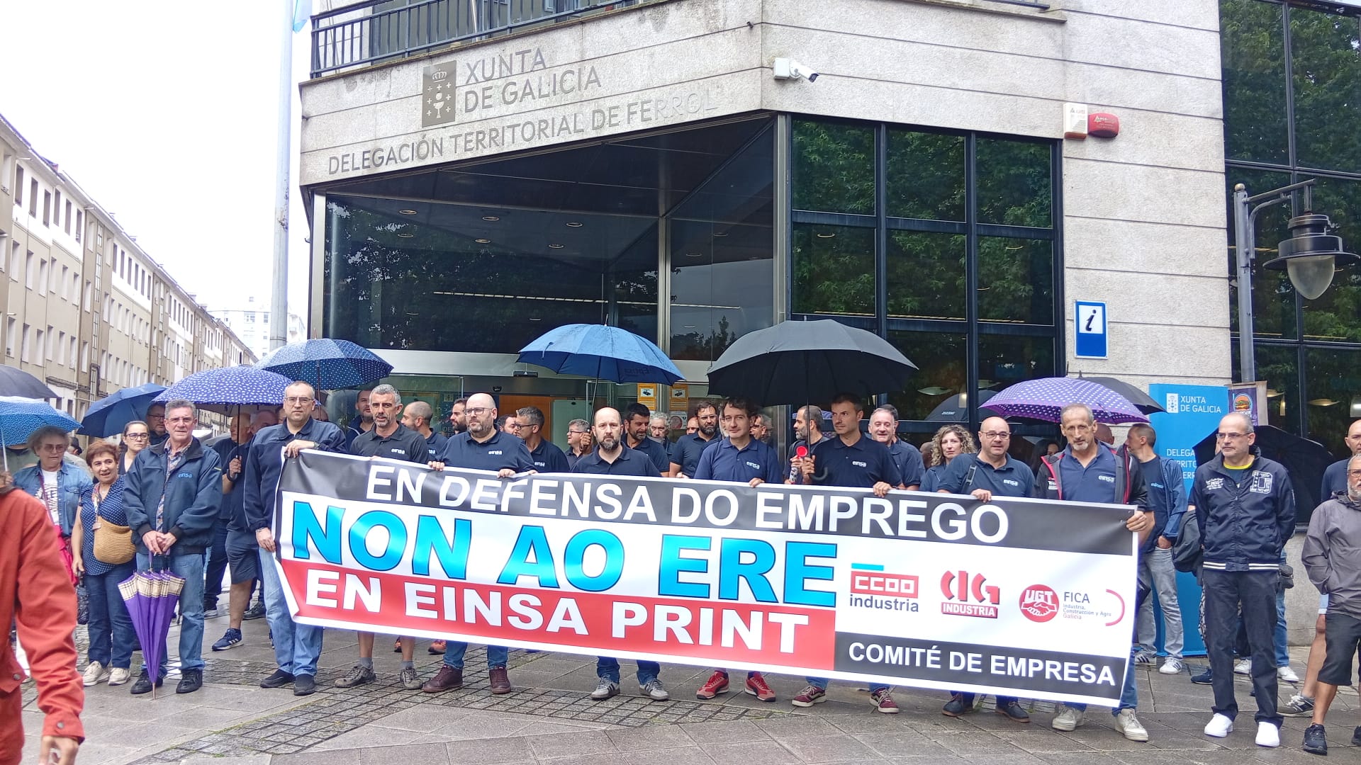 Os traballadores e as traballadoras de Einsa Print concentráronse este mércores diante do edificio da Xunta en Ferrol para amosar o seu rotundo rexeitamento ao novo despedimento colectivo que pretende aplicar a empresa e que suporía o peche da actividade de artes gráficas nas instalacións das Pontes. Na protesta, o persoal aproveitou para demandarlle ao Goberno galego que asuma responsabilidades e actúe para impedir que se materialice esta desfeita laboral que suporía un duro golpe para a localidade.
